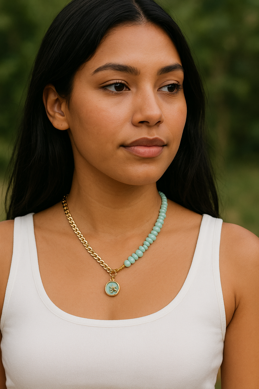 Handmade necklace with stainless steel charm.