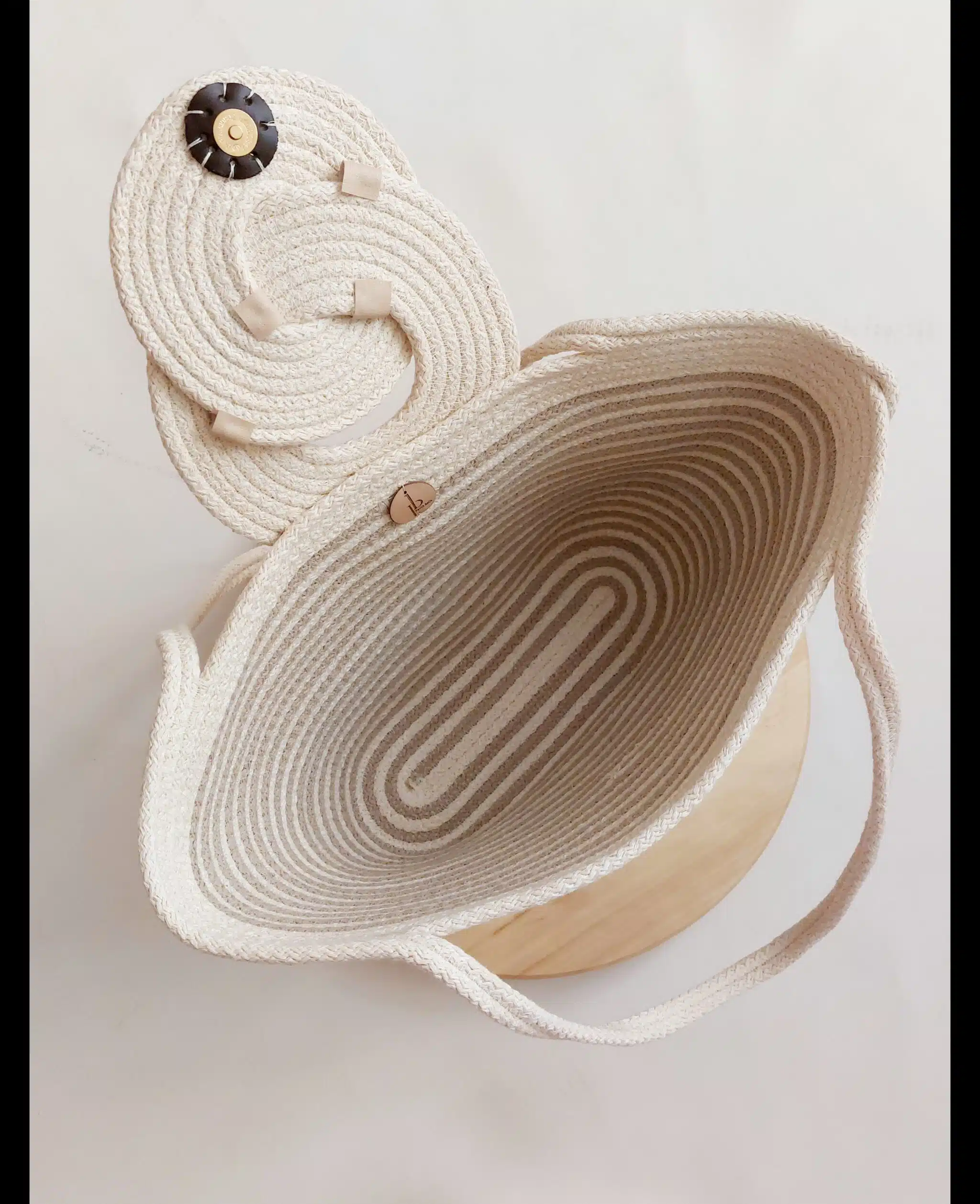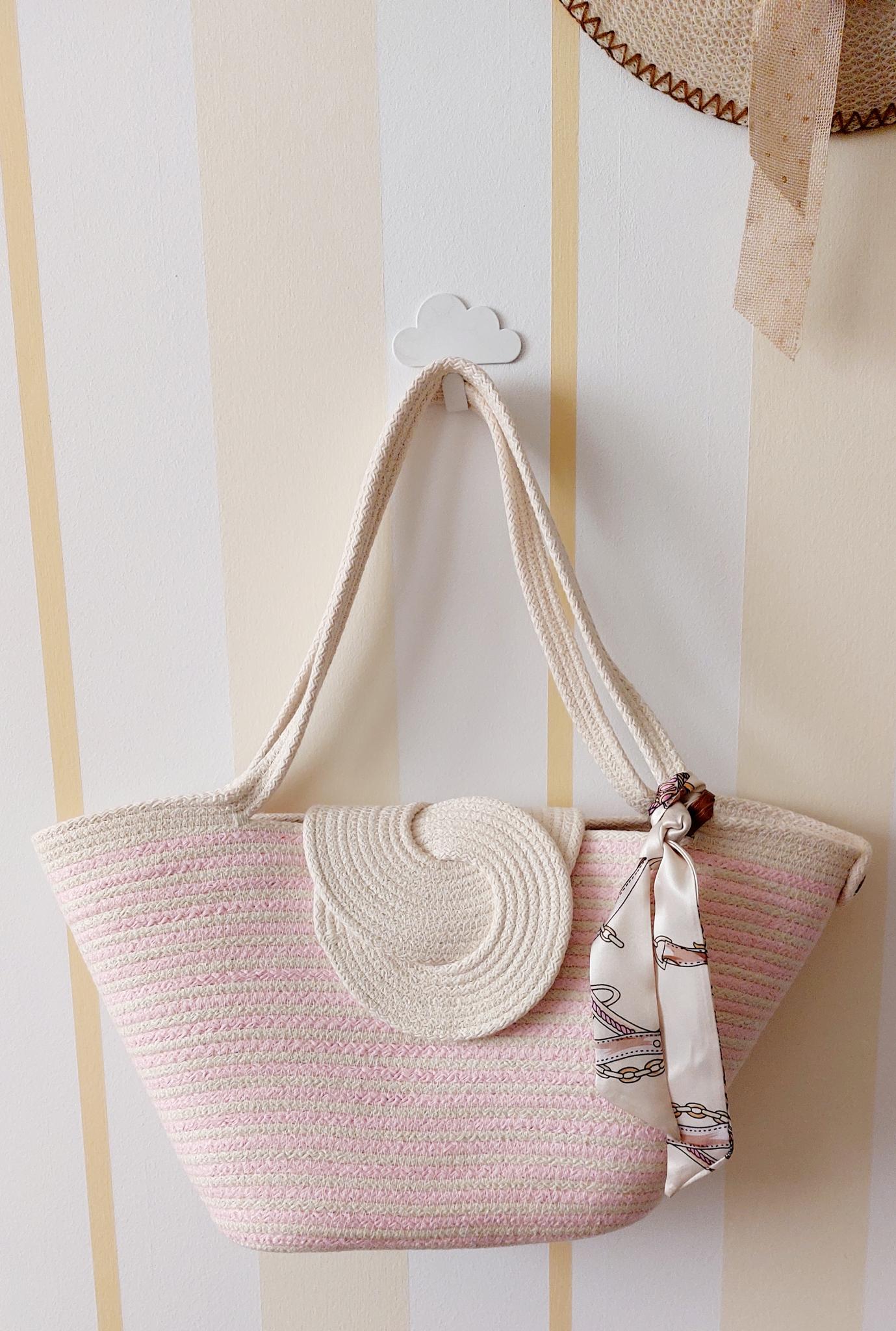 “A handcrafted cotton cord bag with beige and off-white horizontal stripes, featuring a twisted handle and a decorative spiral flower accent on the front, displayed against a light background with a wooden round prop.”