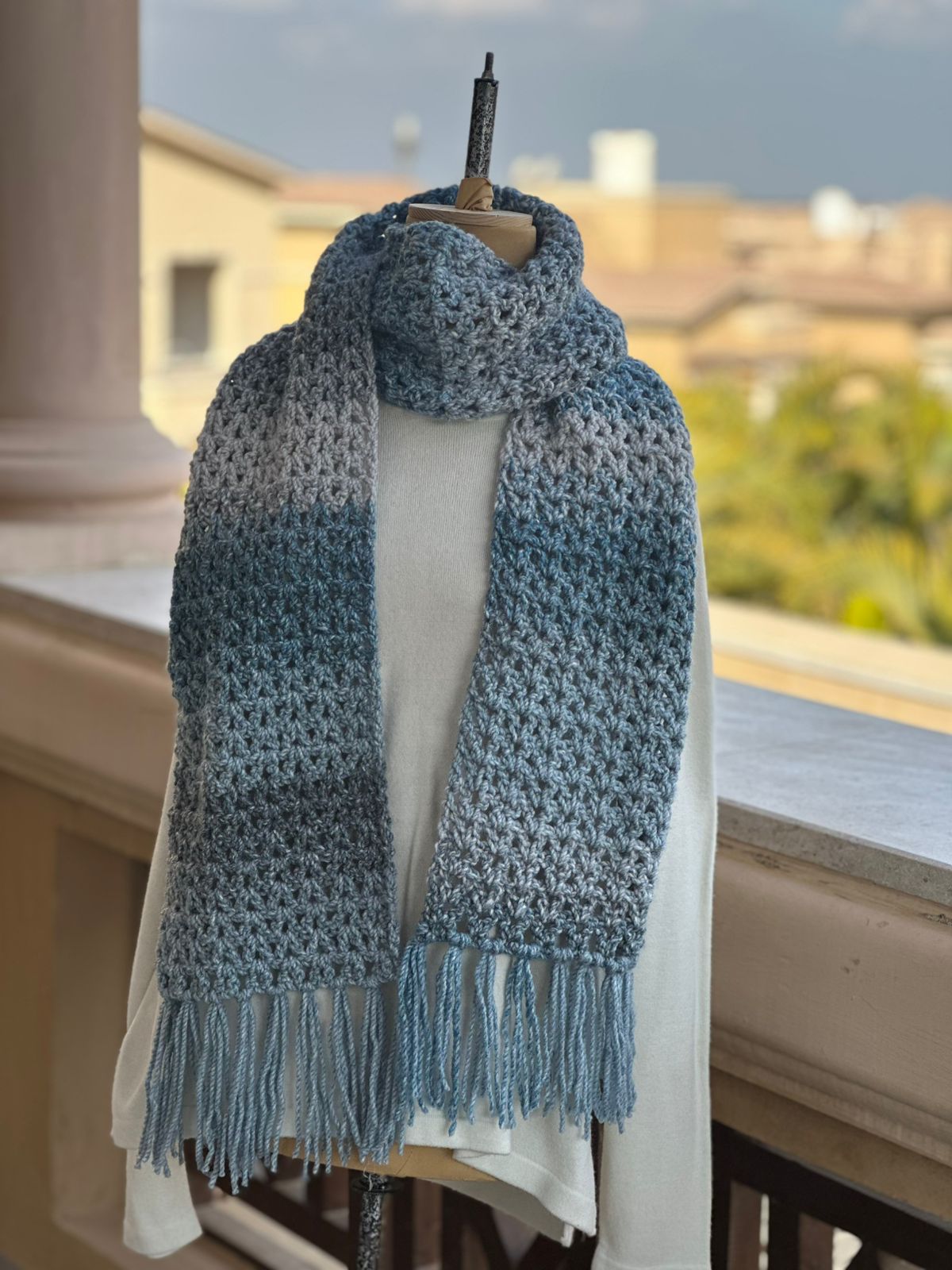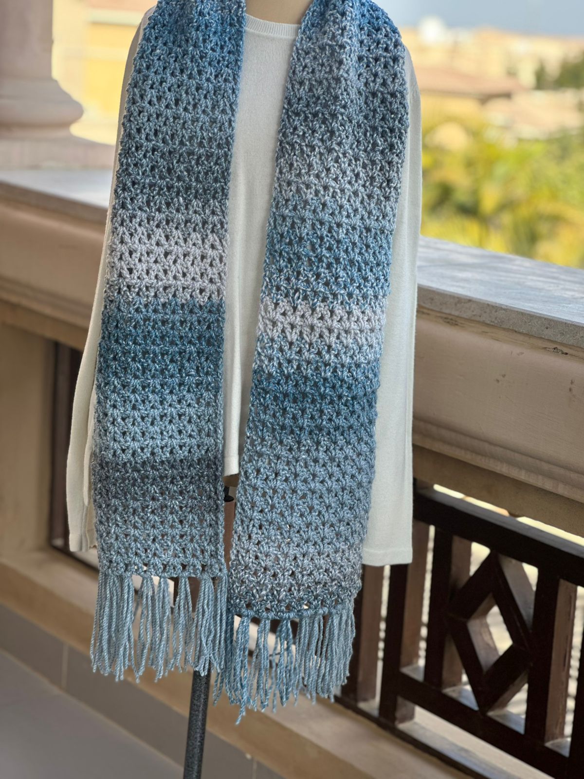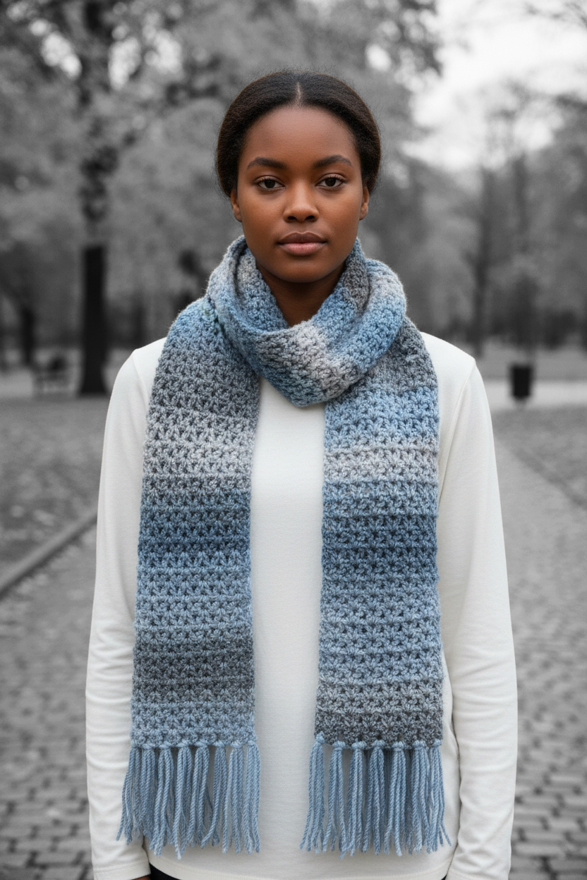 A soft hand-crocheted scarf in calming shades of blue and grey, finished with delicate fringe. Lightweight yet warm, perfect for effortless everyday layering.