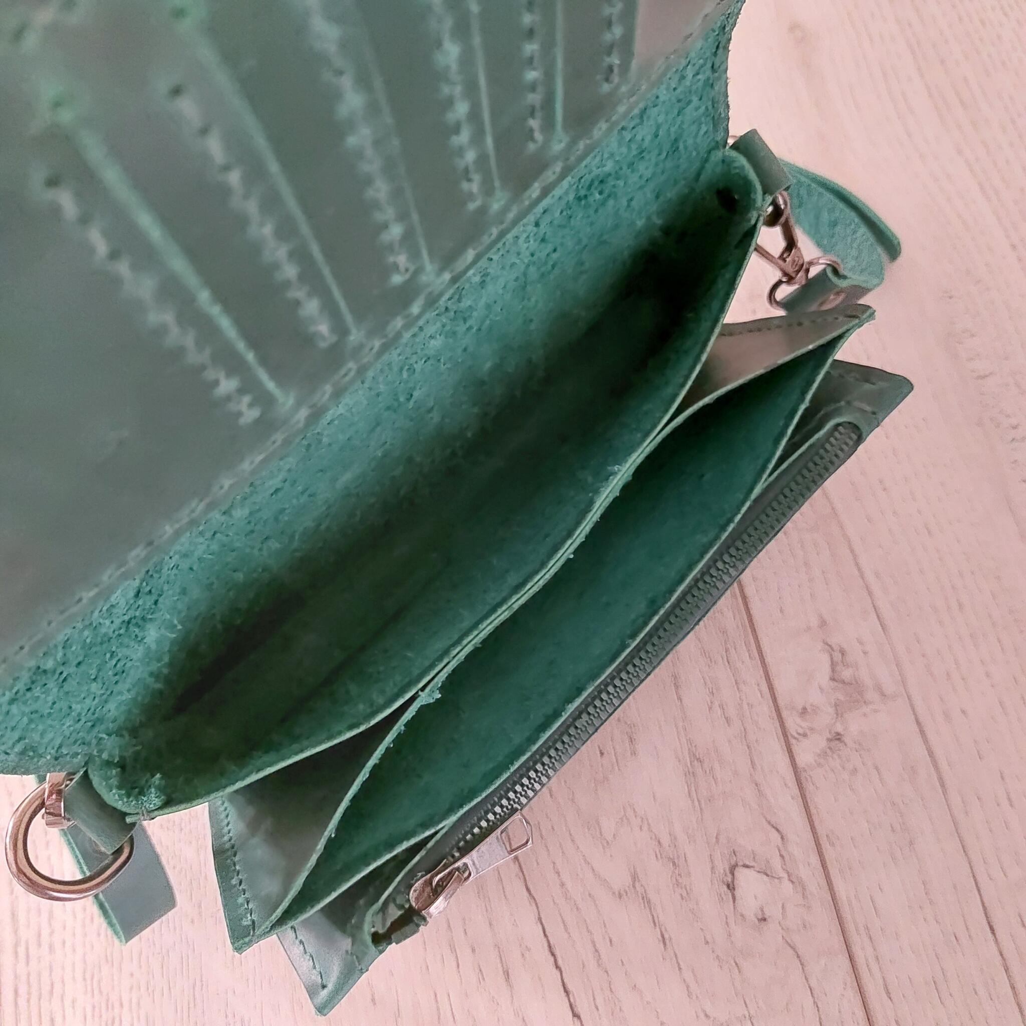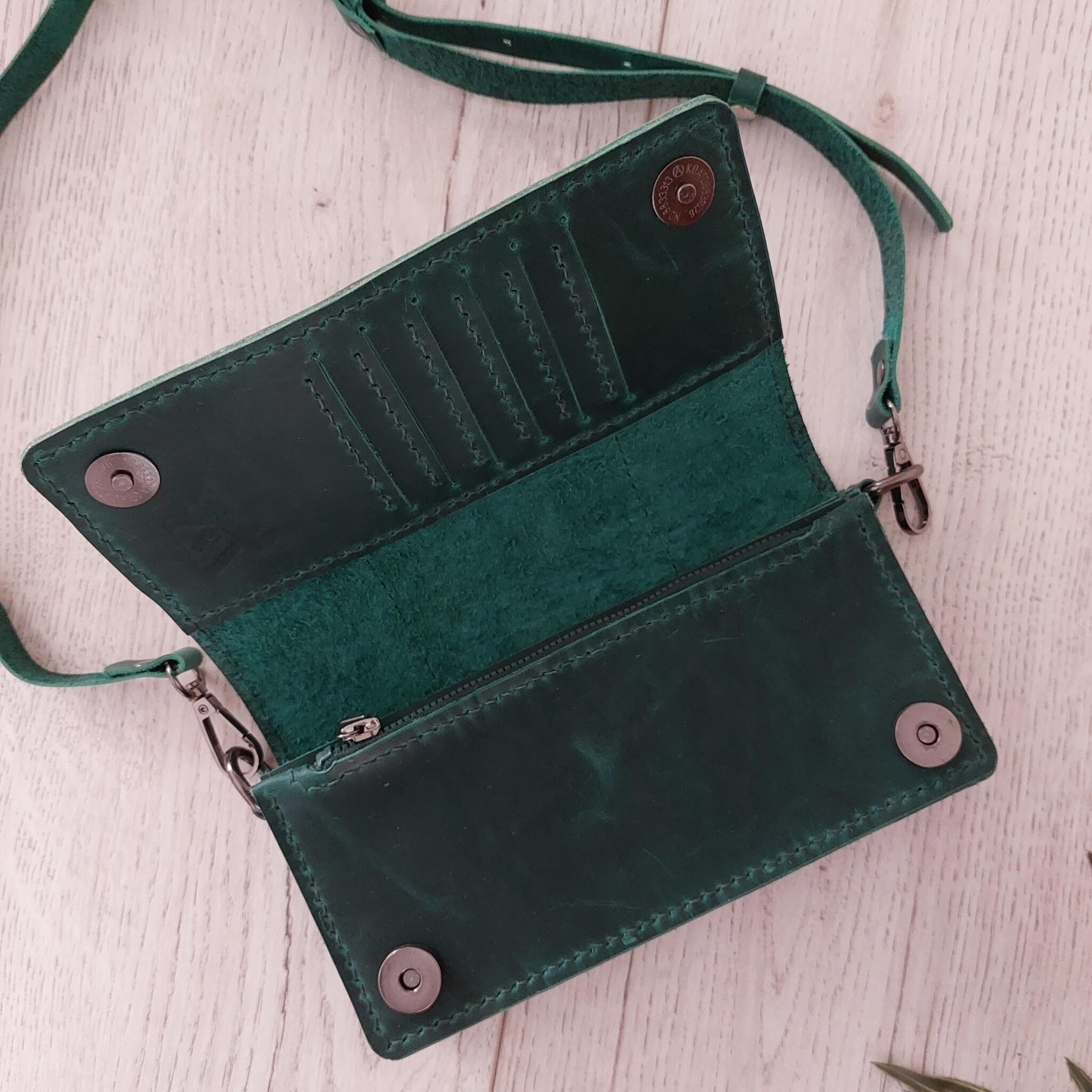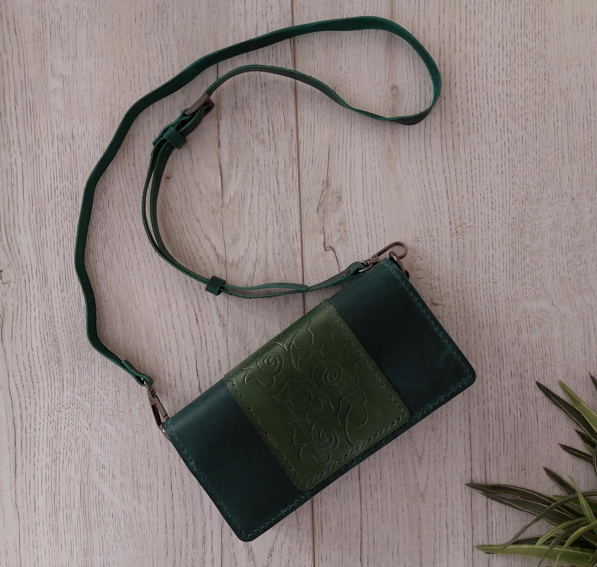 بورتوفيه جلد طبيعى هاند ميد لون أخضر عليه رسمة حفر على الجلد يحتوى على جيب للموبايل والمفاتيح وجيب للعملة الورقية وجيب بسوستة و٦ اماكن للكروت مقاس ٢٠سم ×١٢سم