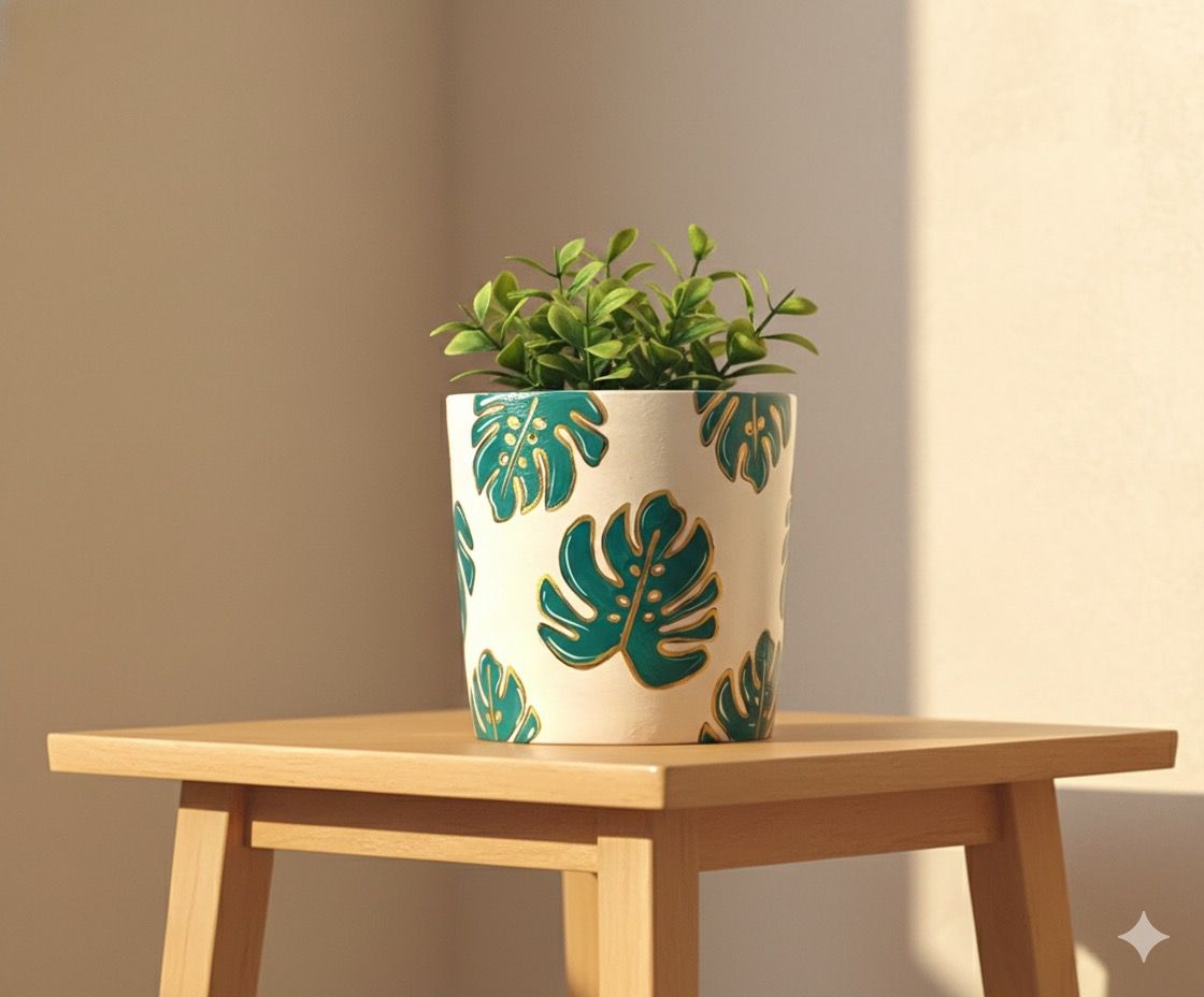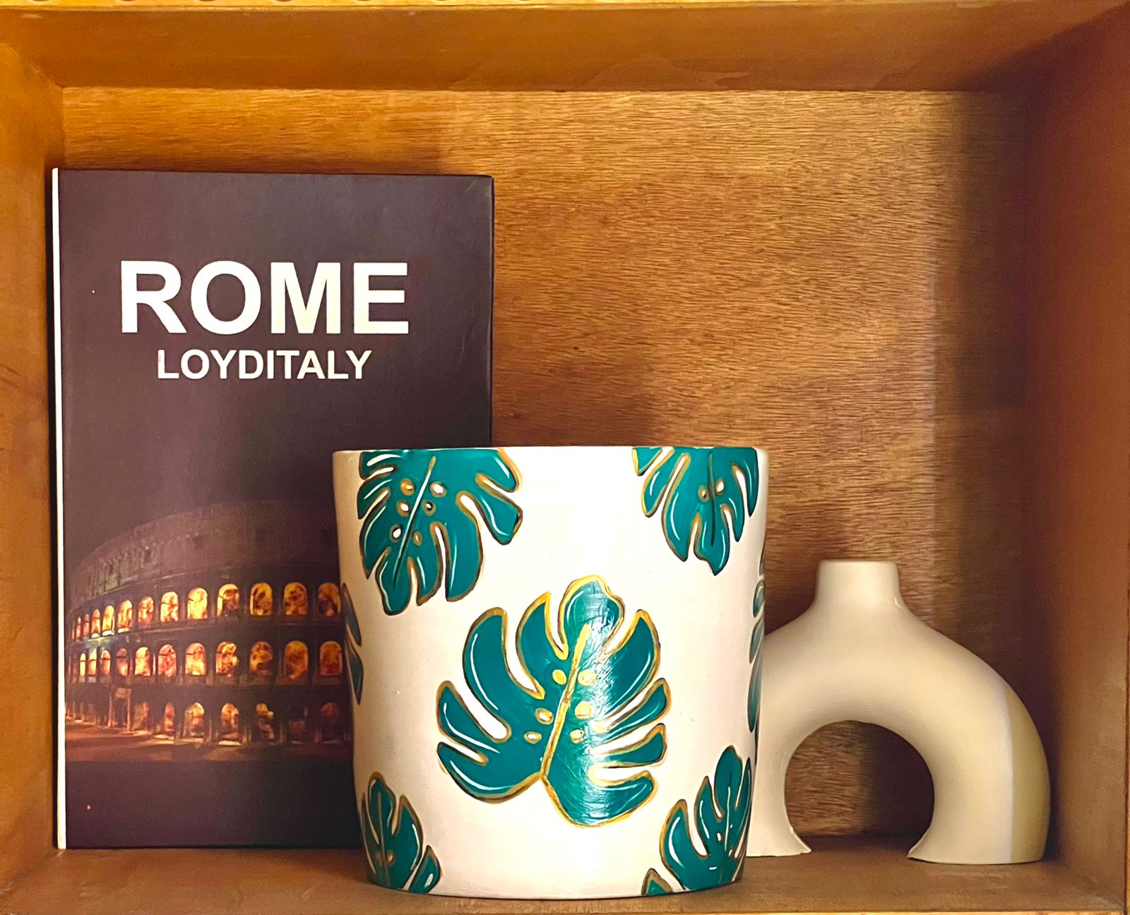 This planter adds a luxurious, tropical flair to your indoor garden. It is 100% hand-painted with vivid acrylic colors, featuring an elegant Monstera leaf pattern in deep emerald green with gold outlining.