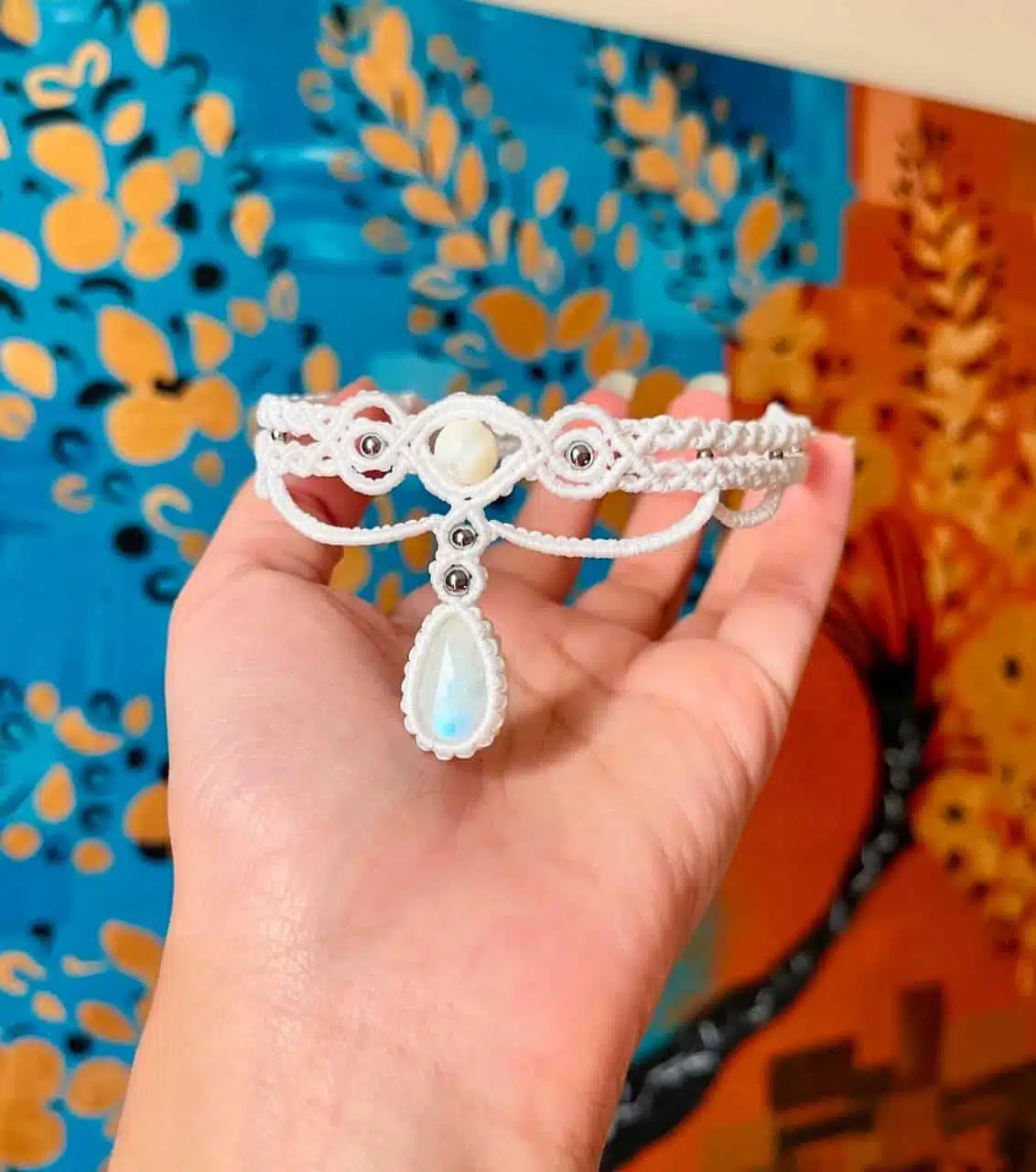 A Handmade adjustable necklace created with Moonstone, mother of pearls main beads and hematite surrounded by white cords.