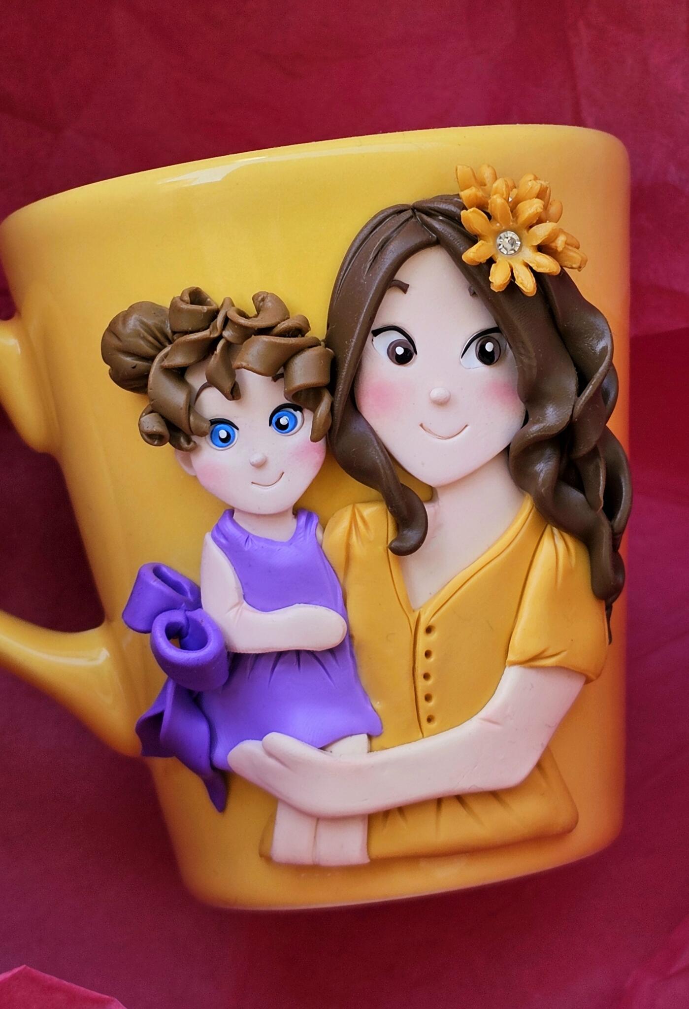 Porcelain mug with a design made of polymerclay