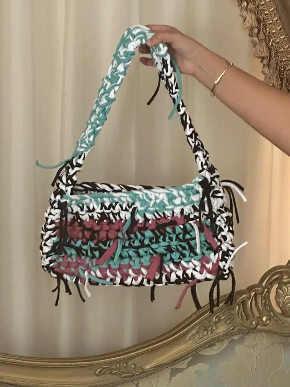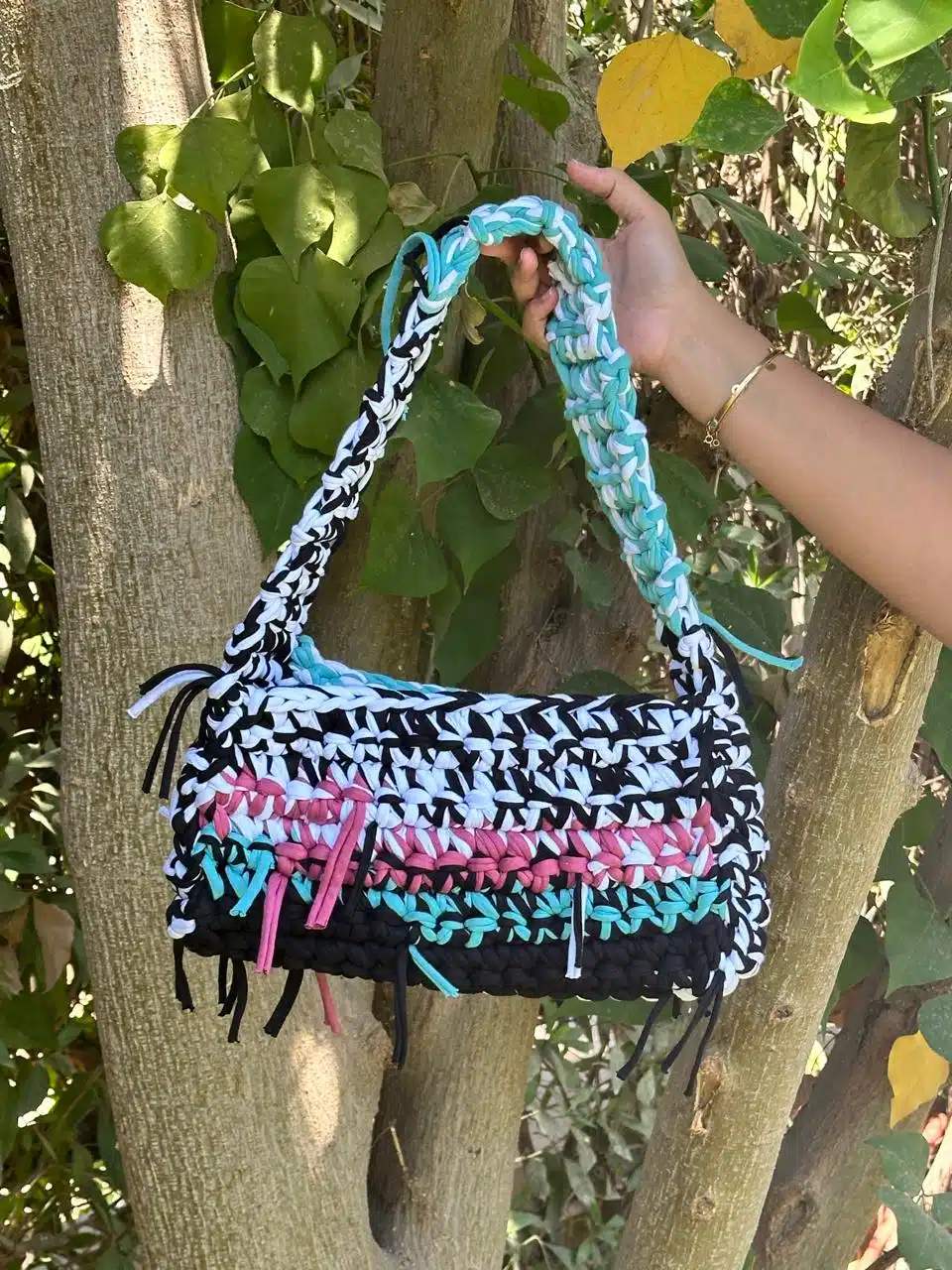 Trendy multicolored crochet shoulder bag,made of t-shirt yarn ,would be great if styled with jeans