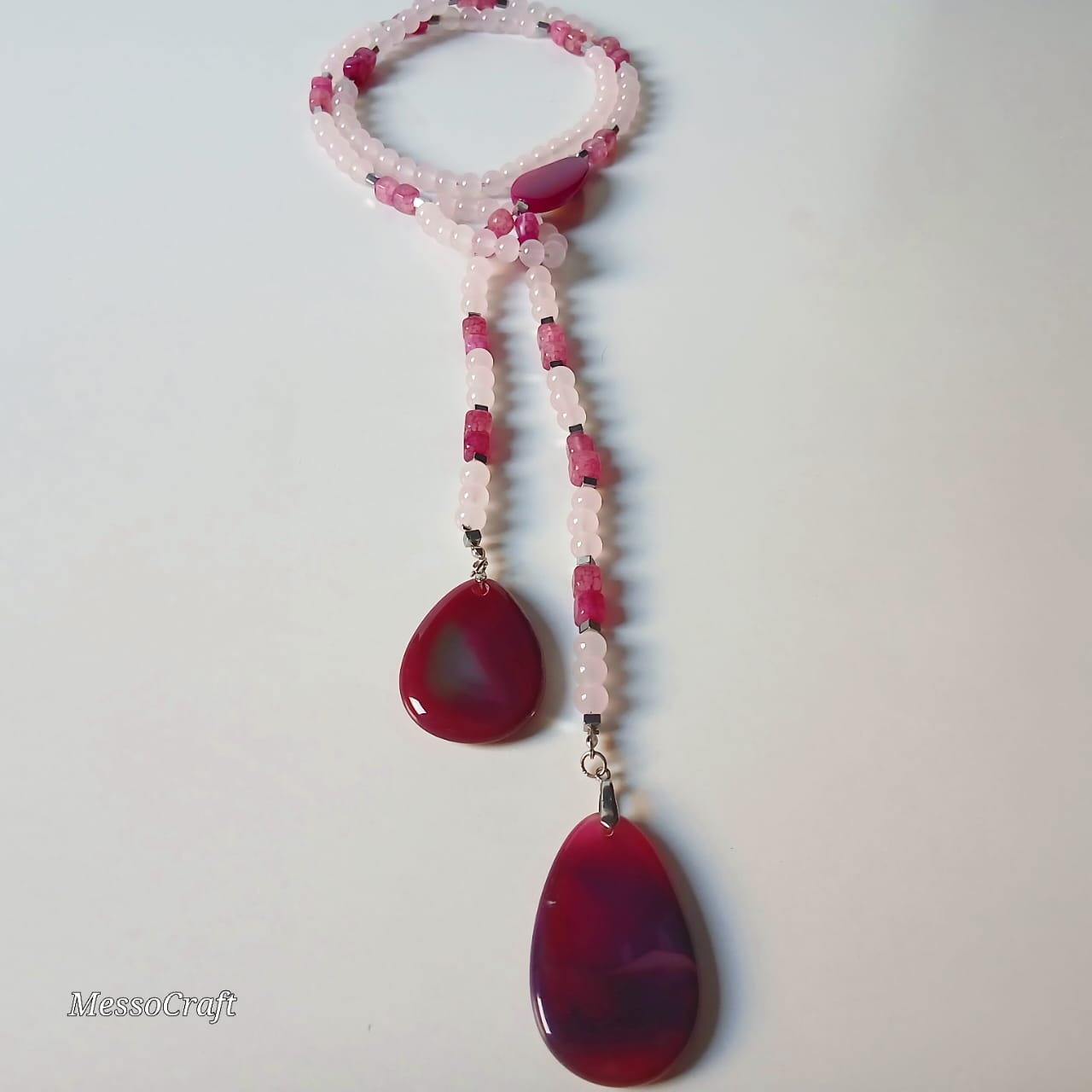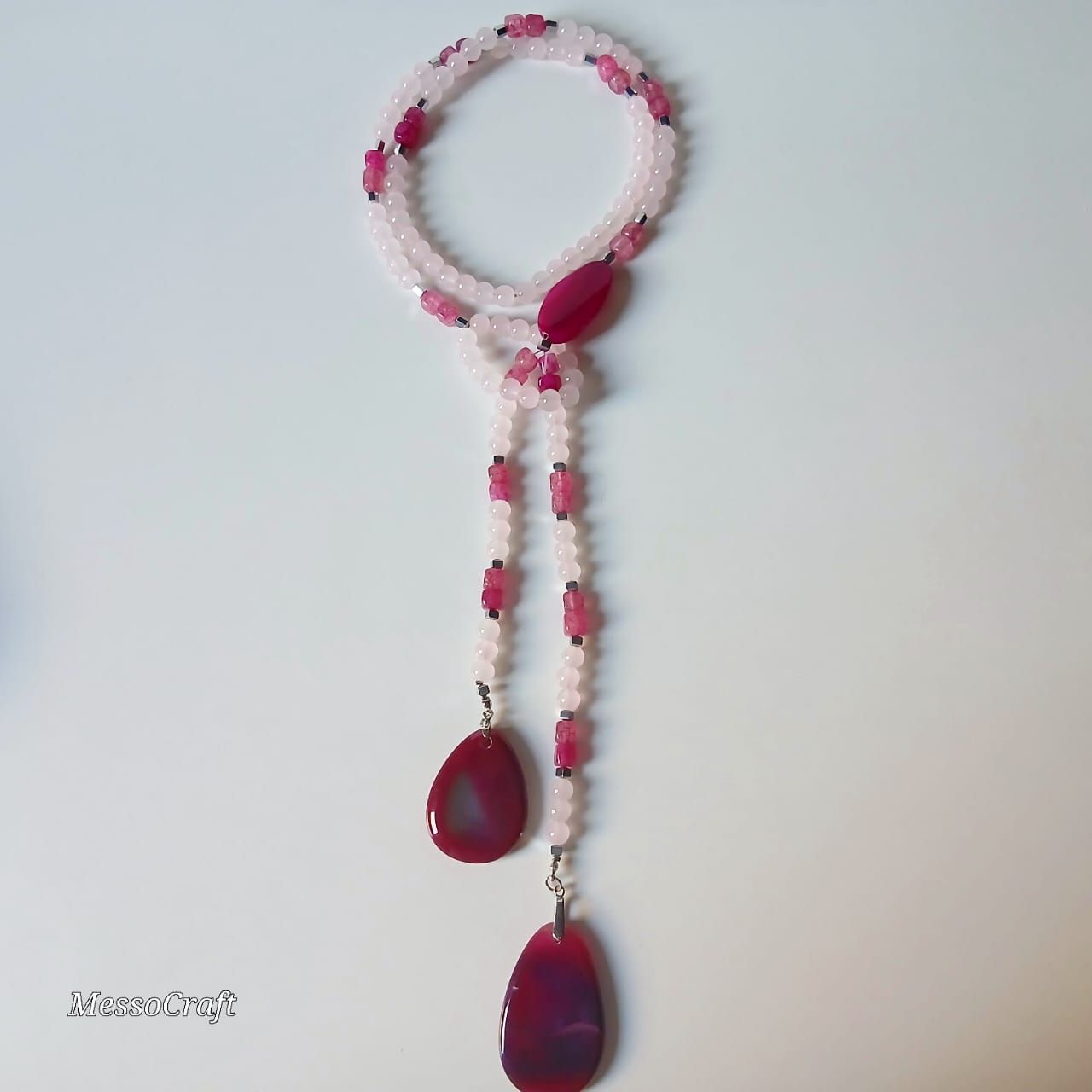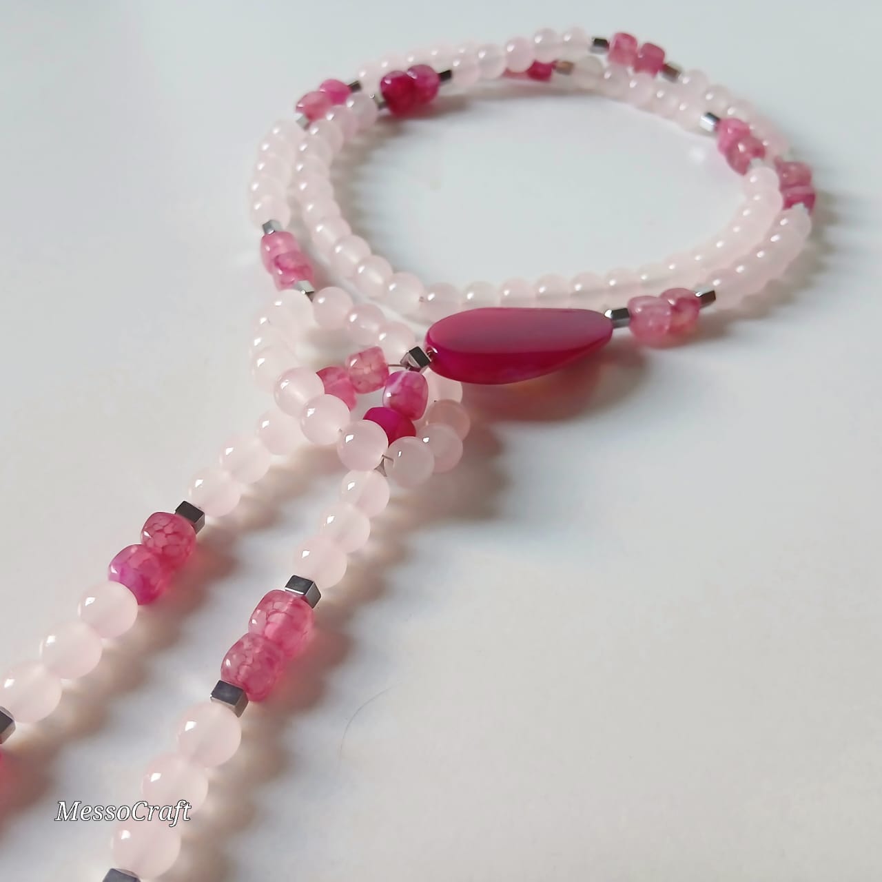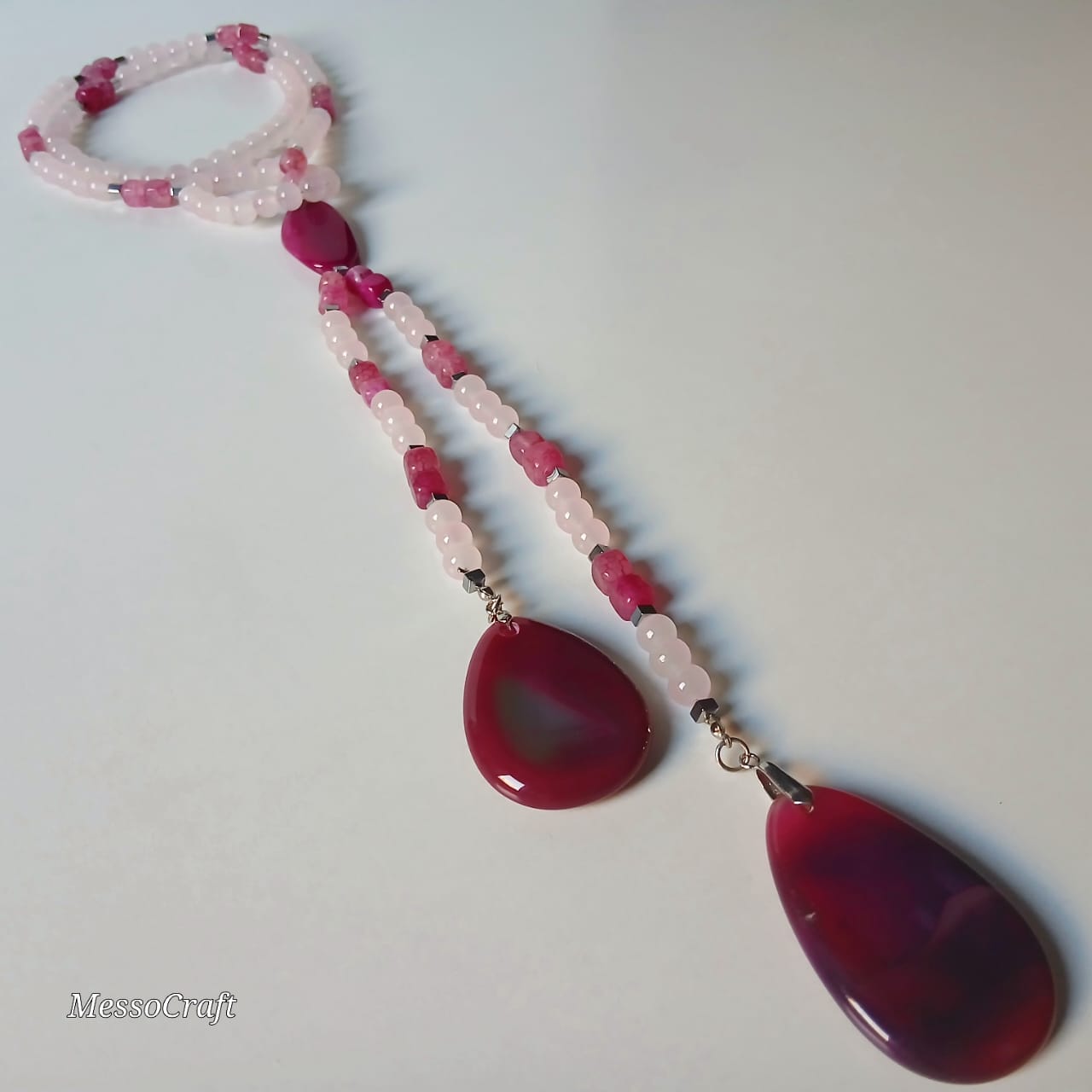 A Multiwear Statement necklace made of dark fuschia square agate stone beads in blue and baby rose alabaster stone beads and silver hematite beads and 3 big dark fuschia gemstones.
