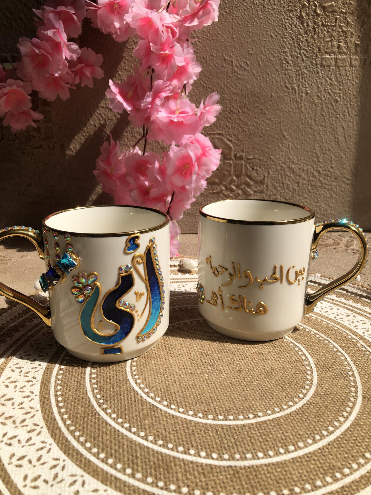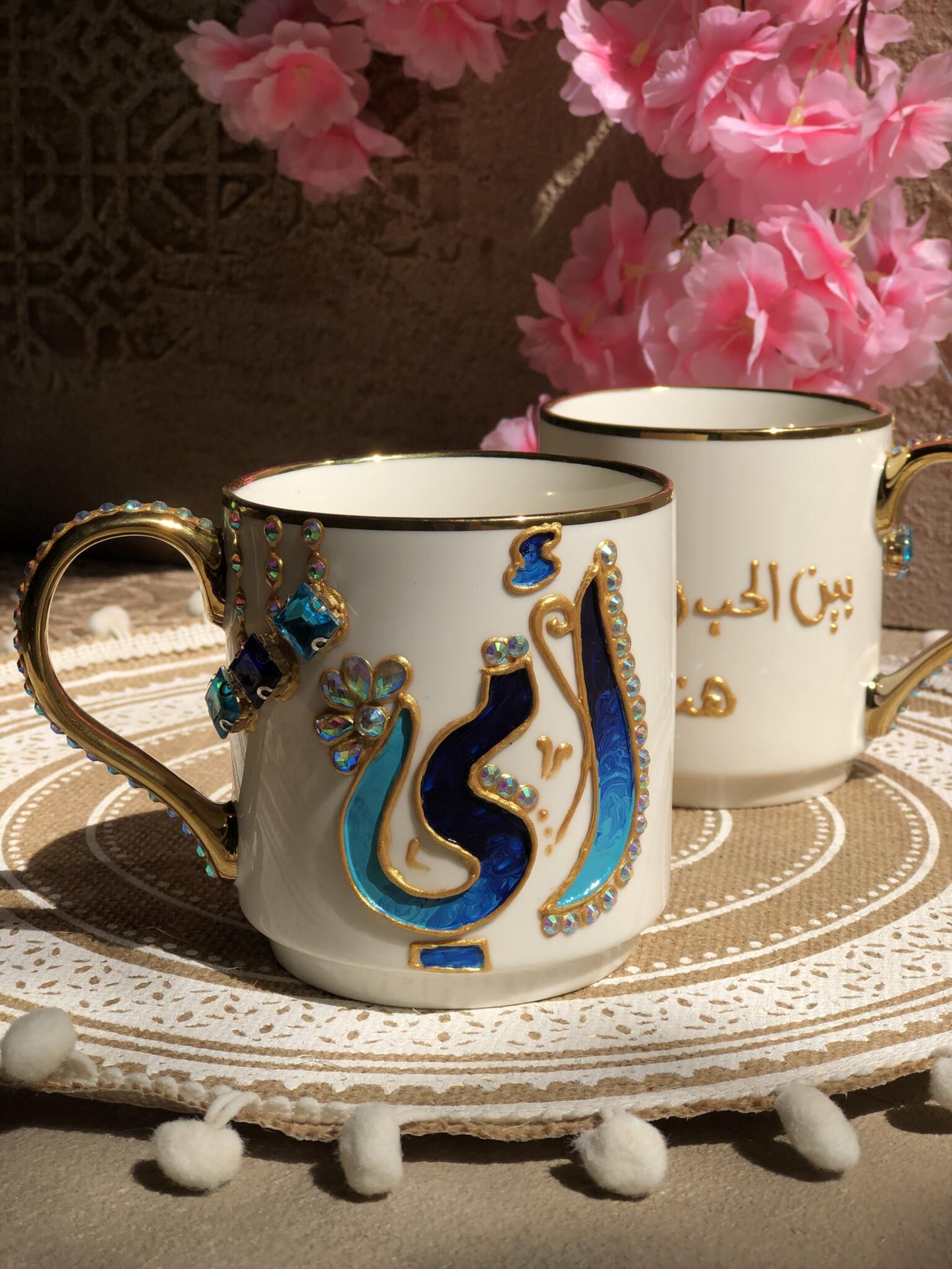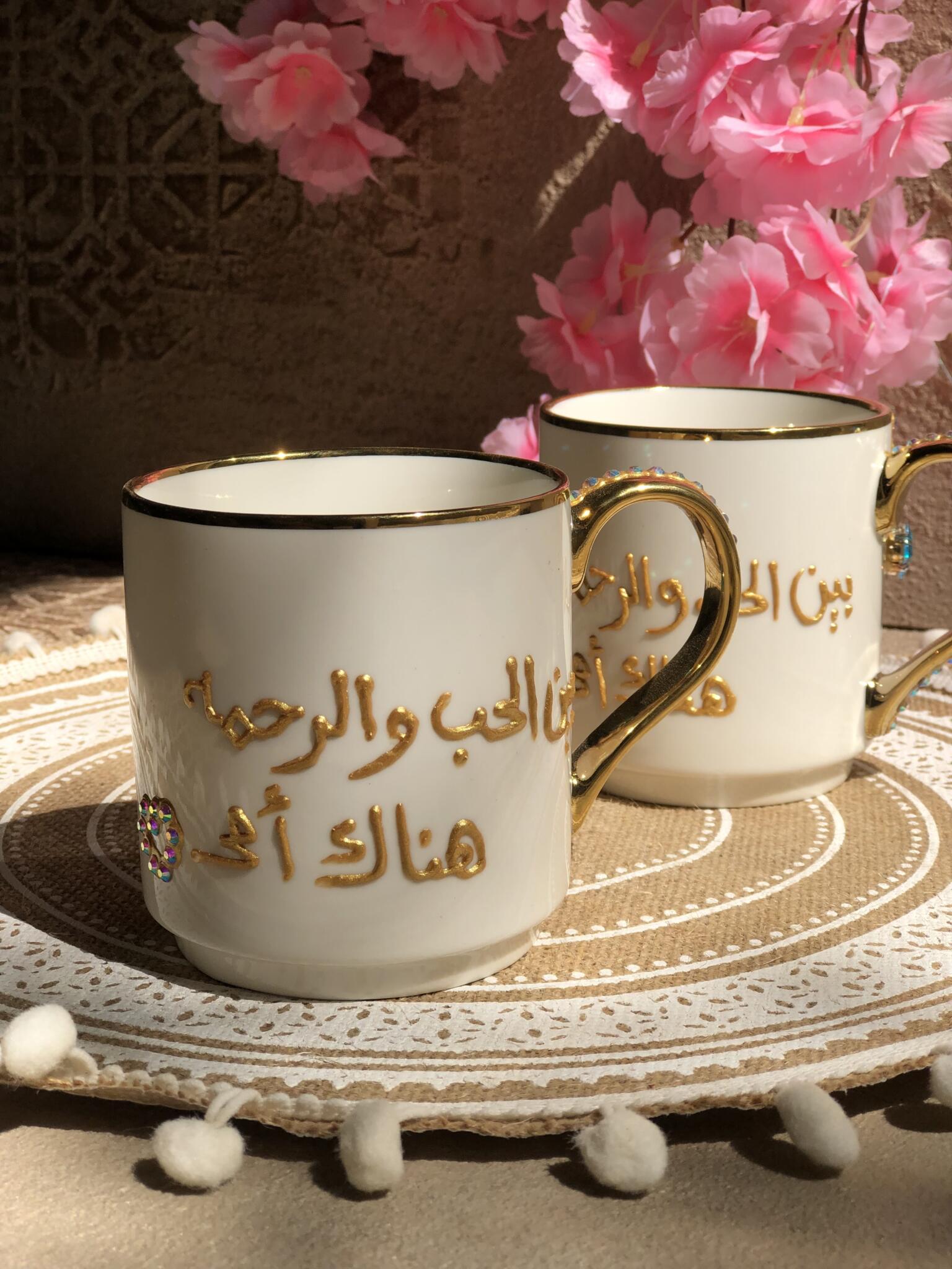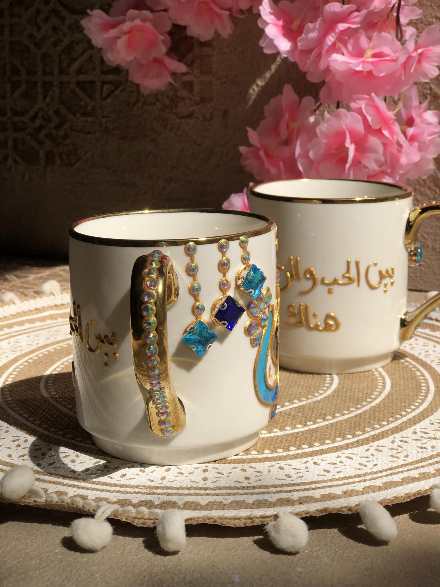 Hand painted Arabic أمي mug, with (بين الحب والرحمه هناك امي ) adorned with gold details and sparkling gemstones