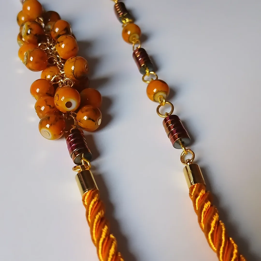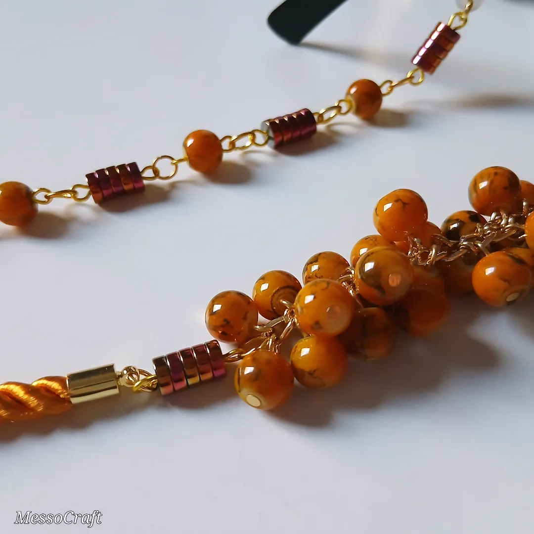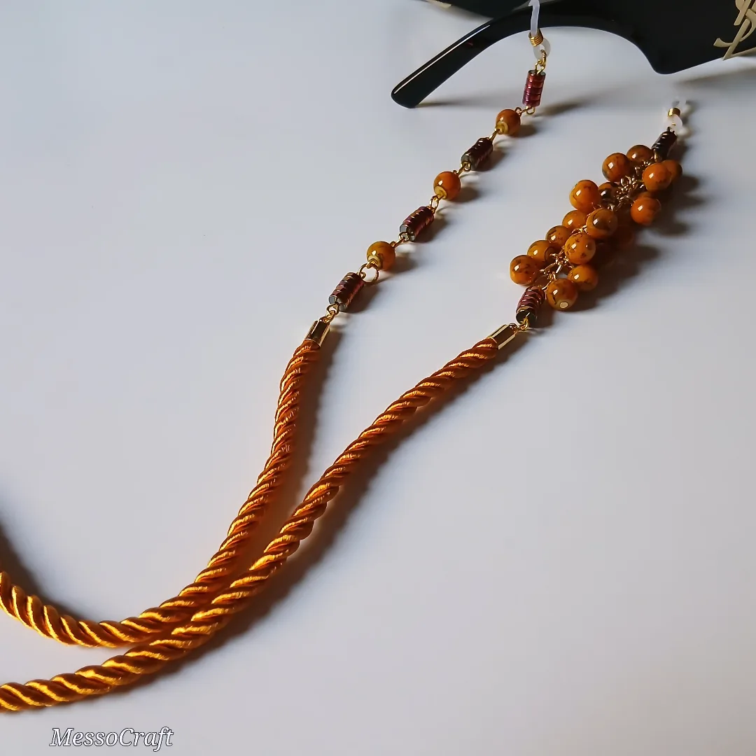 A glasses chain made of mustard copper alabaster stones beads and iridescent hematite beads and a mustard copper cordon cord