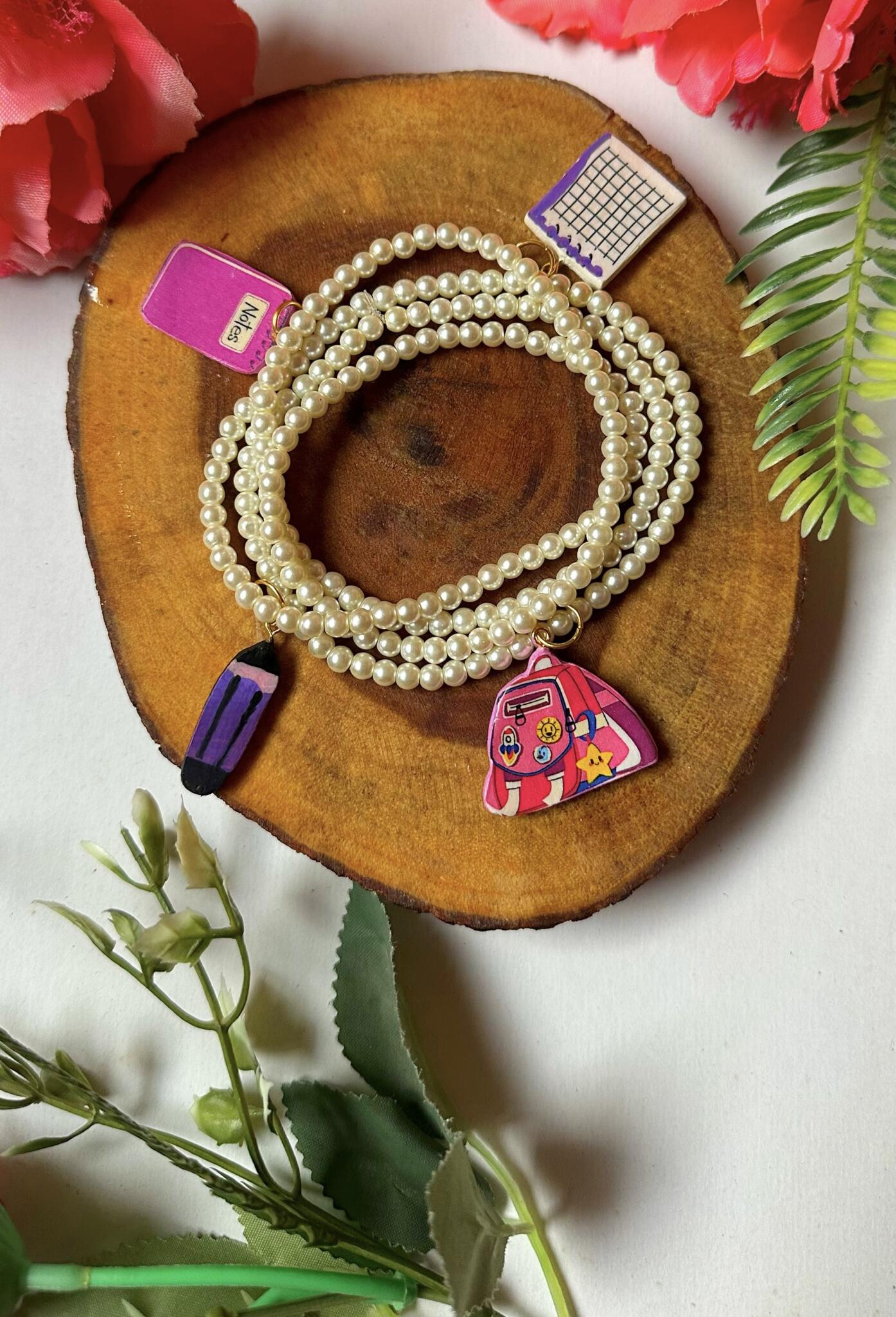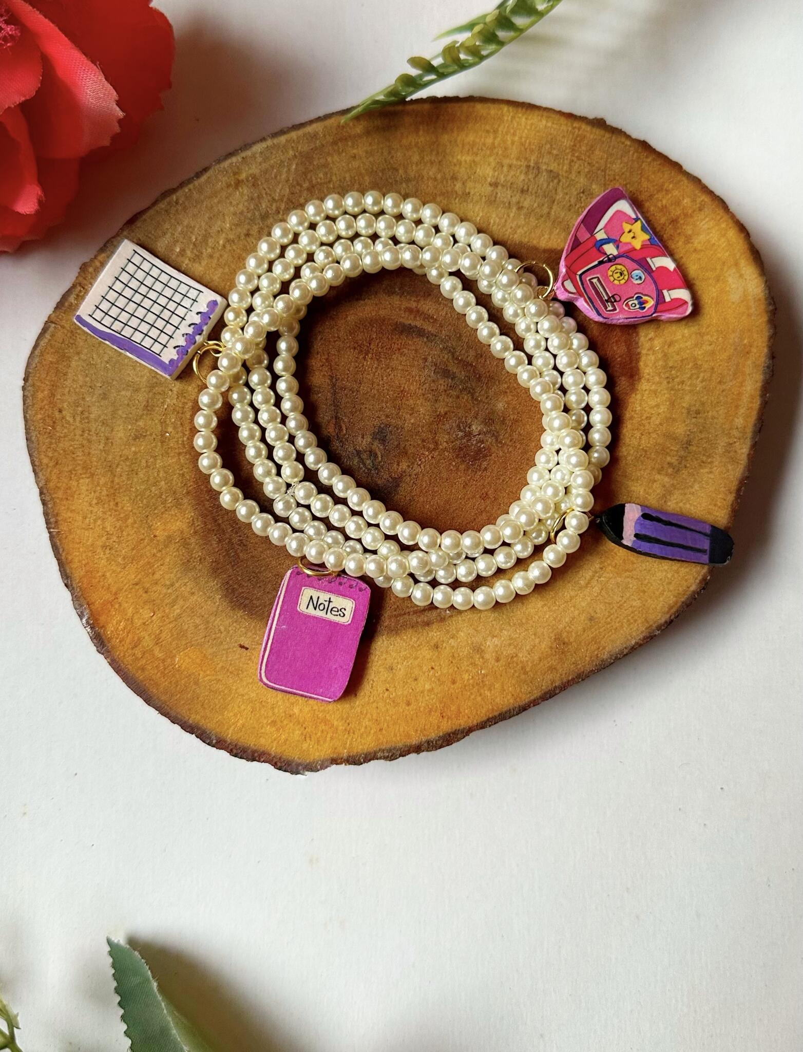 Set of 4 pearl bracelets decorated with 4 handmade school charms, a perfect mix of elegance and playful Back to School vibes.