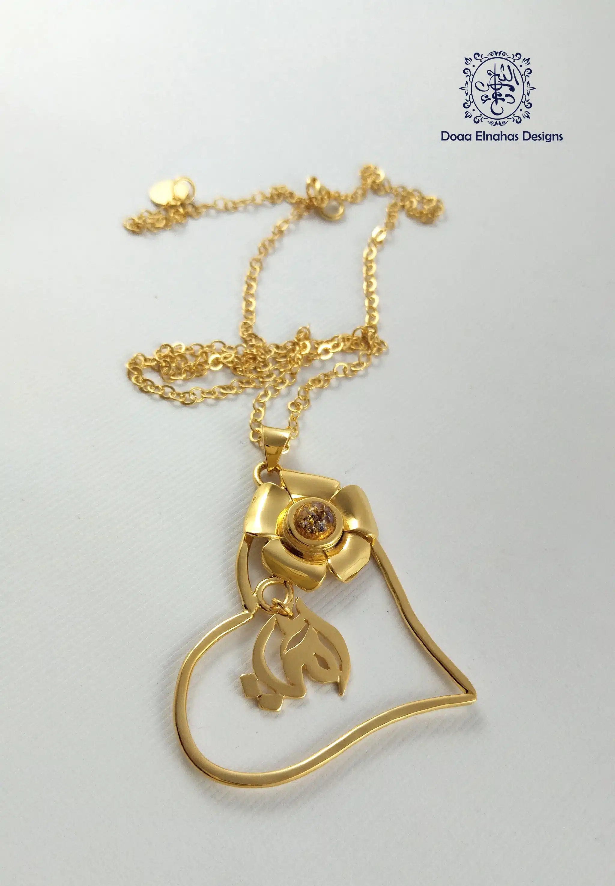 Gold-plated brass necklace with a heart shape pendant with Arabic calligraphy “أمي”