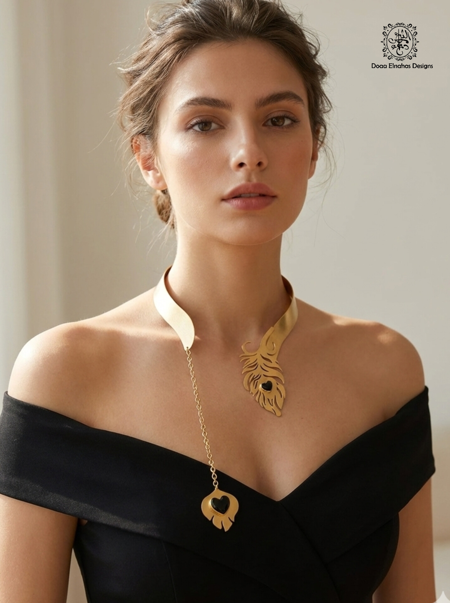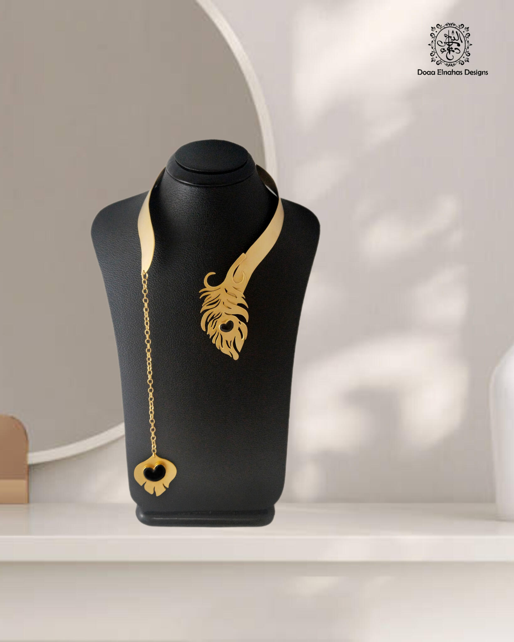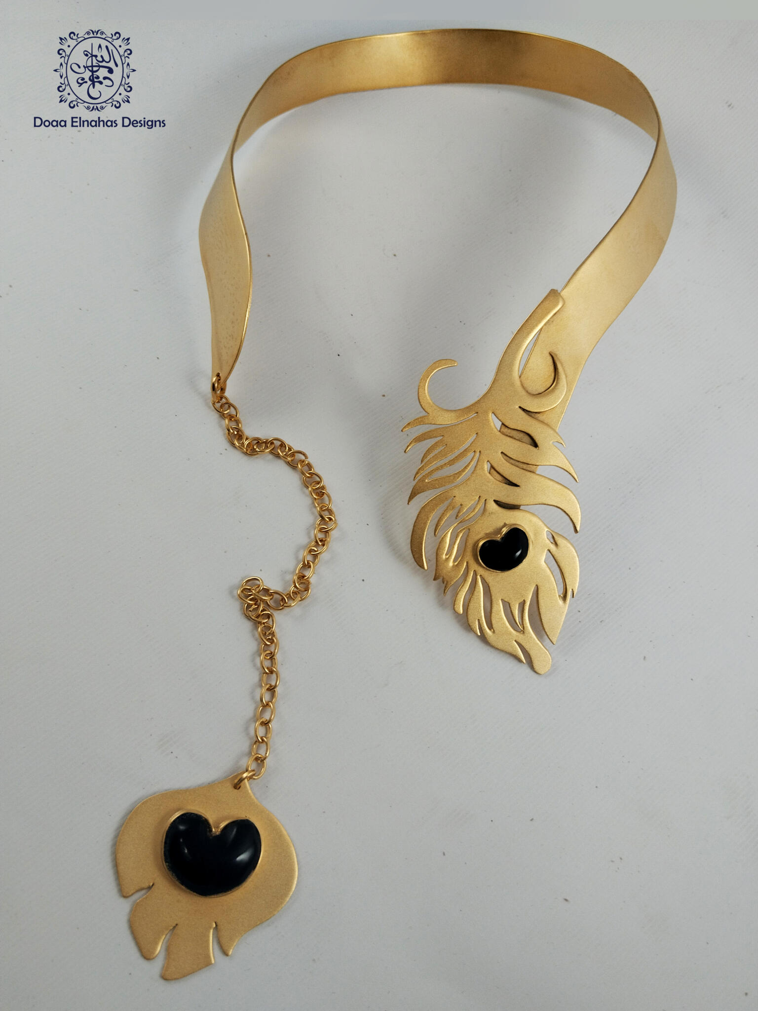 Gold-plated brass peacock feather collar (Matte) with Onyx stones