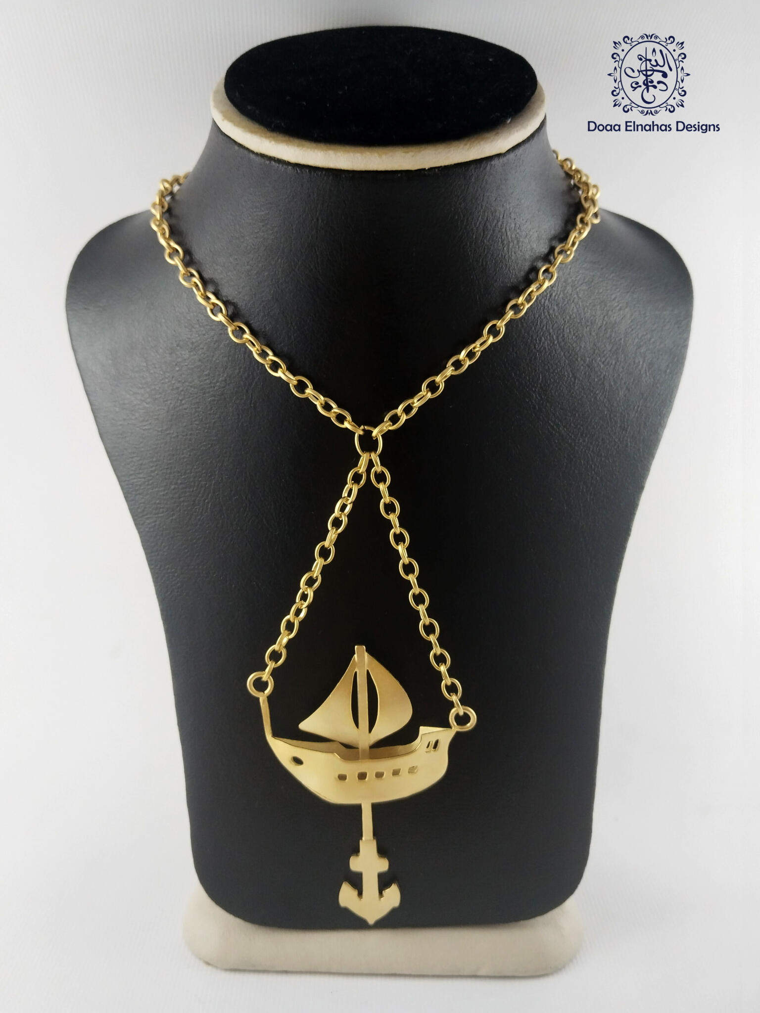 Gold-plated brass sailboat necklace, with a movable pendulum anchor (Matte)