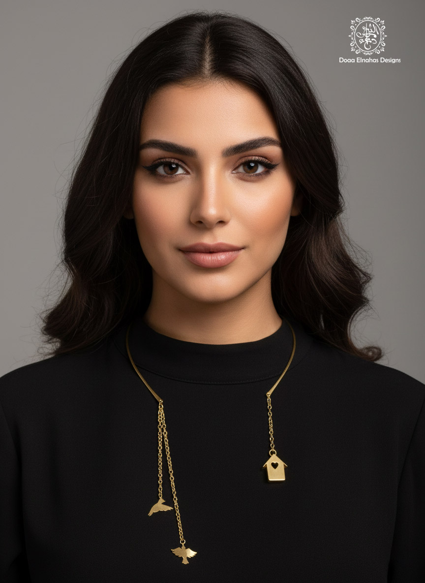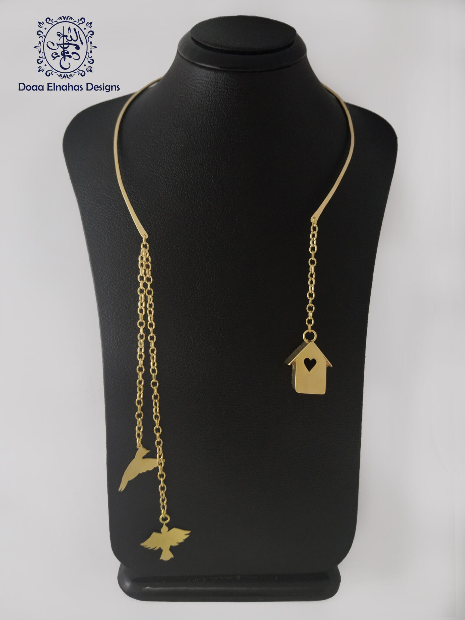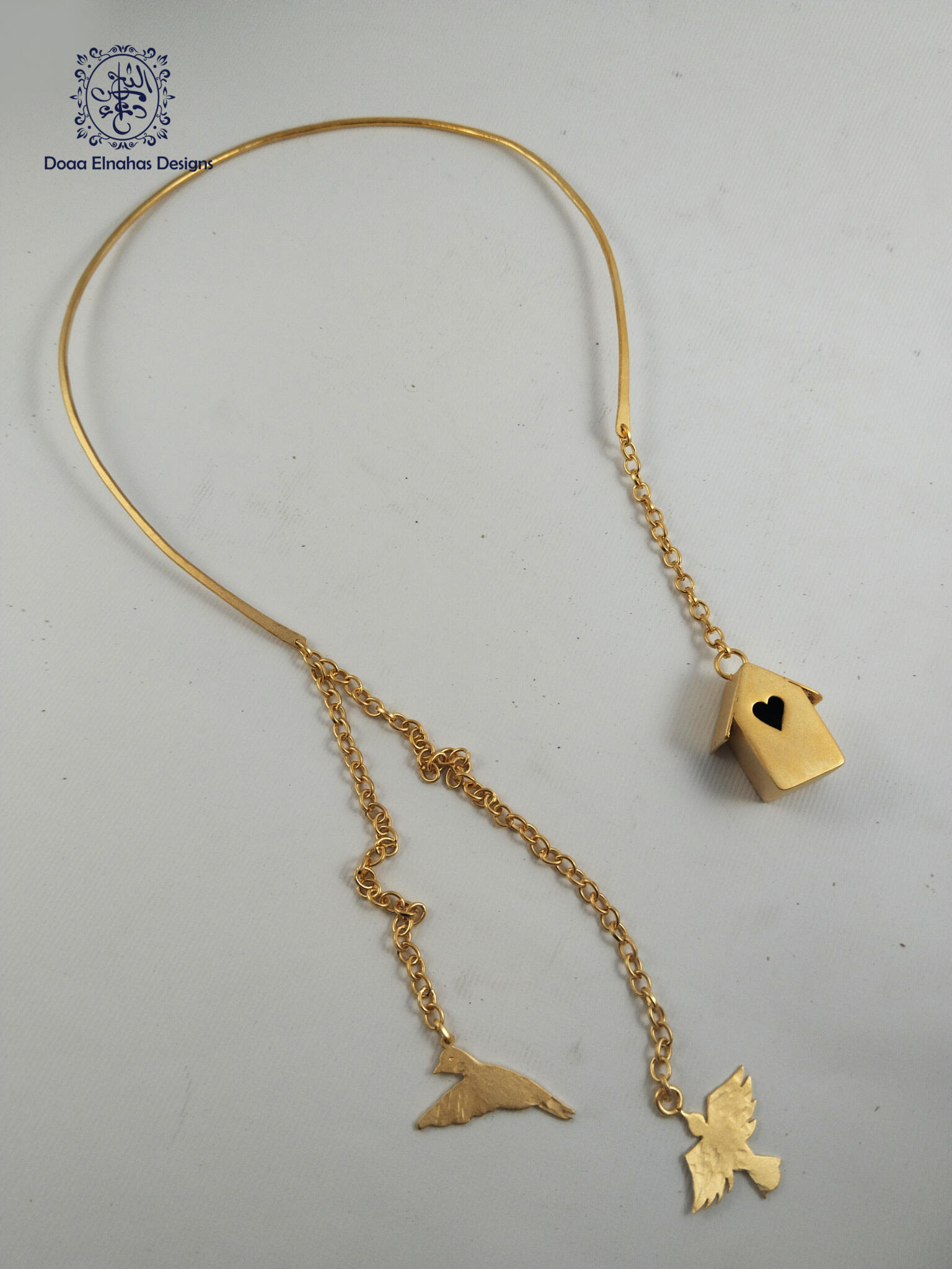 Gold-plated (matte) brass two sided necklace with a bird house and 2 hanging birds