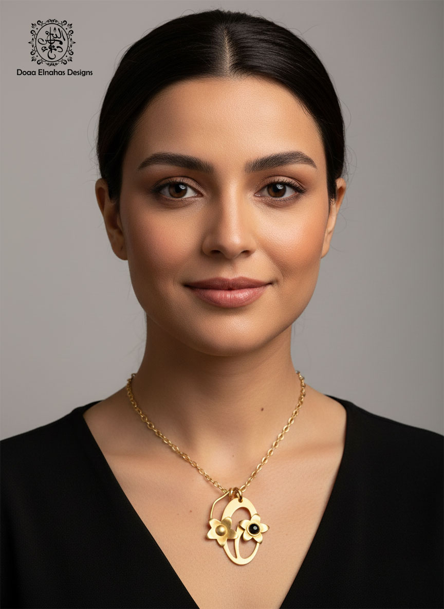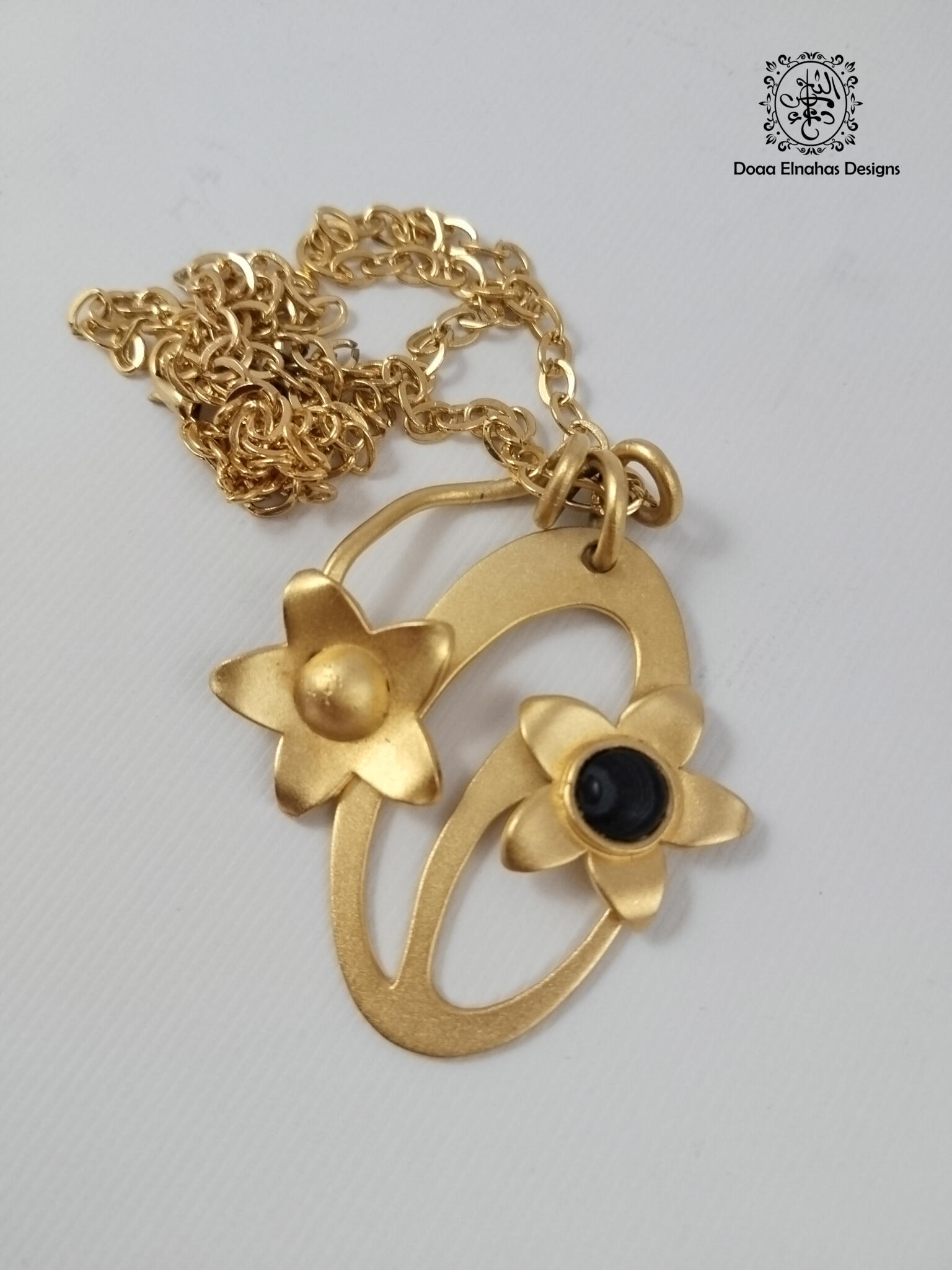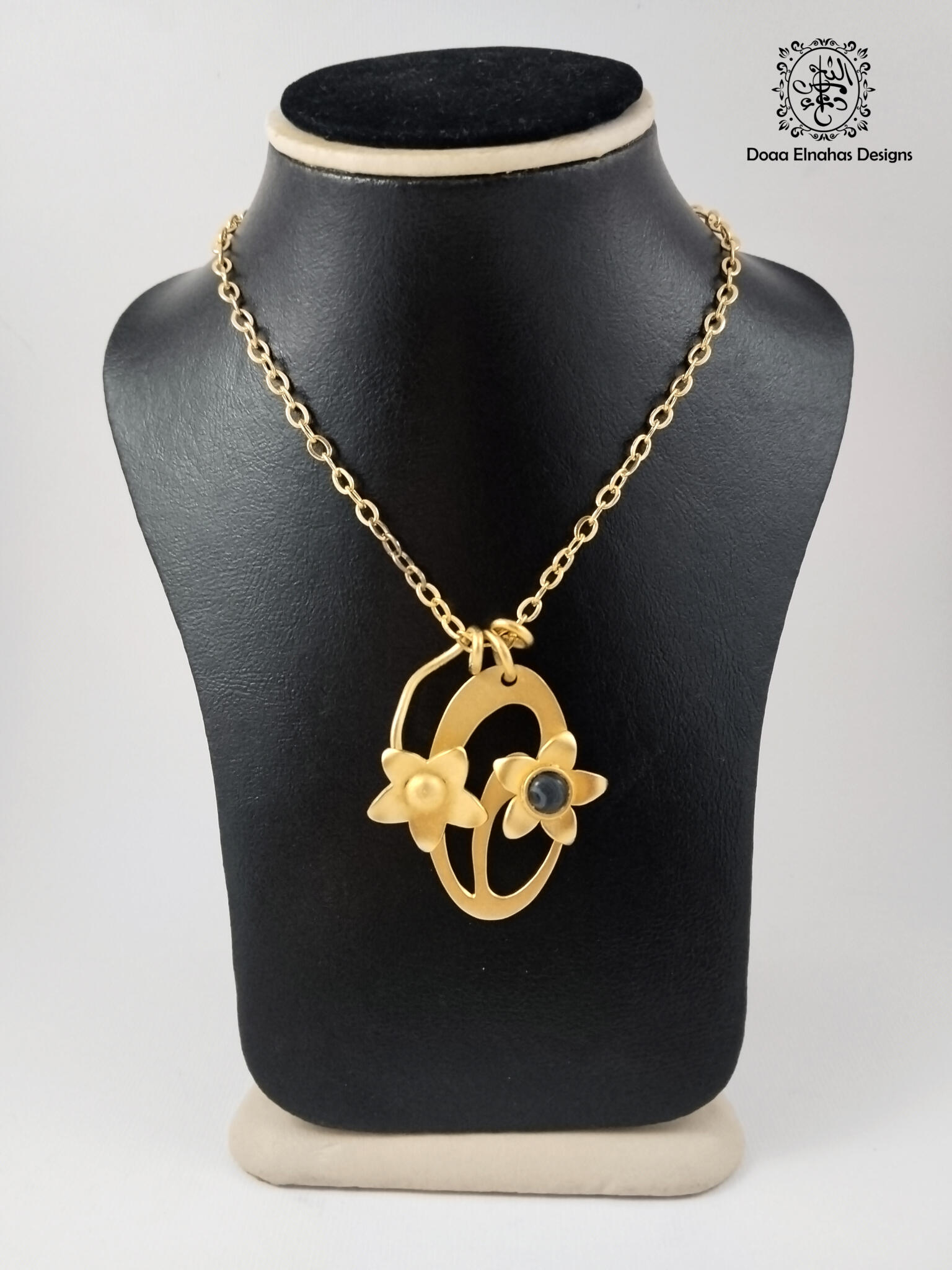 Gold-plated matte brass necklace with two flowers pendant one of them is movable