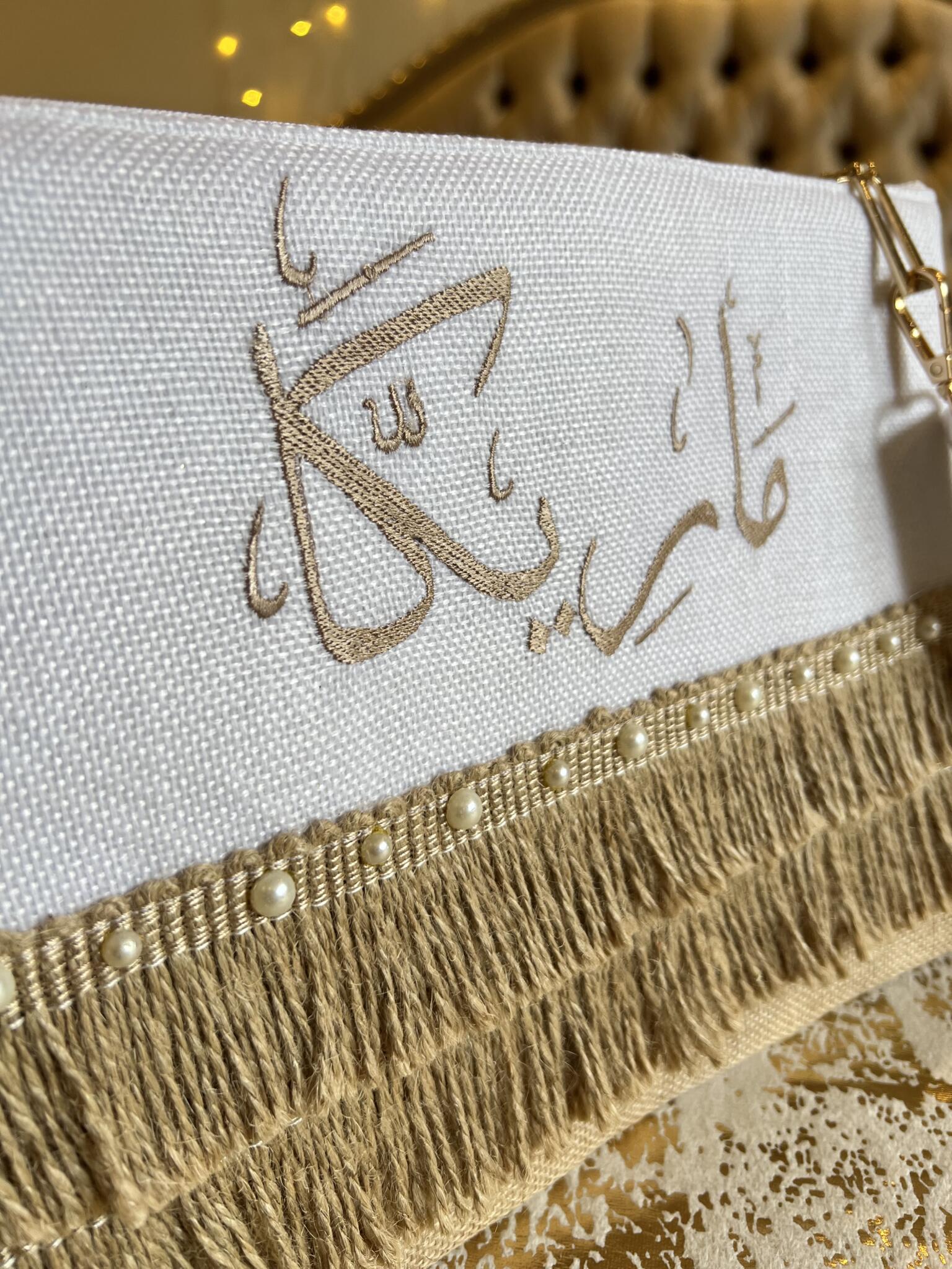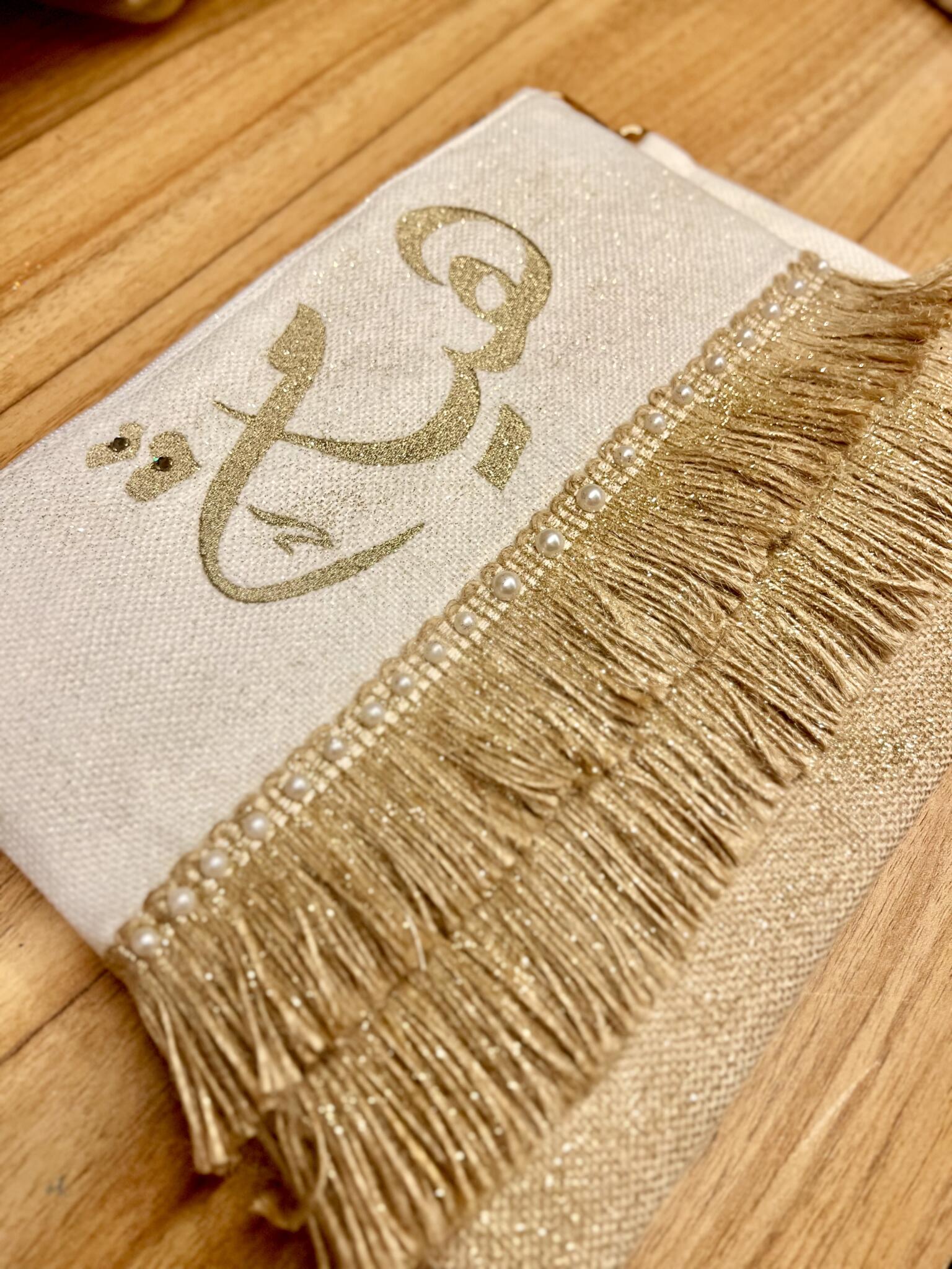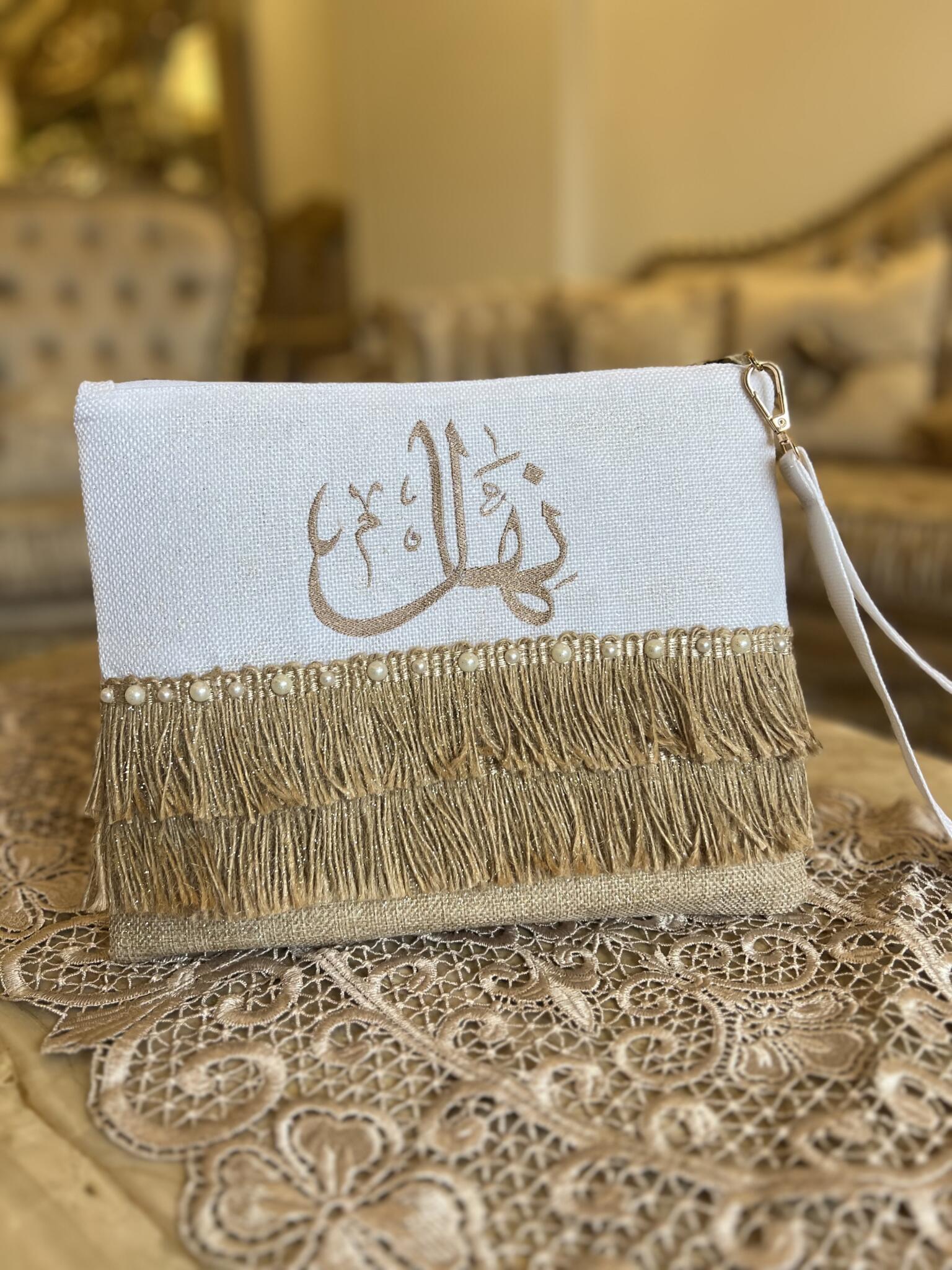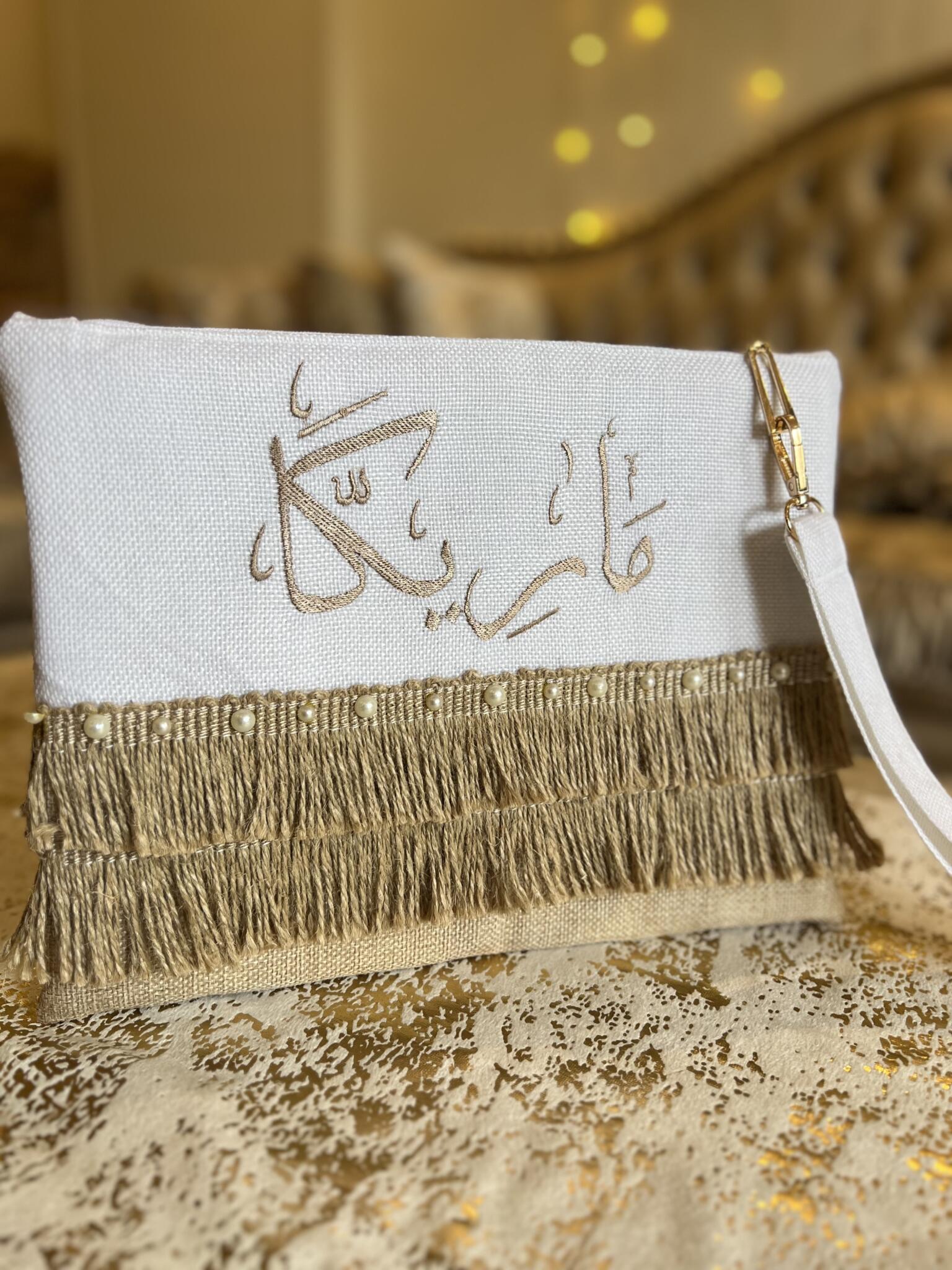 “Personalized boho clutch featuring elegant Arabic calligraphy with luxurious gold fringe tiers and pearl accents – customize with your chosen name in Arabic or English, or add a meaningful quote for a truly unique accessory.“
