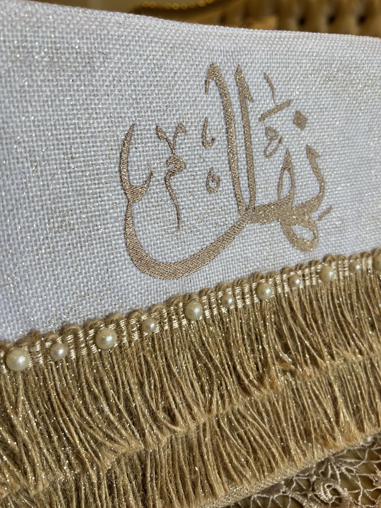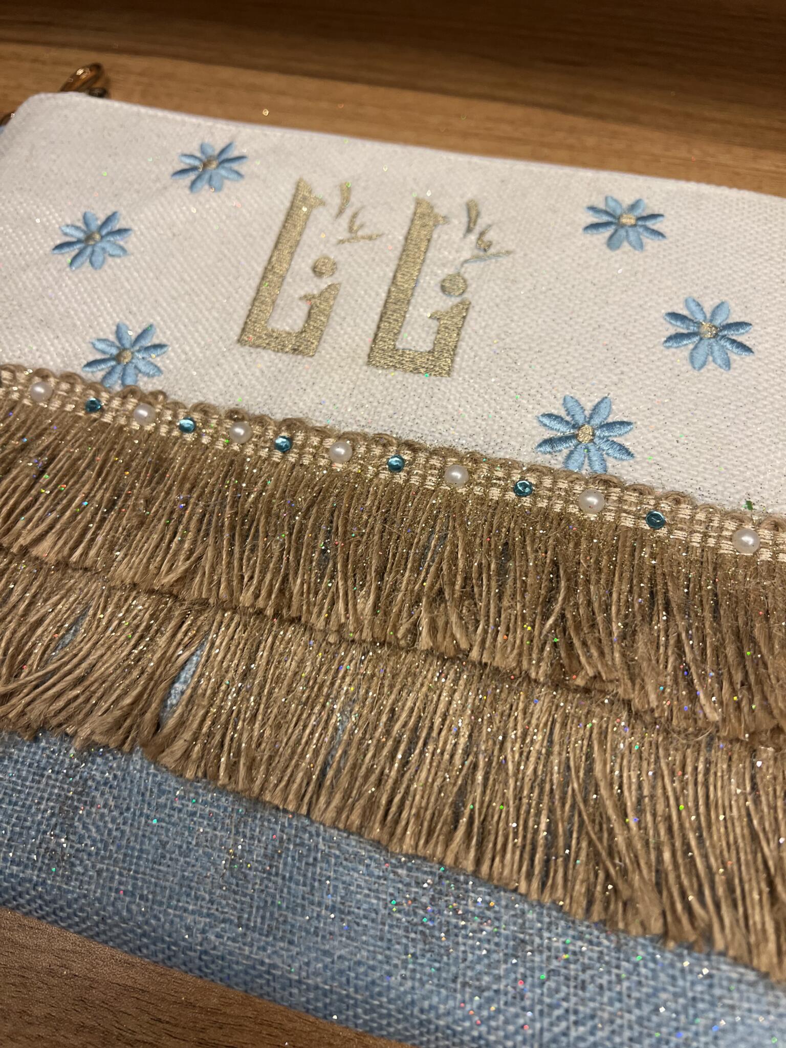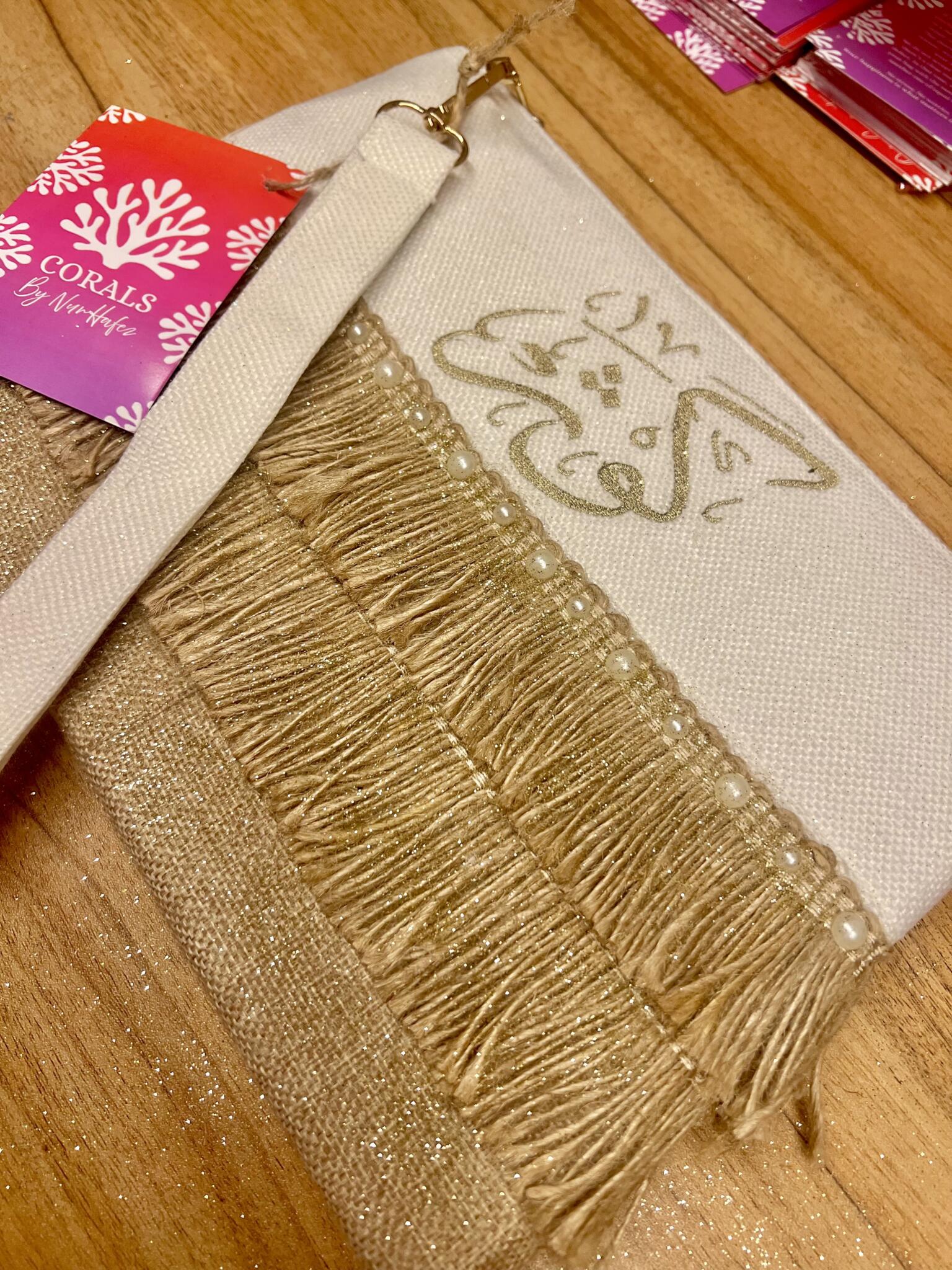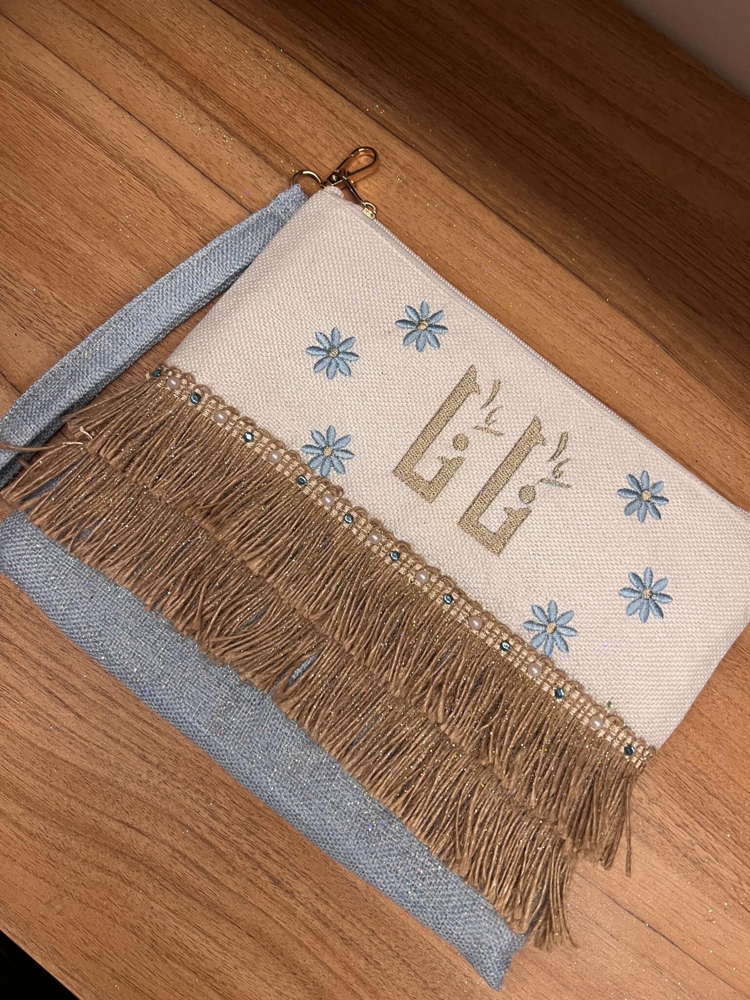 “Personalized boho clutch featuring elegant Arabic calligraphy with luxurious gold fringe tiers and pearl accents – customize with your chosen name in Arabic or English, or add a meaningful quote for a truly unique accessory.“