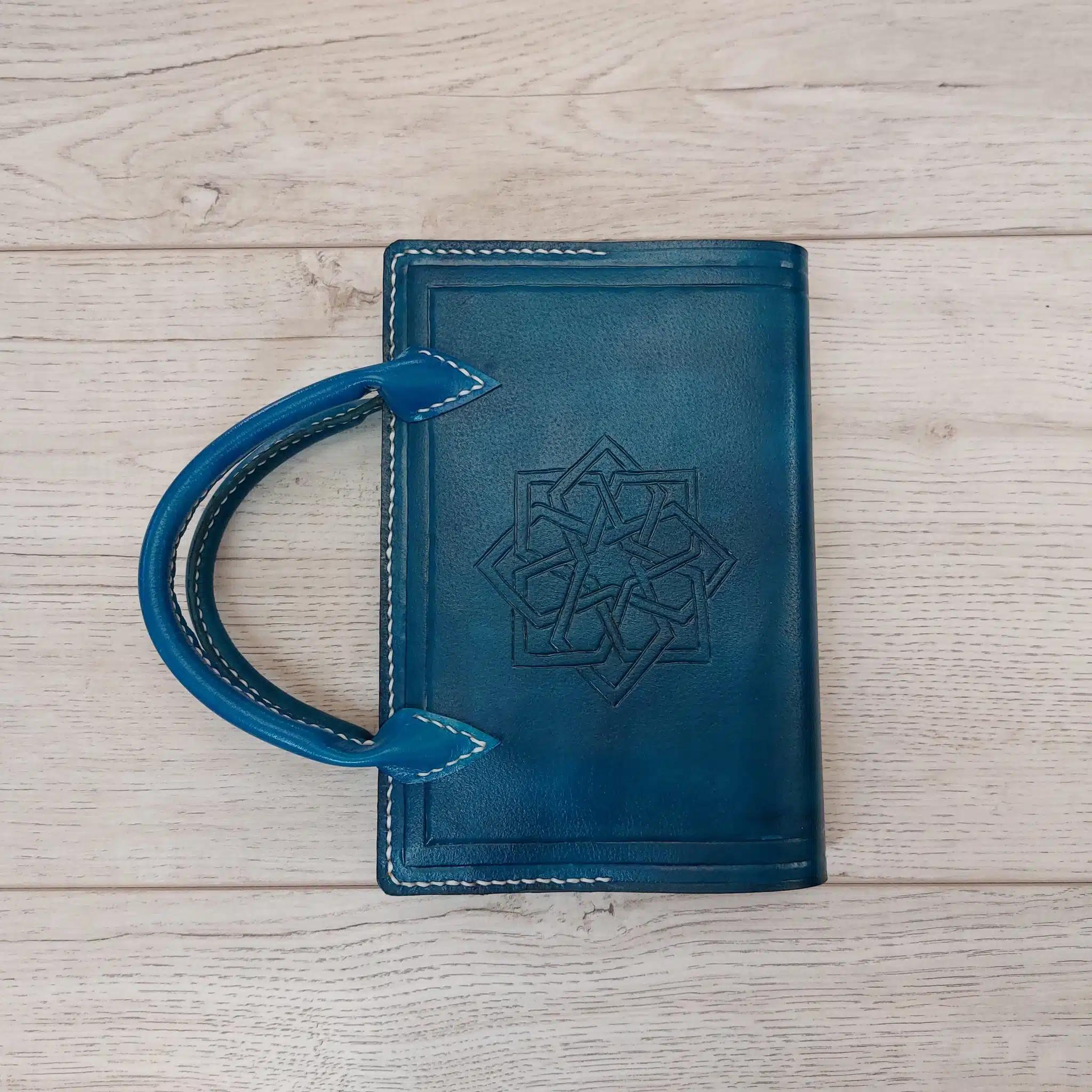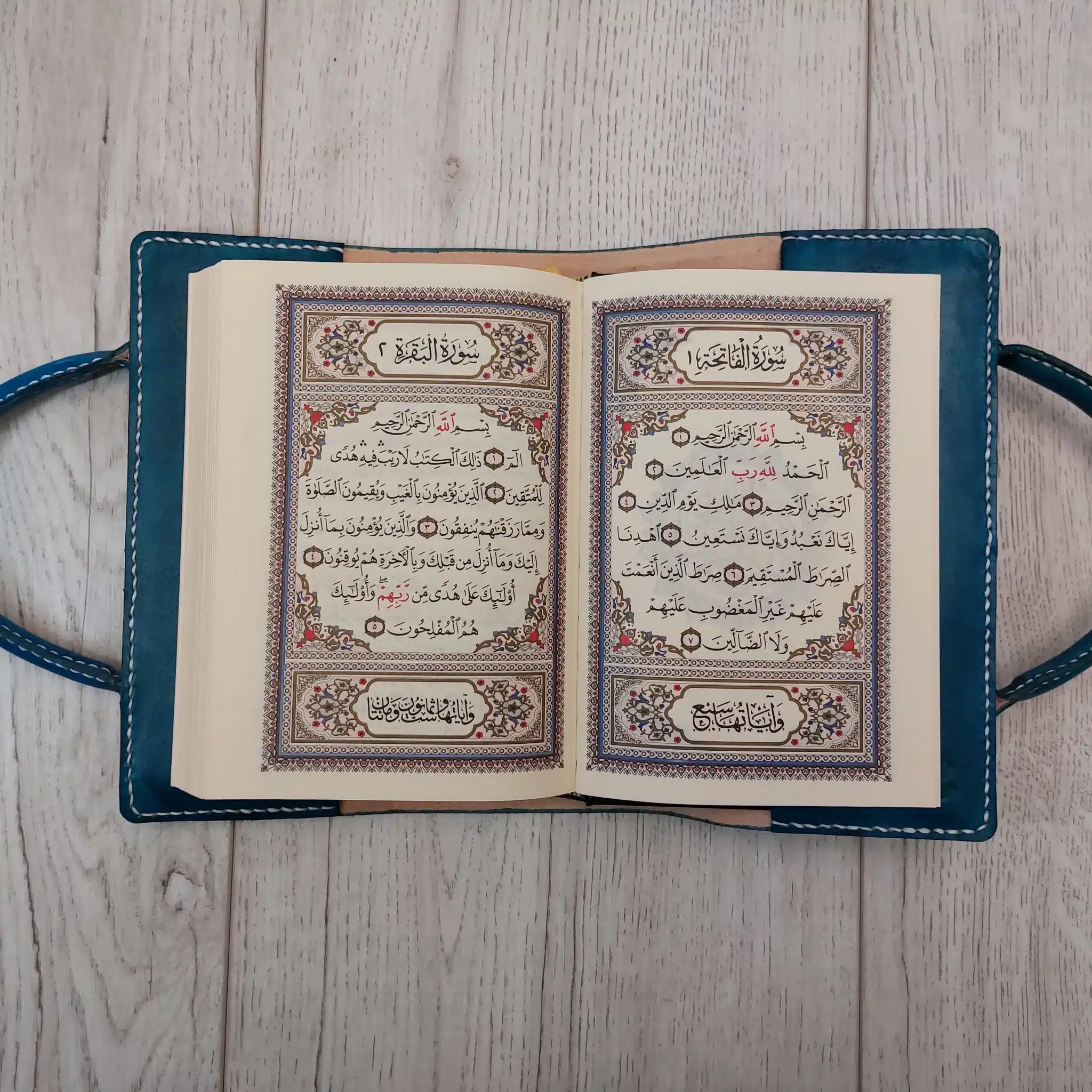 جراب مصحف جلد طبيعى هاند ميد بتصميم اسلامى مقاس ١٤×٢٠لون ازرق