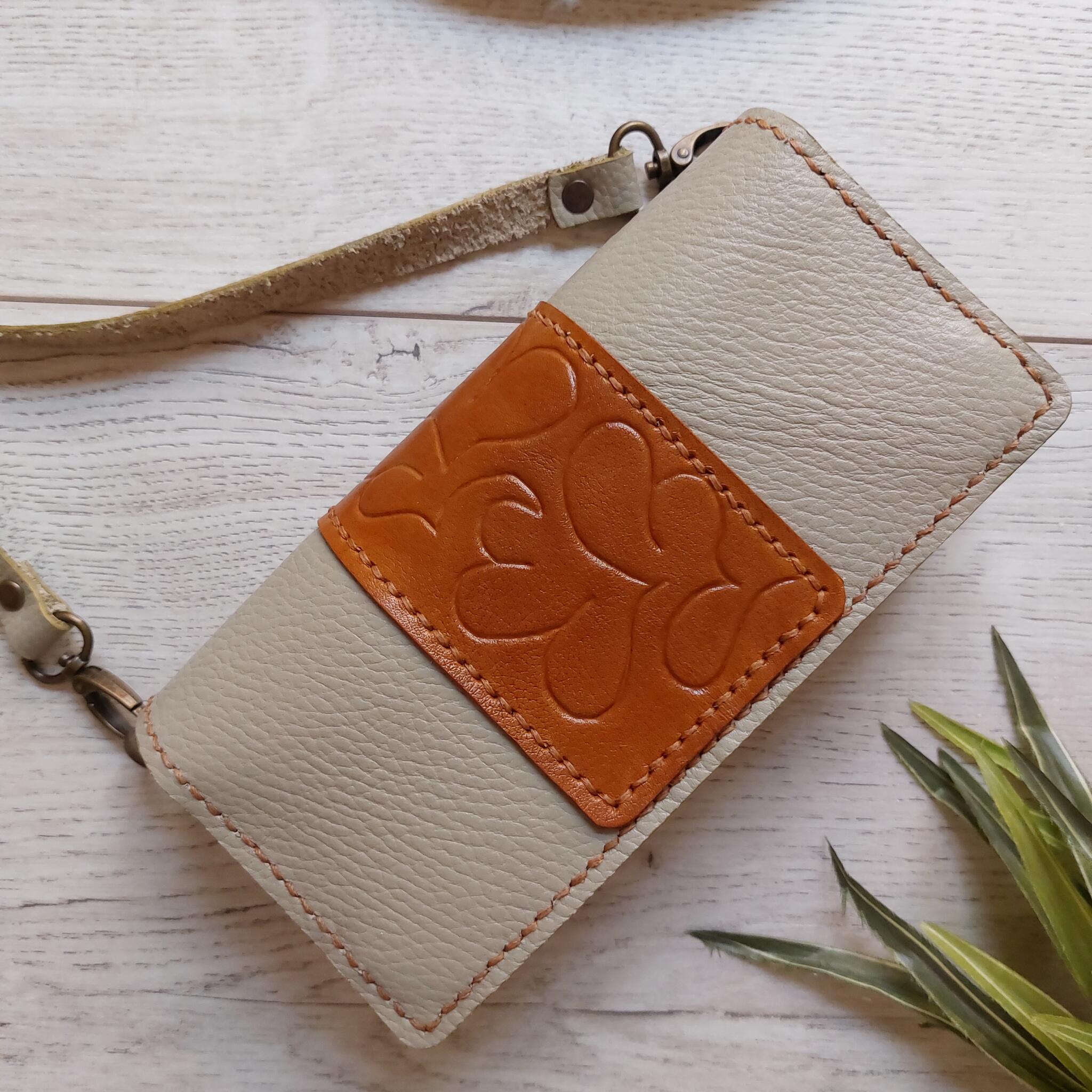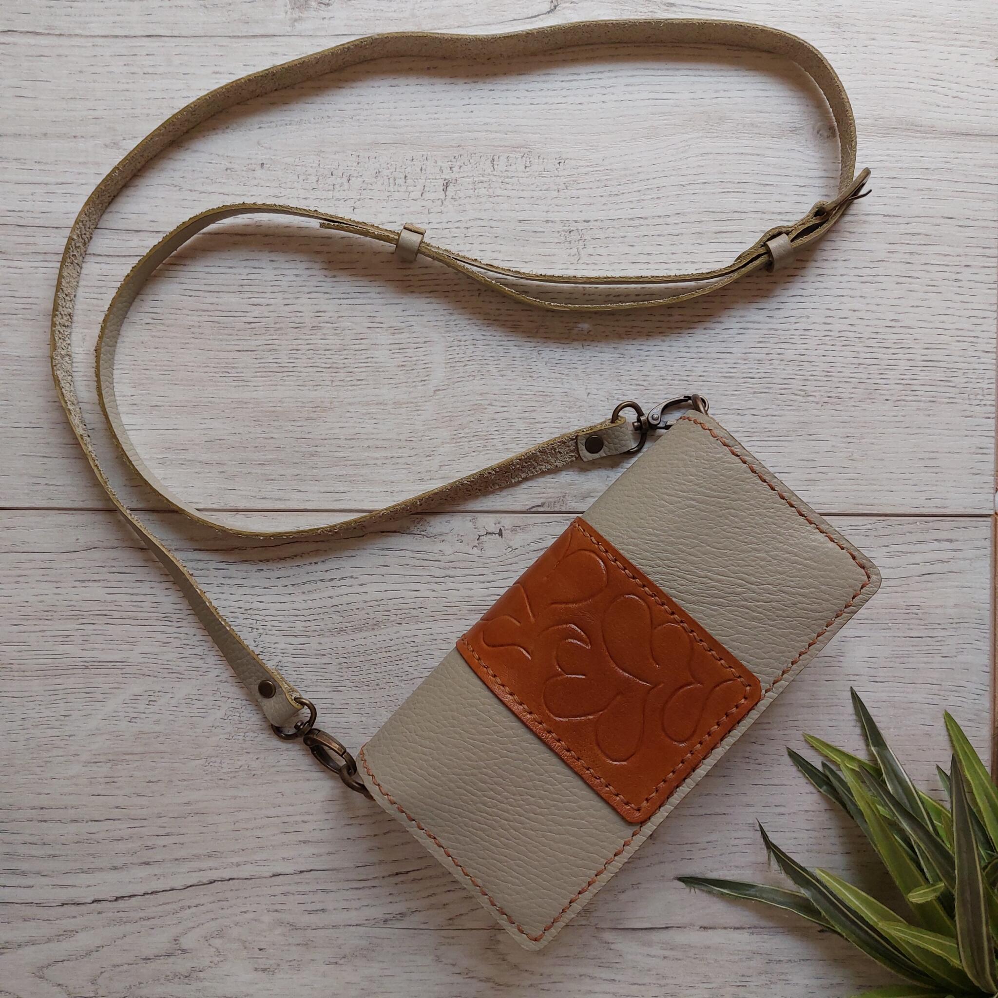 بورتوفيه جلد طبيعى هاند ميد بيد كروس لون بيج عليه رسمة حفر على الجلد لون هفان