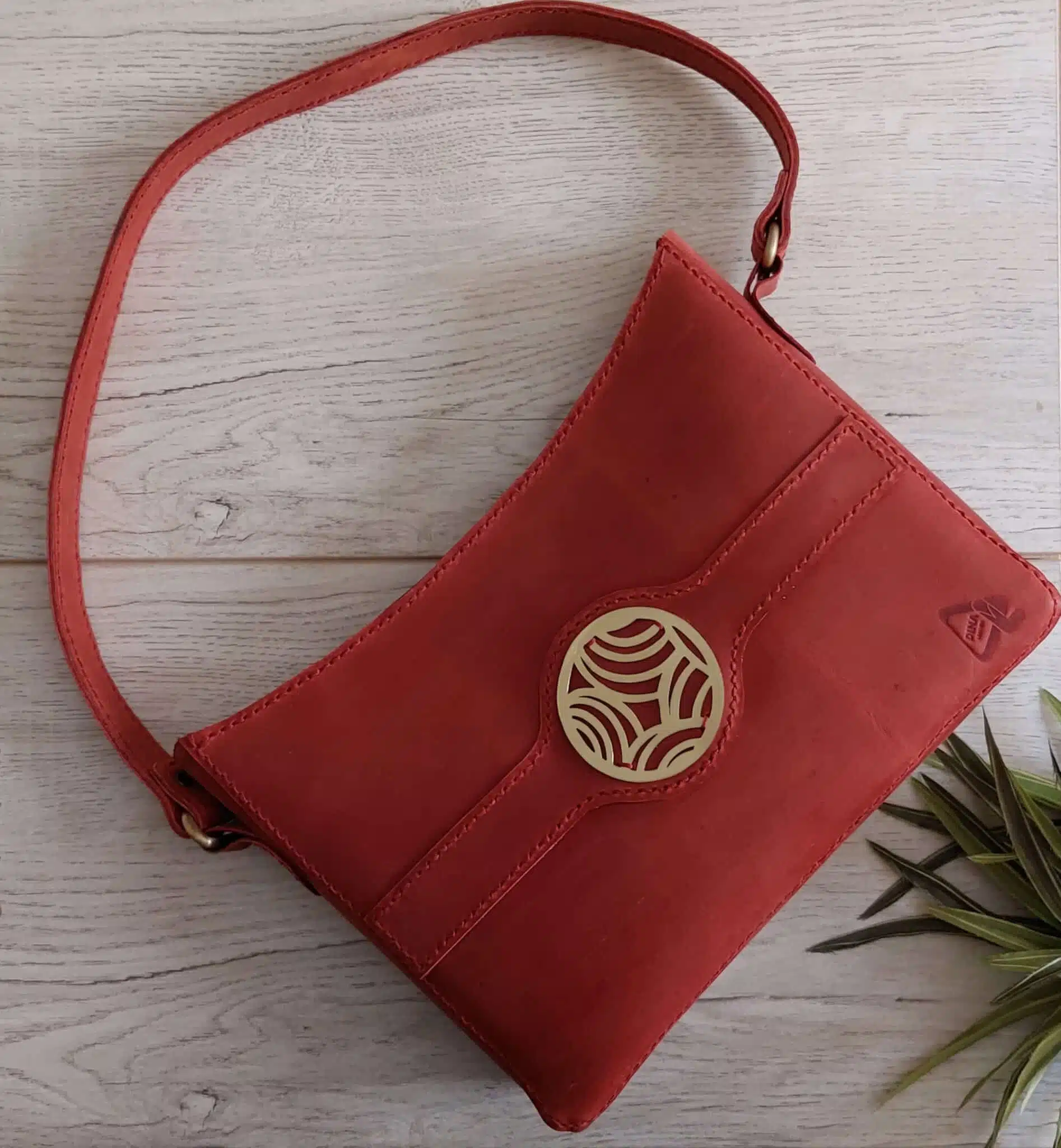Handmade natural leather bag with a circular brass charm, with an internal pocket, size 28cm wide, 21cm long