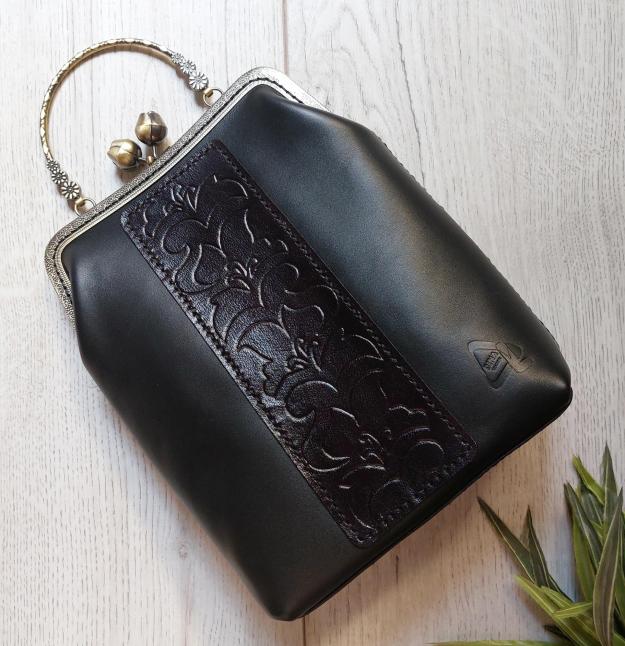 شنطة جلد طبيعى هاند ميد بفريم نحاس عليها رسمة بحفر على الجلد لون الشنطة اسود لها يد كروس من الجلد مقاس ٢٥سم ×٢٤سم