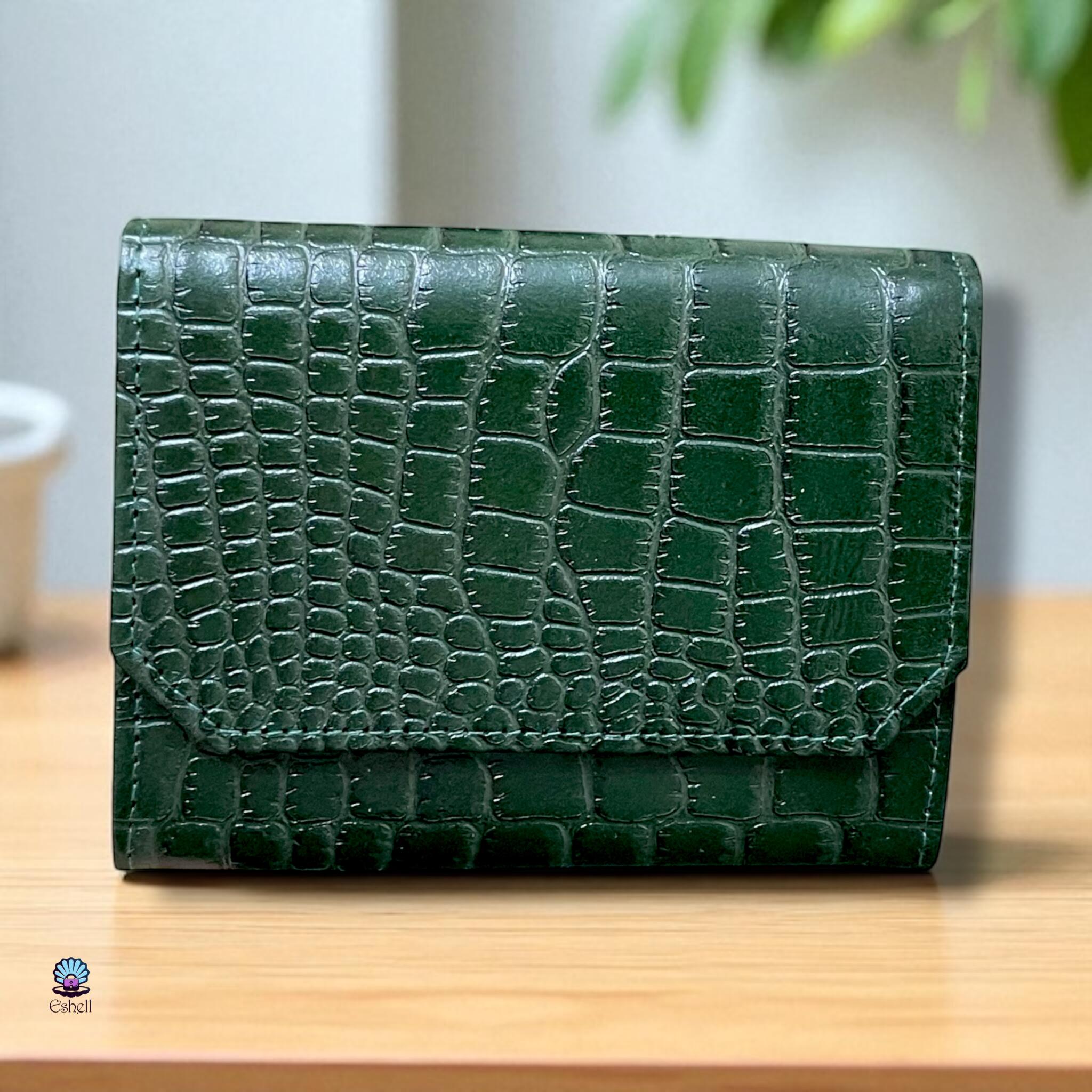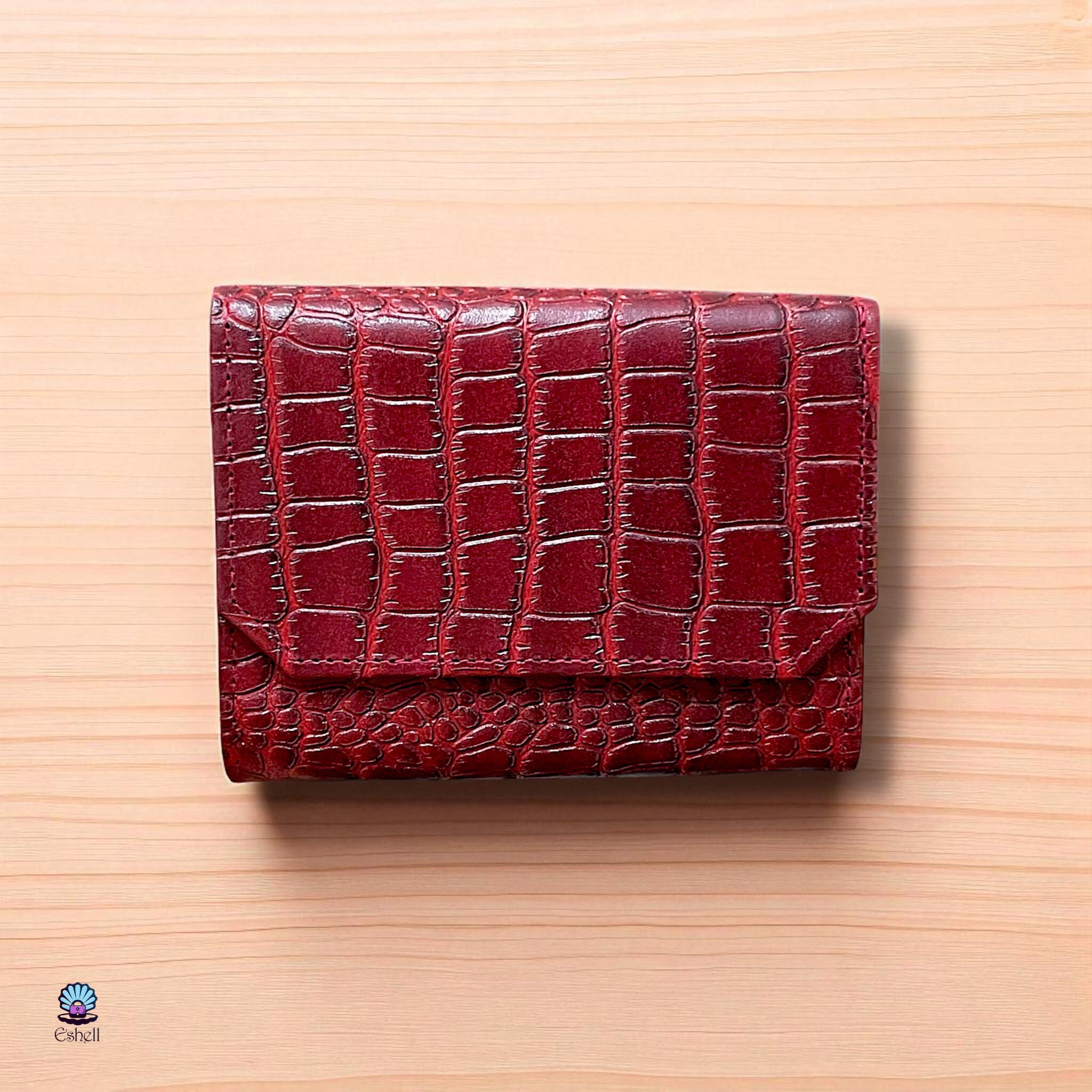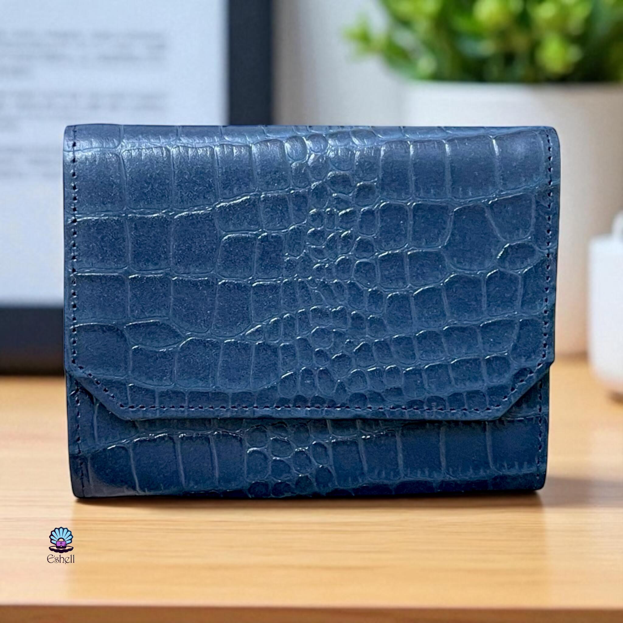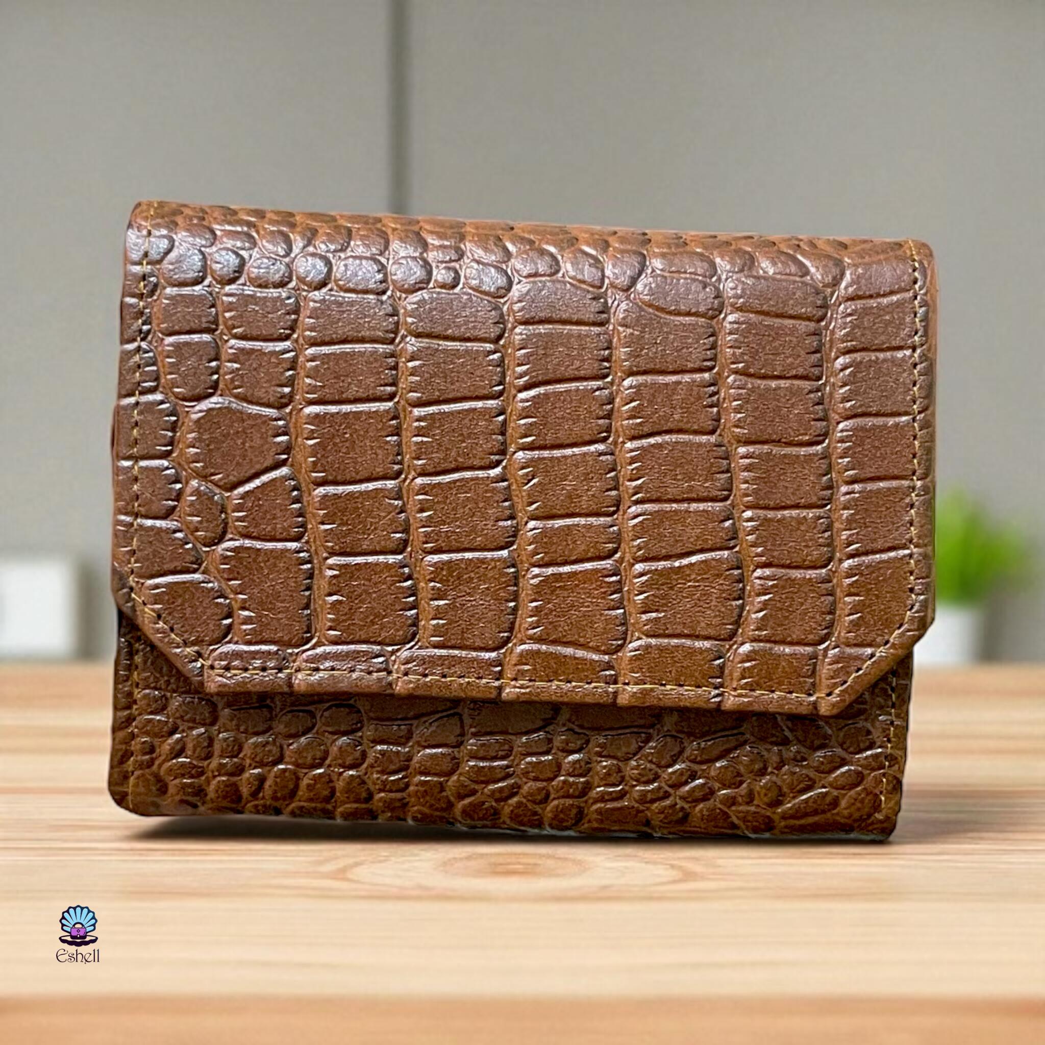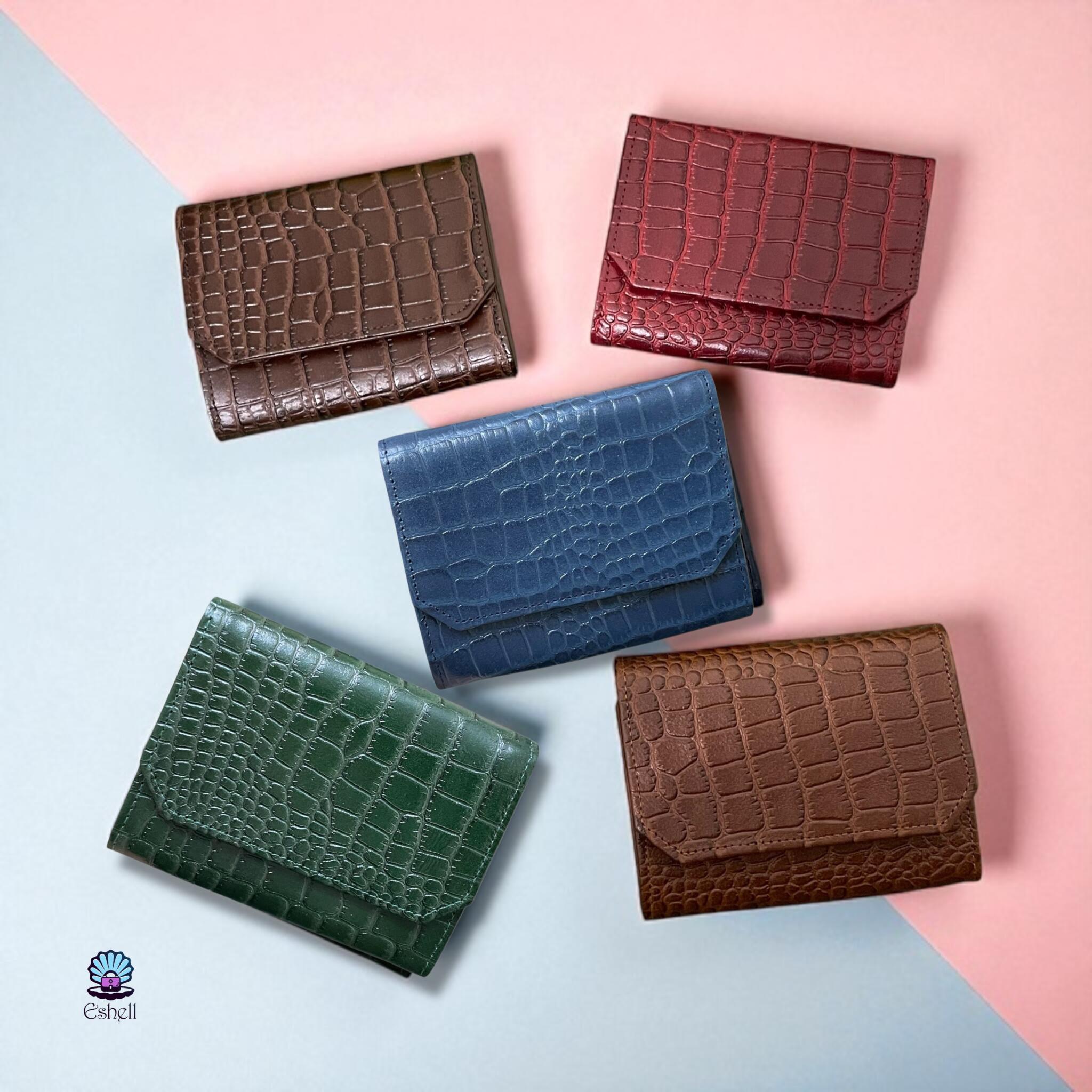 This handcrafted wallet is made from premium natural leather with a croc-embossed finish. Available in a variety of rich colors — Havana brown, chocolate brown, deep green, navy blue, and burgundy.