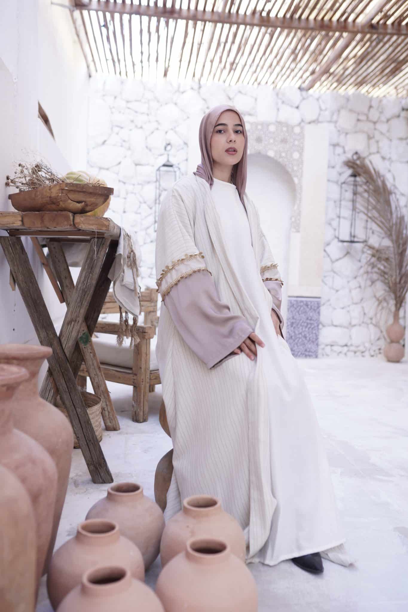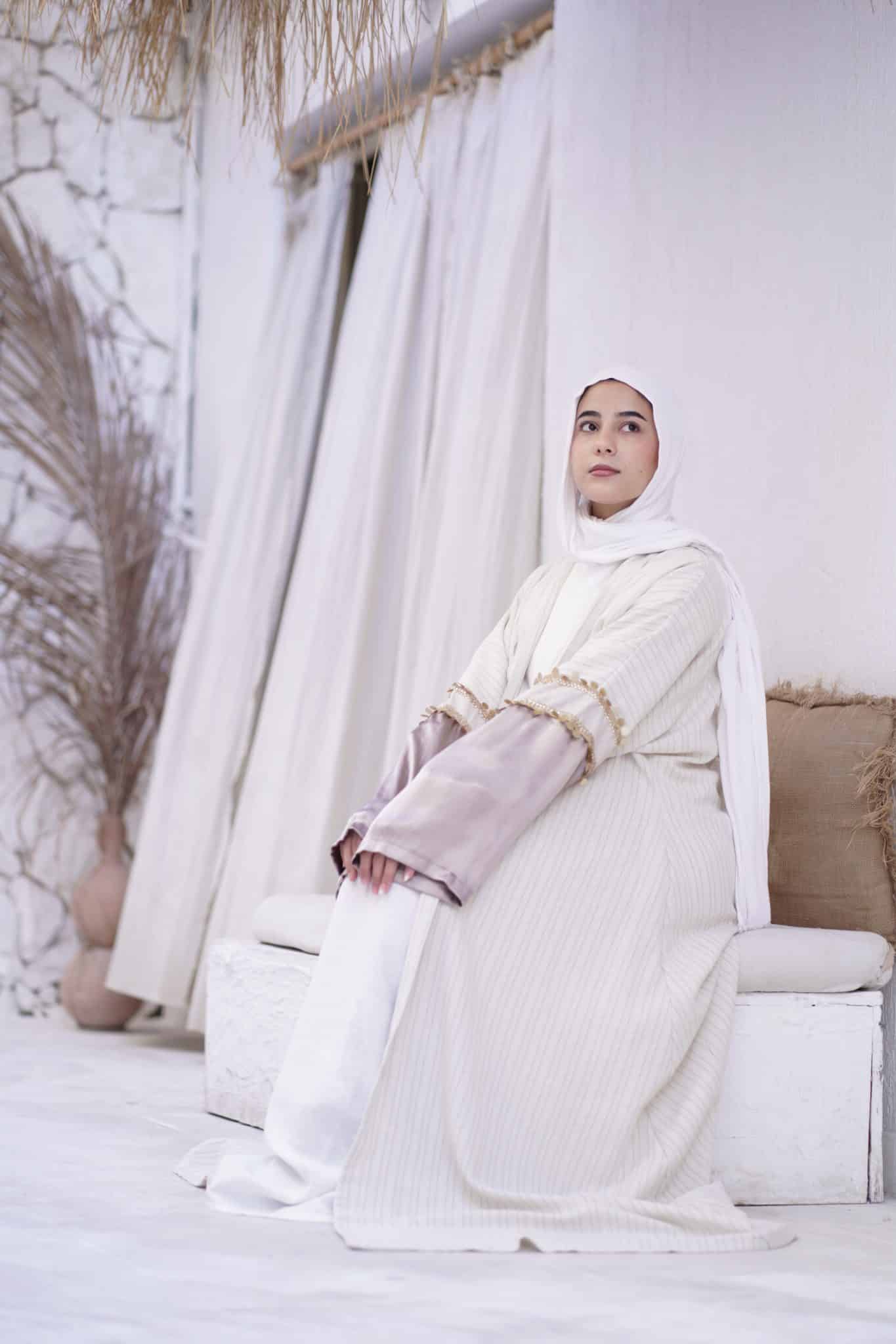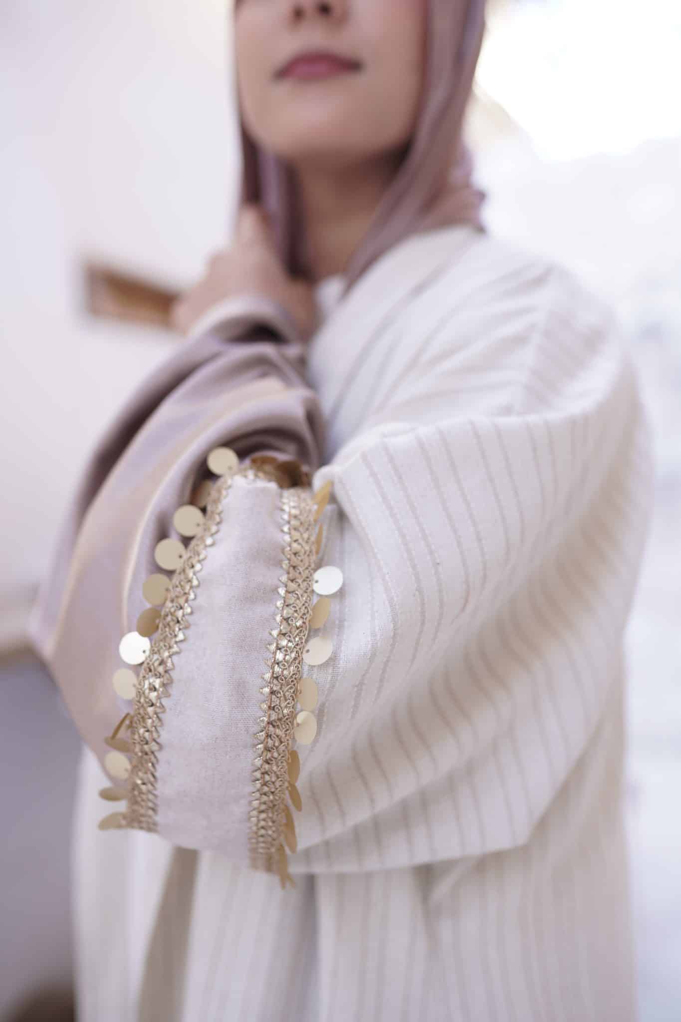 Natural Linen Kaftan/Abaya with Satin and Gold Embroidery