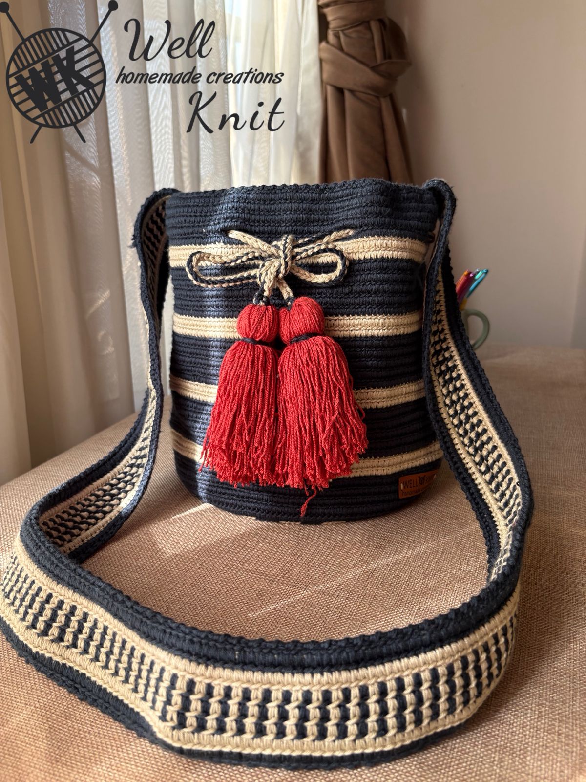 • شنطة موشيلا يدوية باللون الكحلي مع خطوط باللون الأبيض.