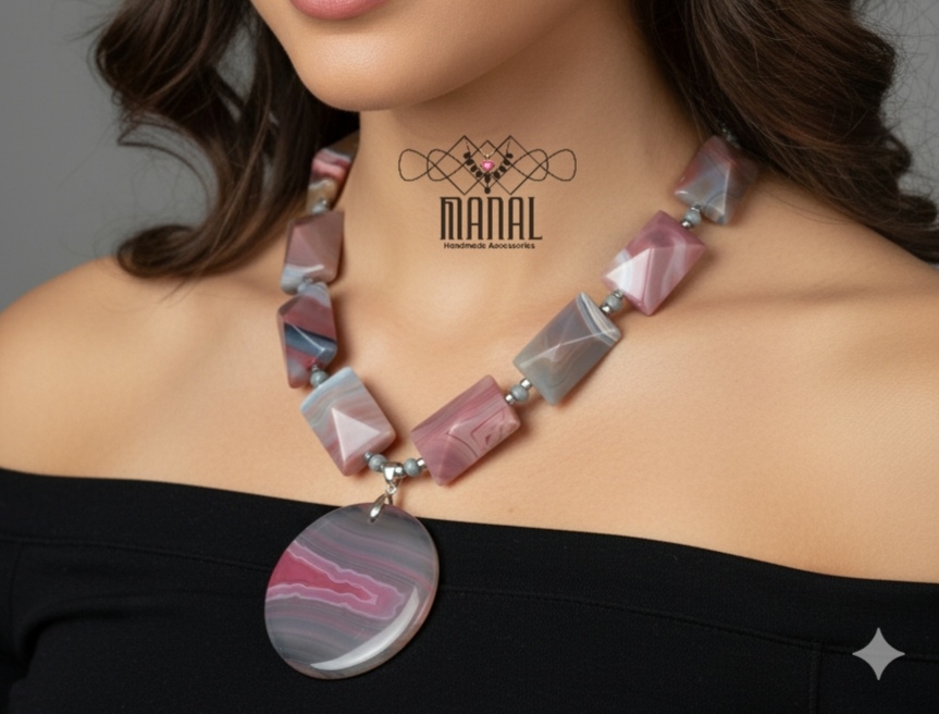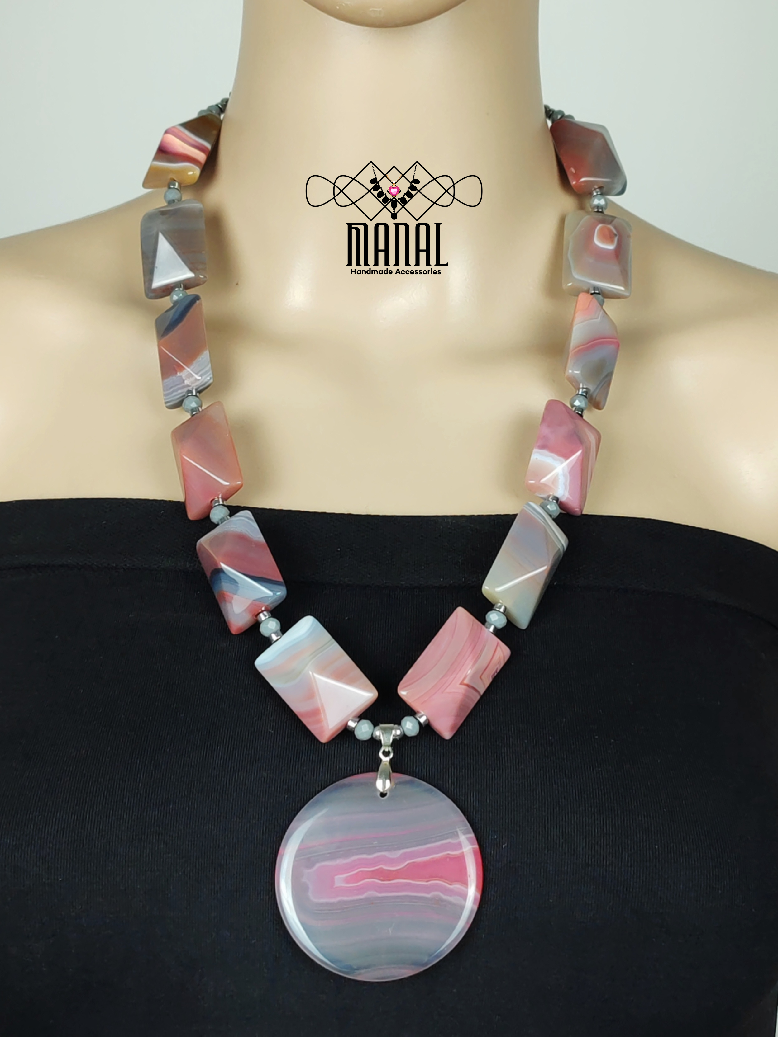 عقد من احجار العقيق السليماني بفواصل من احجار الكريستال والهيماتيت مع دلايه من احجار العقيق