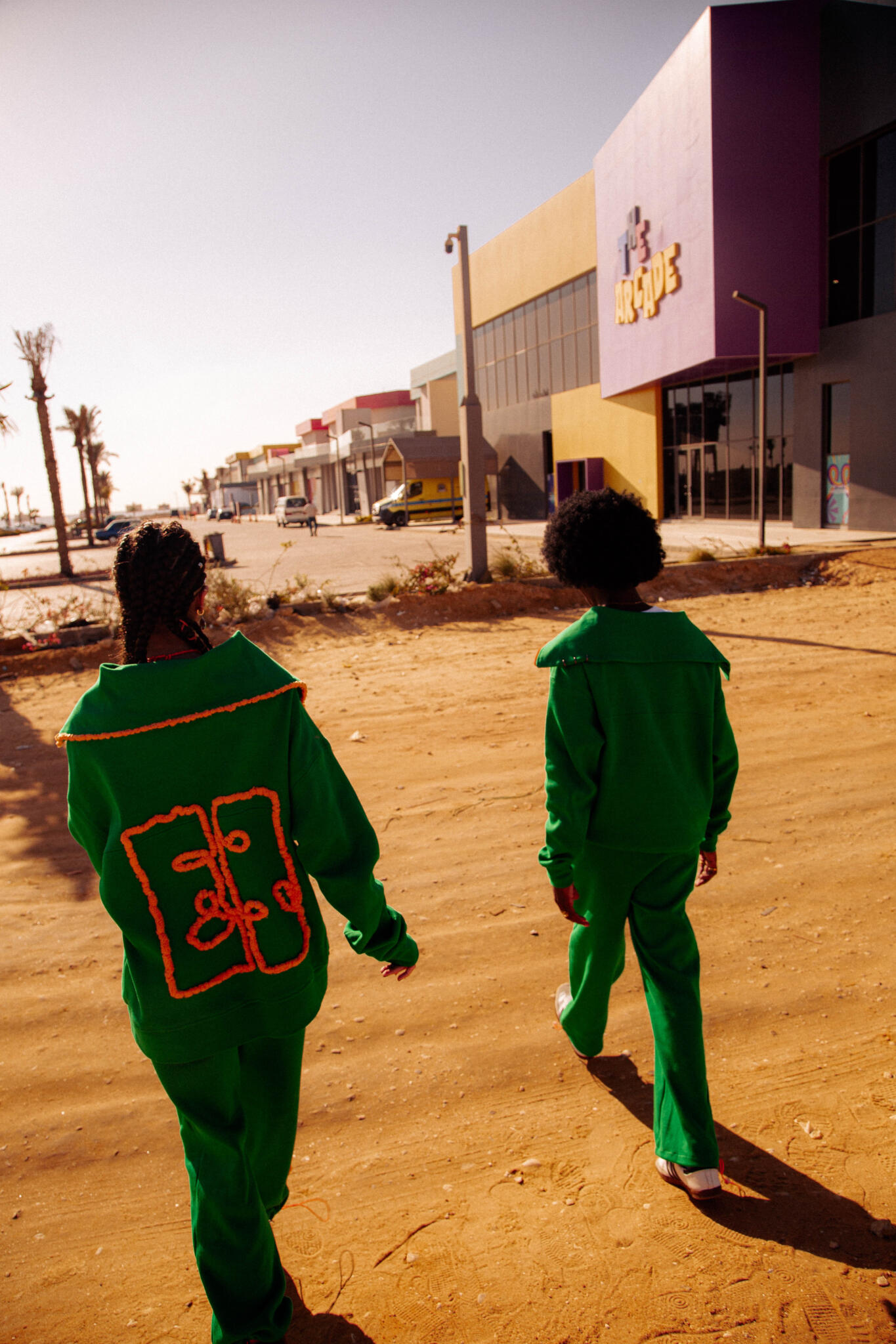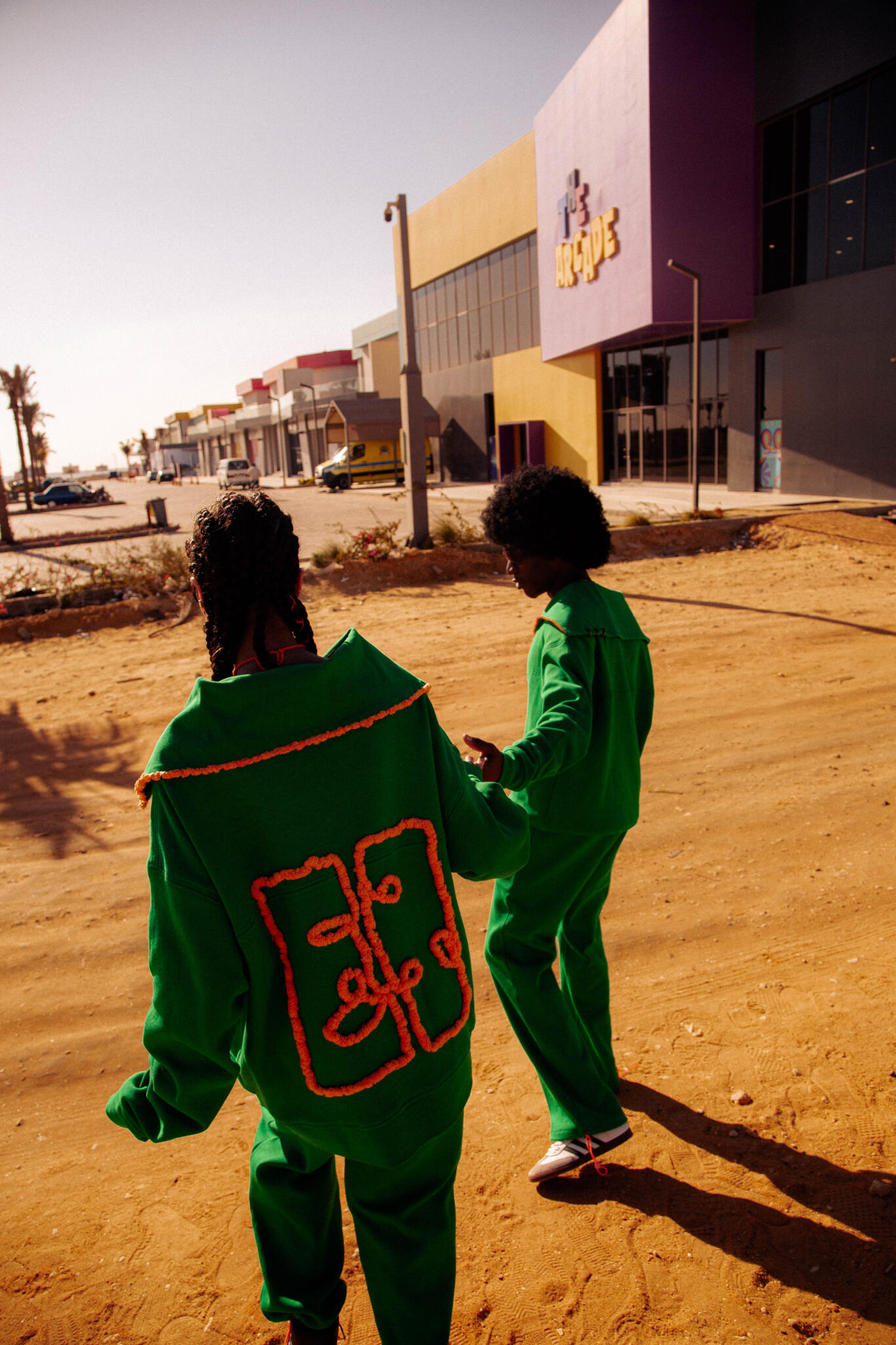 Relaxed-fit green polo sweater with an oversized hood and bold orange zipper, decorated with vibrant orange furry-thread details that bring a playful, textured twist to a classic streetwear piece.
