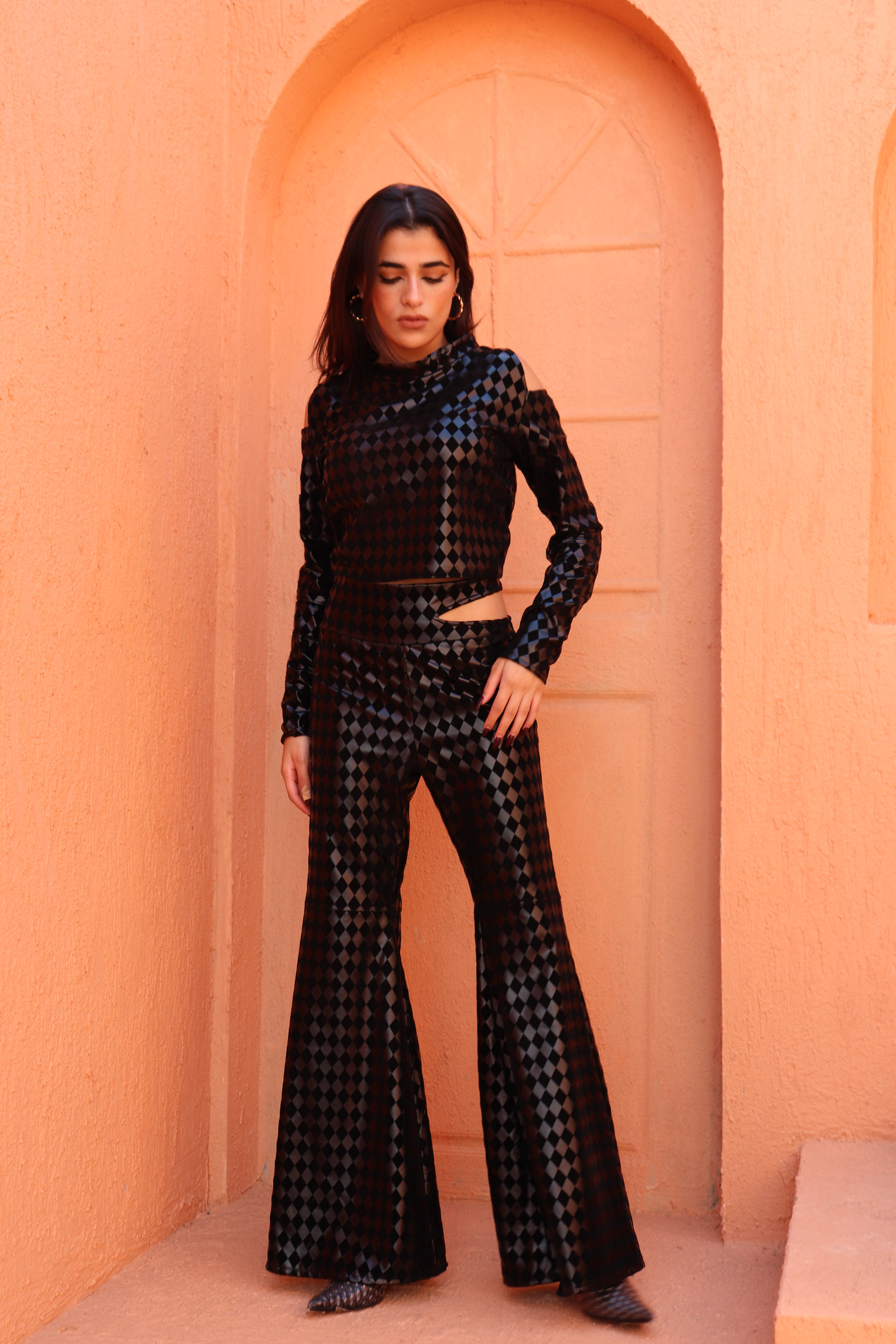 Designed to elongate and empower, the Noir Pants redefine comfort and edge. Made from a stretch velvet–leather fabric, they sculpt the body while allowing full movement. The side opening detail adds a striking finish, giving the piece a fluid yet structured silhouette.