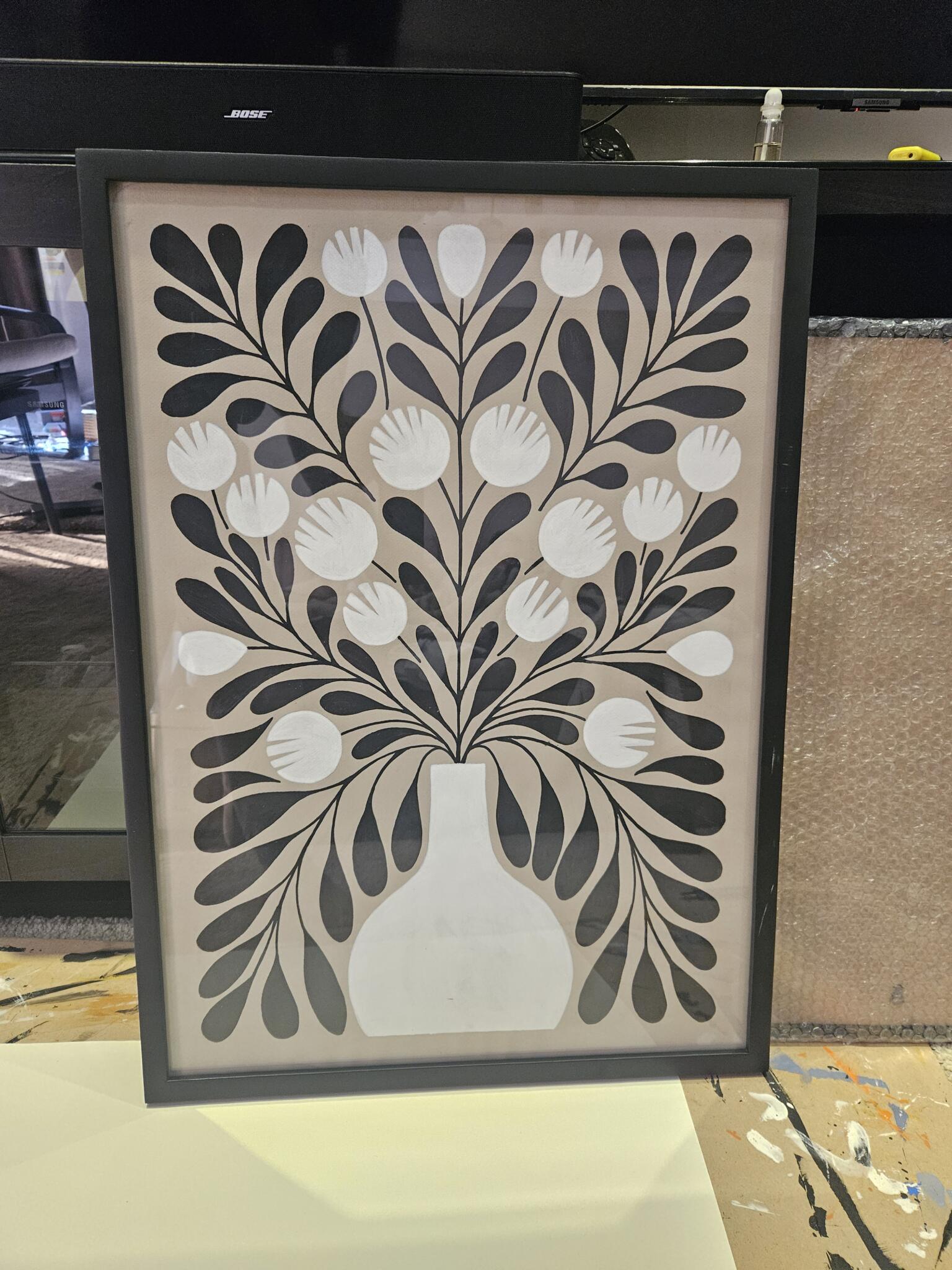 Elevate your living space with this striking Nordic Folk Flowers painting, a modern minimalist interpretation of classic Scandinavian design. Featuring bold, stylized botanical motifs in a sophisticated palette of black, white, and warm tan, this piece perfectly blends traditional charm with contemporary style. Its simple yet captivating composition adds a touch of tranquil elegance and Hygge-inspired coziness to any room, making it the perfect focal point above a sofa, bed, or sideboard.