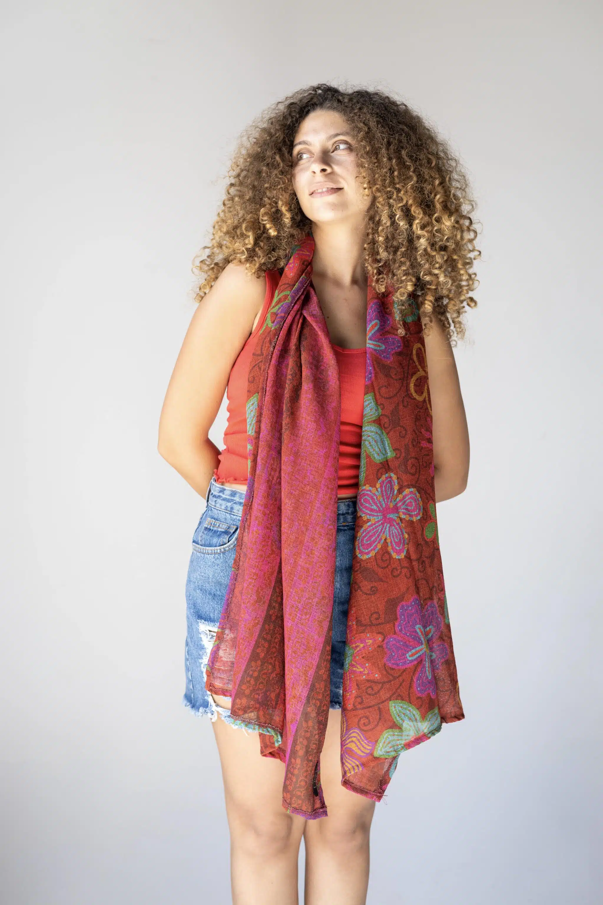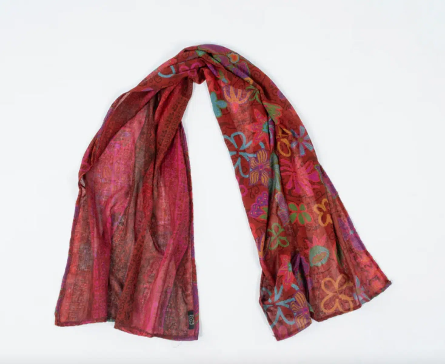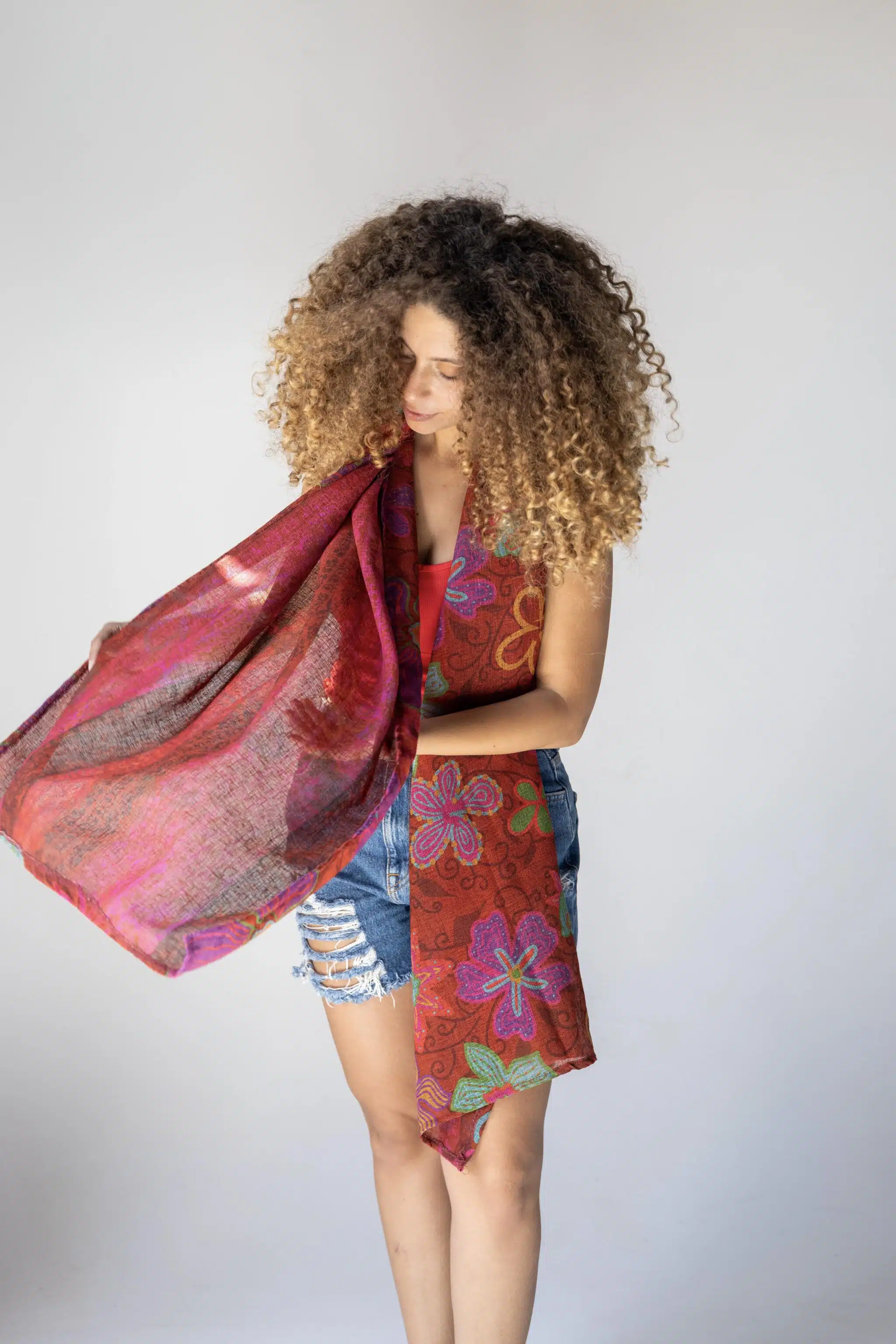 When it comes to scarves, you MUST trust us. The Scarf is double-faced. One side is patterned with vibrant flowers with a bold red background, and the other side is stripped in red and fuchsia shades.
