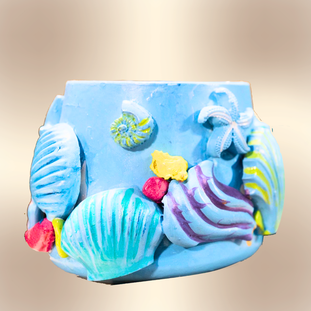 A stylish concrete cup inspired by the ocean and seashells, designed with coastal details that bring a calm, marine vibe. Perfectly sized to be used as a pen holder, desk organizer, or decorative accessory for home and office spaces.