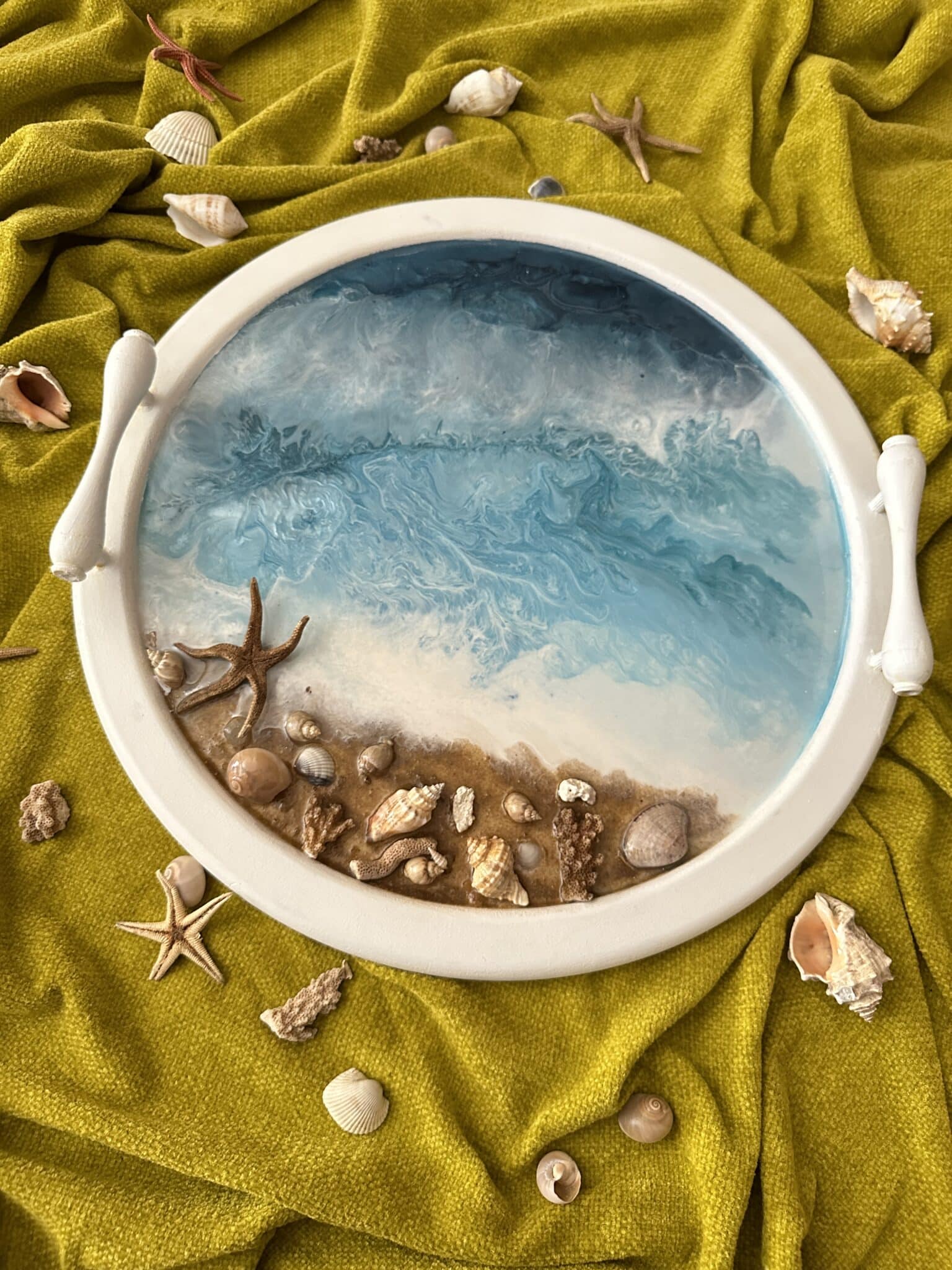 Handmade wooden serving tray in an ocean/ beach theme made with real sand and shells, sealed in by epoxy designed waves.