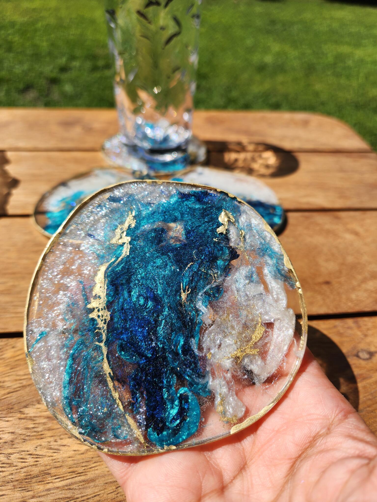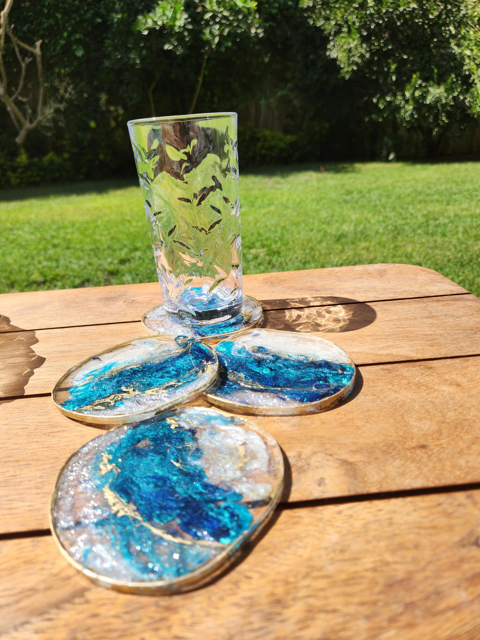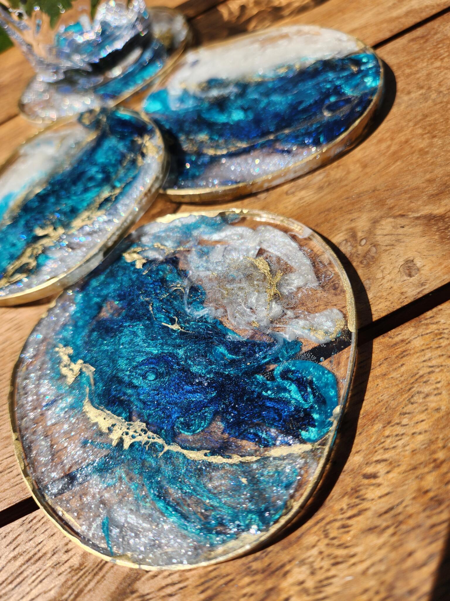 A set of 4 handcrafted resin coasters inspired by the rhythm of the ocean. Each piece reflects the swirling elegance of deep turquoise, sapphire, pearly whites, and golden shoreline edges—sealed in high-gloss for a luxurious glass-like finish.