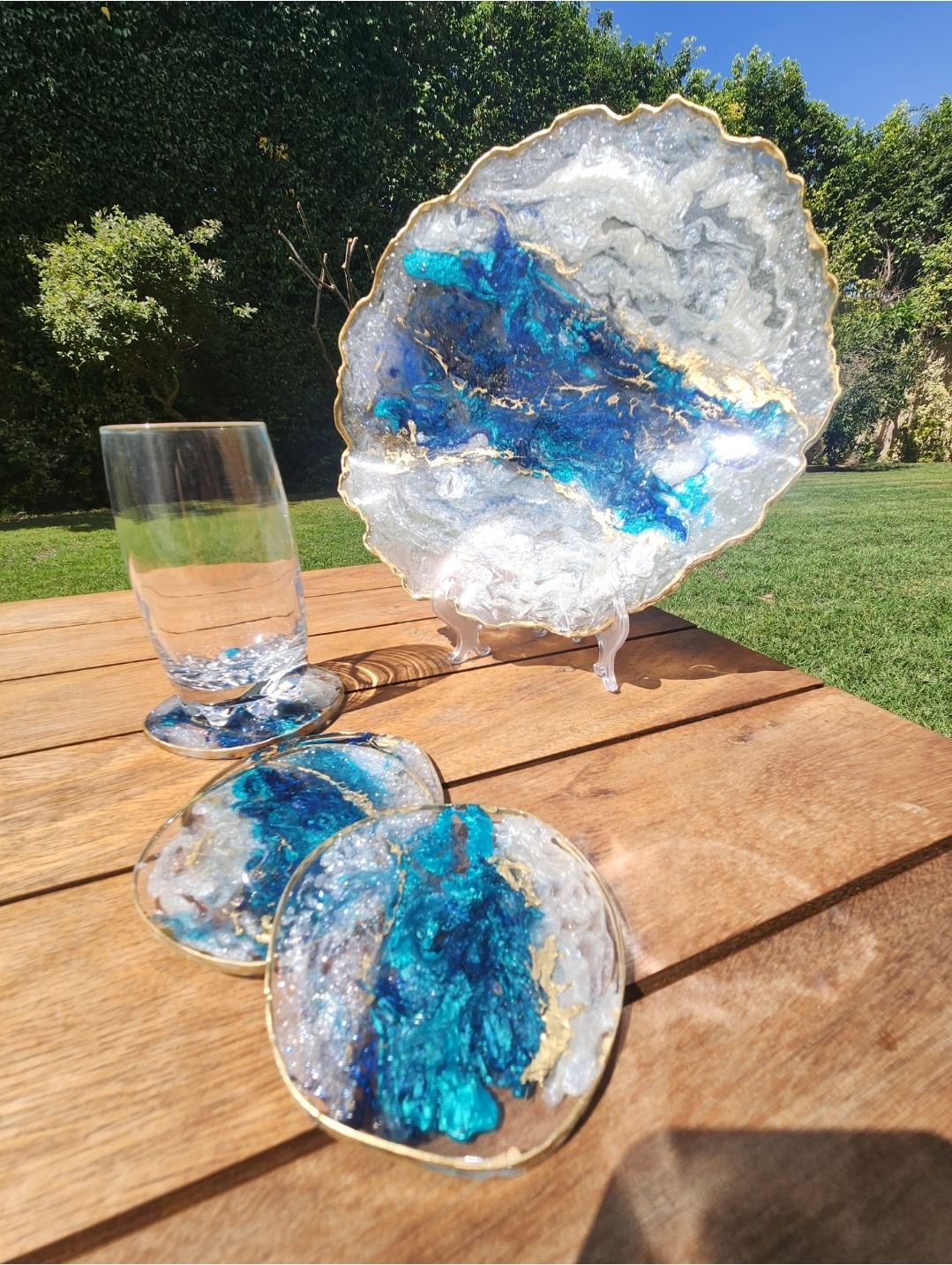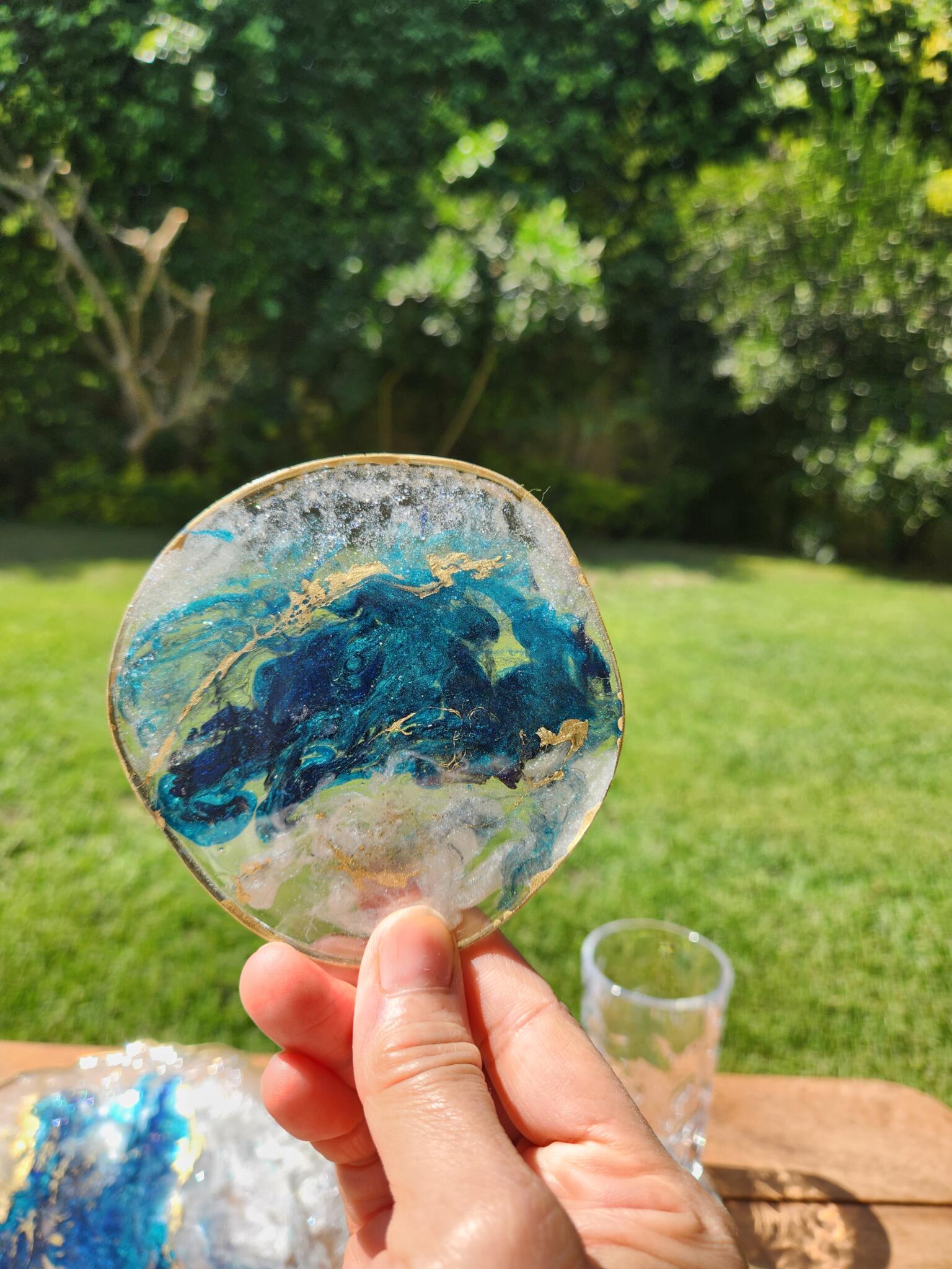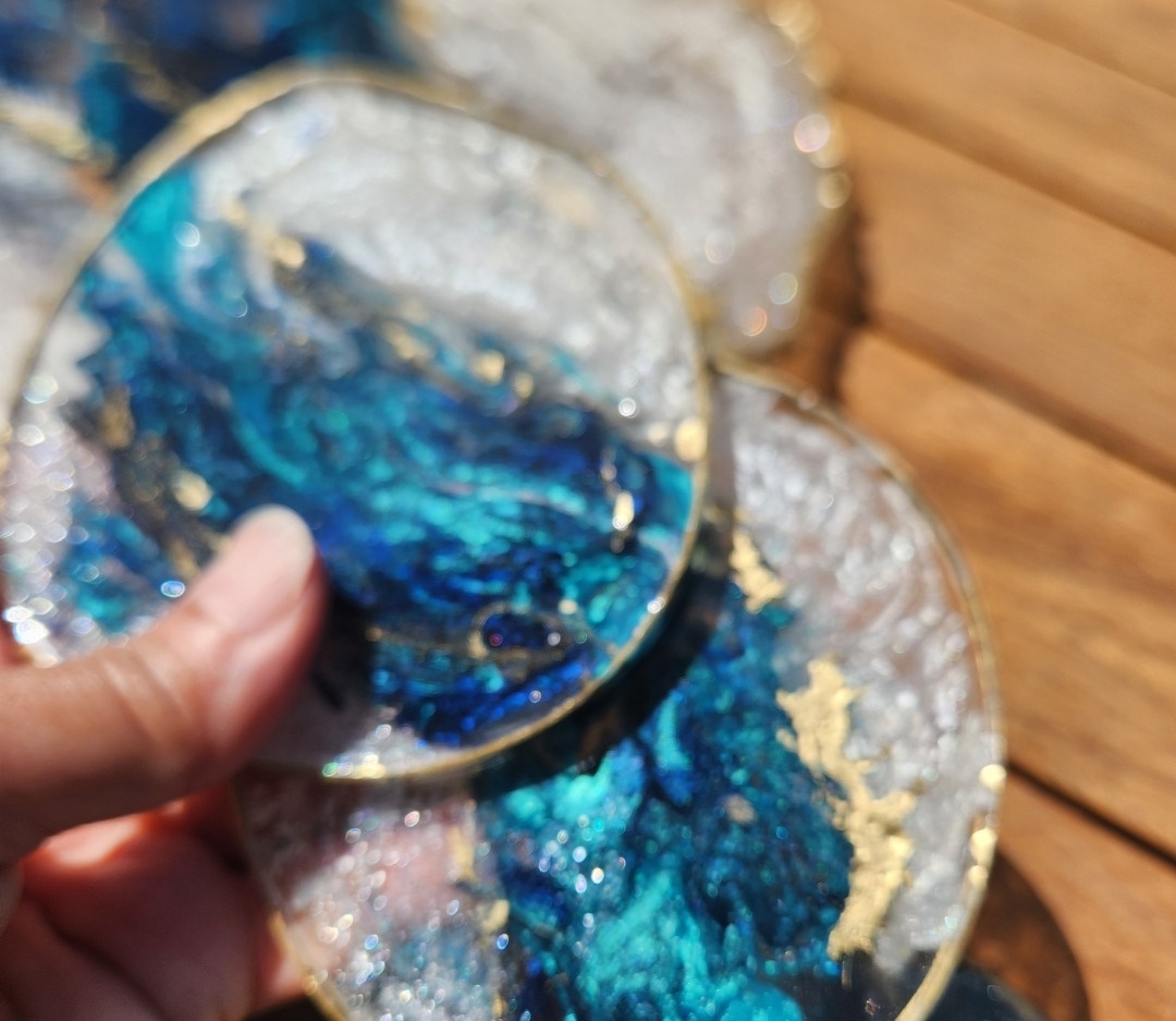 A set of 4 handcrafted resin coasters inspired by the rhythm of the ocean. Each piece reflects the swirling elegance of deep turquoise, sapphire, pearly whites, and golden shoreline edges—sealed in high-gloss for a luxurious glass-like finish.