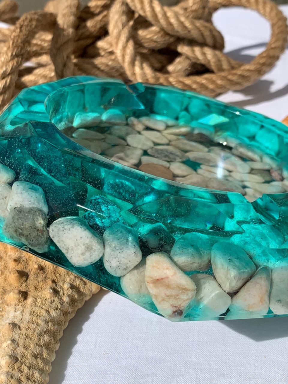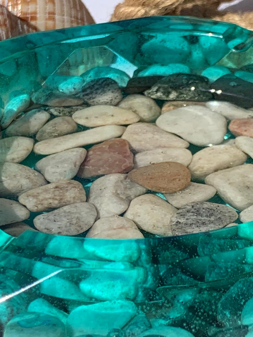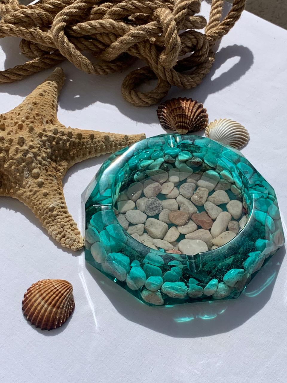 Artistic Details: The base of the ashtray is embedded with a collection of smooth river stones and pebbles, which are visible through the resin to create a “pond-bottom” effect.