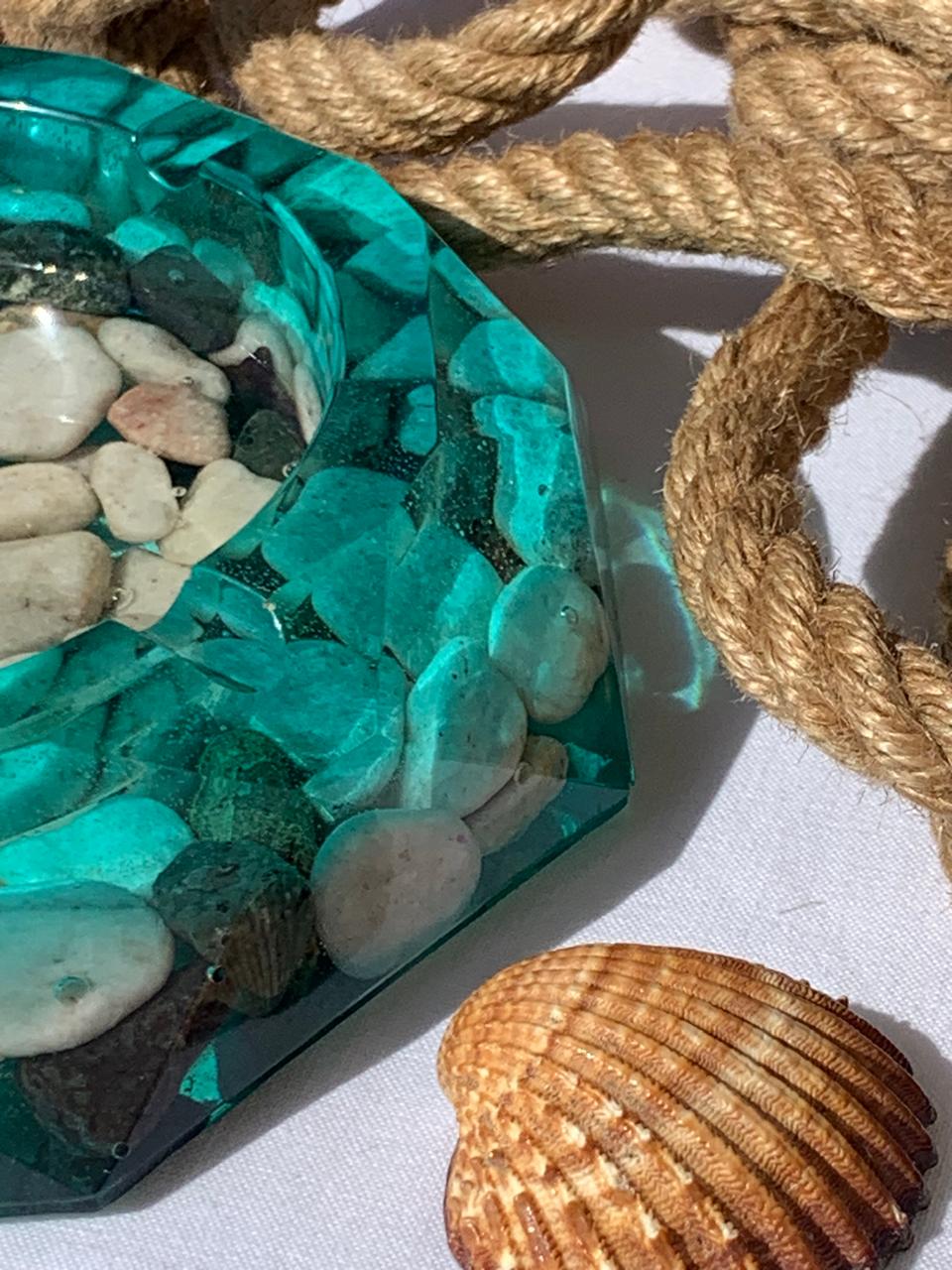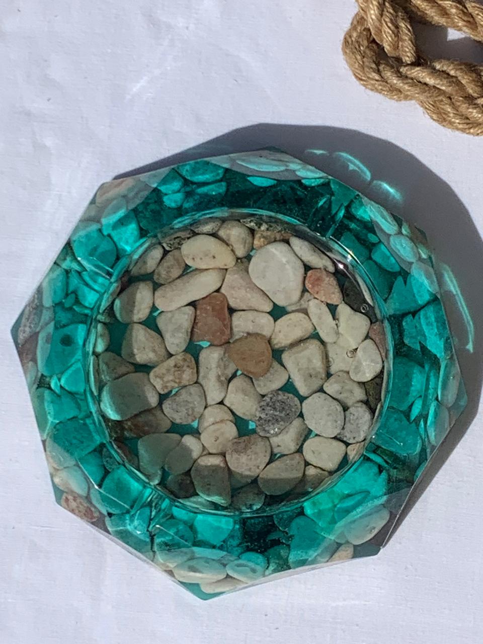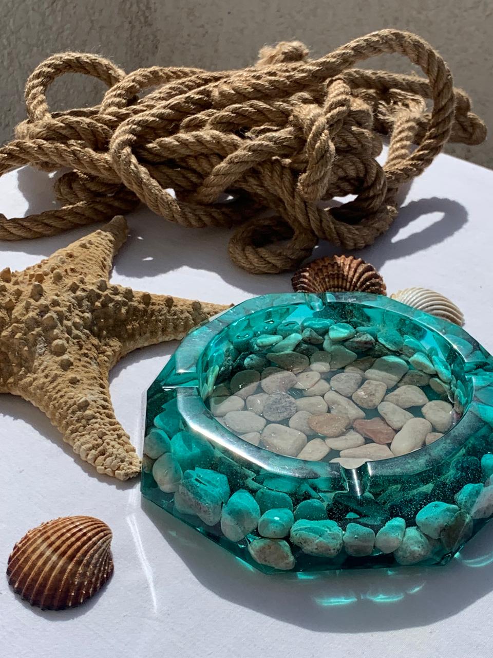 Artistic Details: The base of the ashtray is embedded with a collection of smooth river stones and pebbles, which are visible through the resin to create a “pond-bottom” effect.