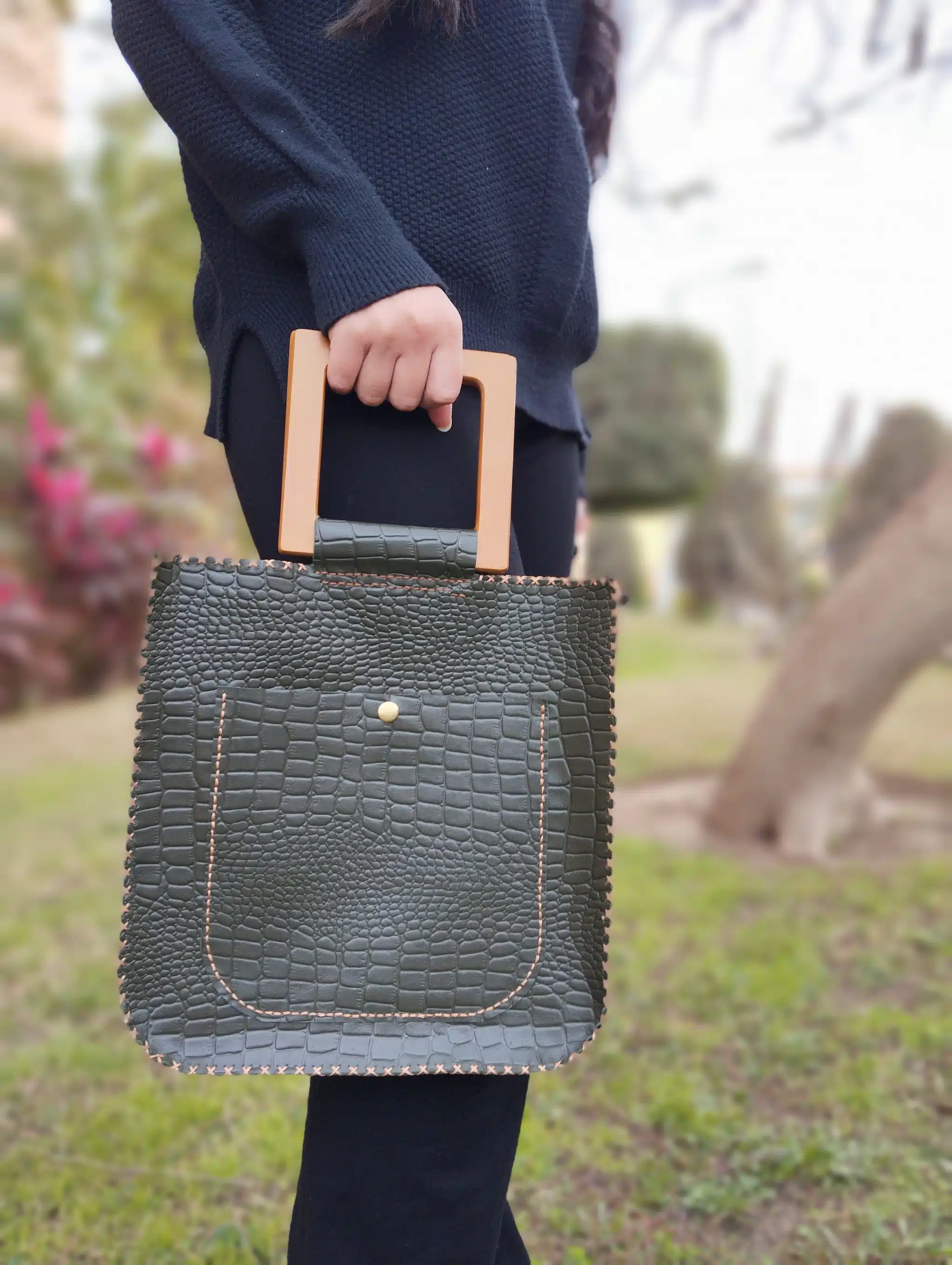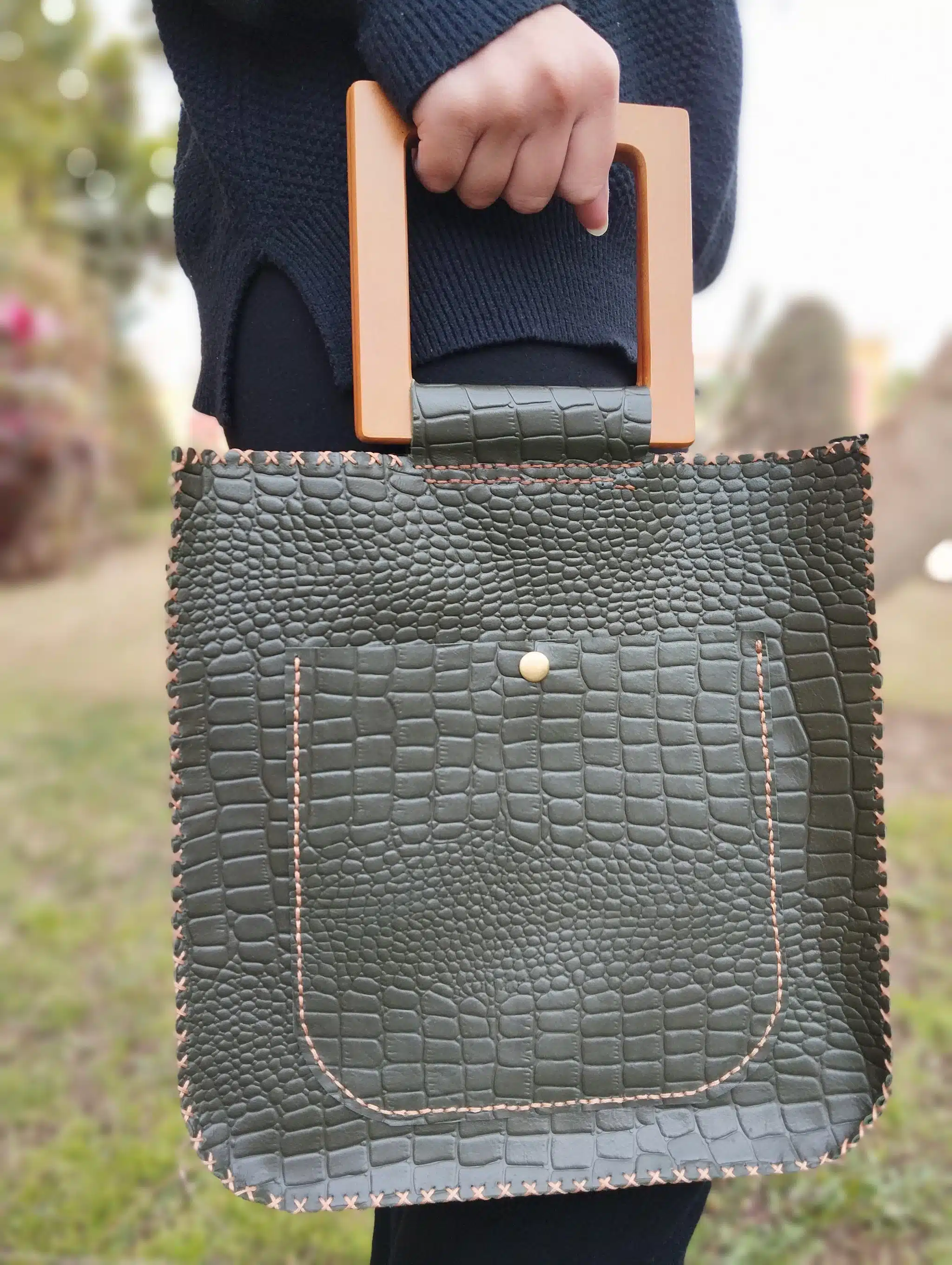 شنطه هاند ميد جلد طبيعي واليد خشب
