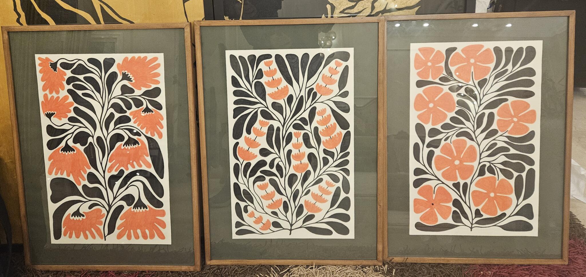 Olive Bloom set of 3 acrylic painting in brown natural wood and glass frames 50*70cm each.