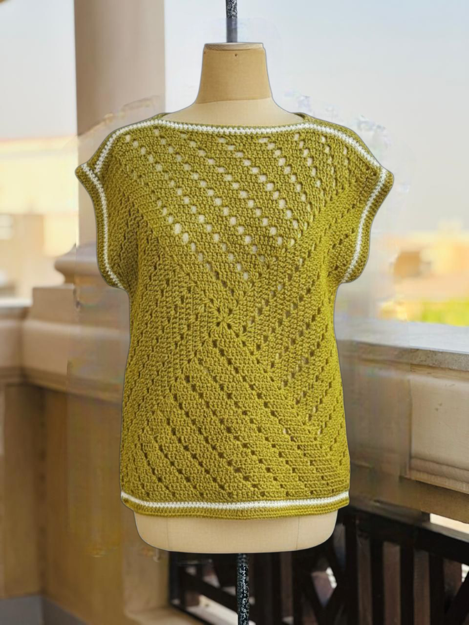 A stylish, lightweight olive green crochet vest featuring diagonal textured stitches and airy eyelet details. Finished with clean white edging . Perfect for layering and adding a chic handmade touch to any outfit.