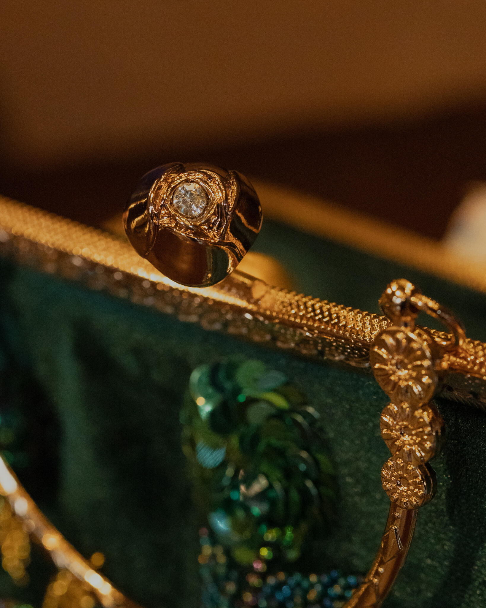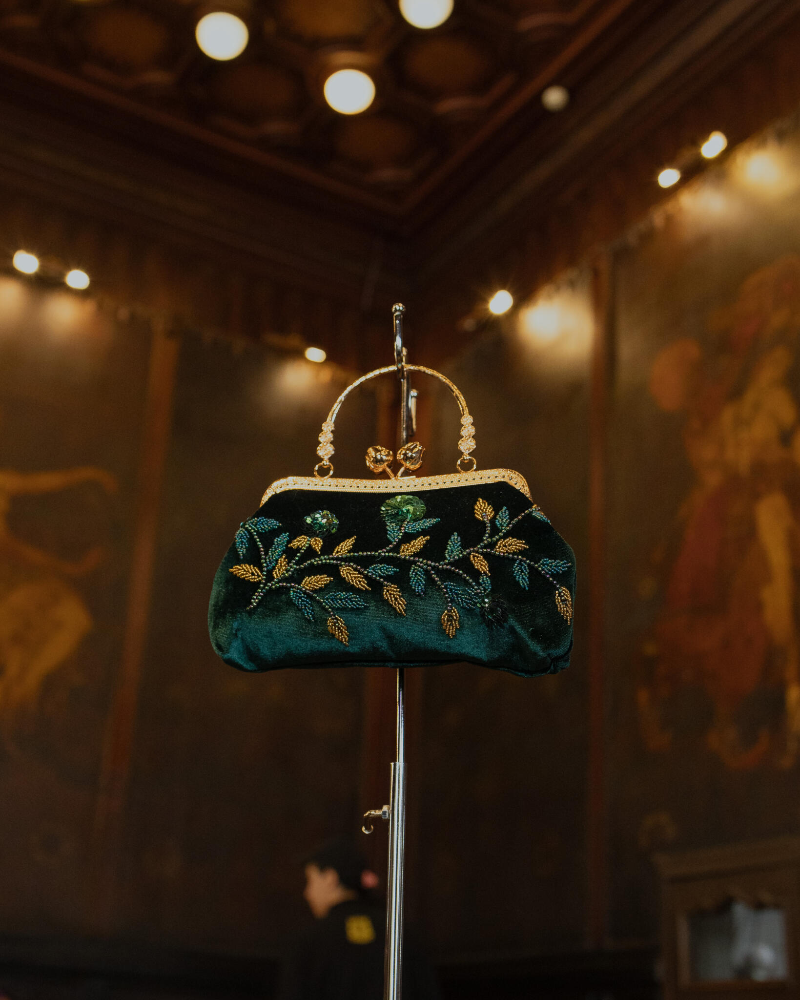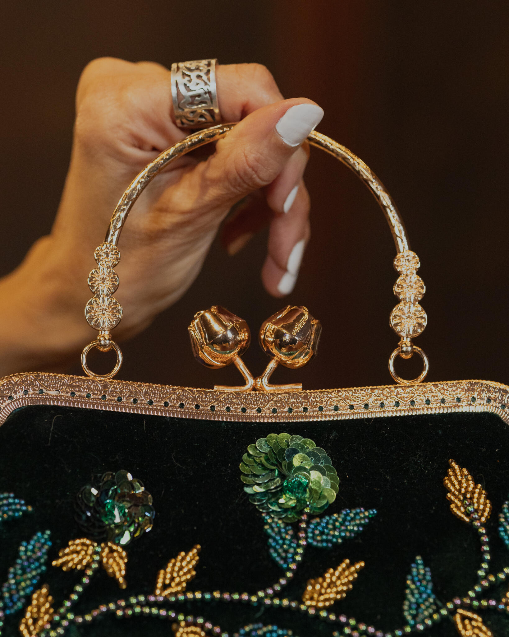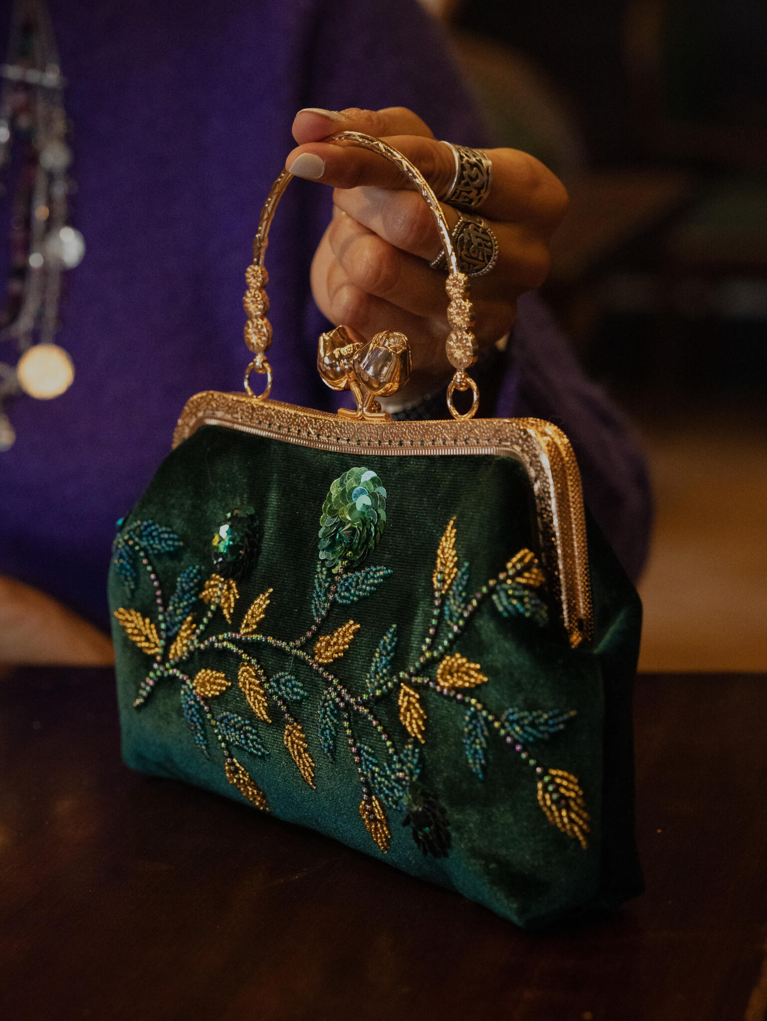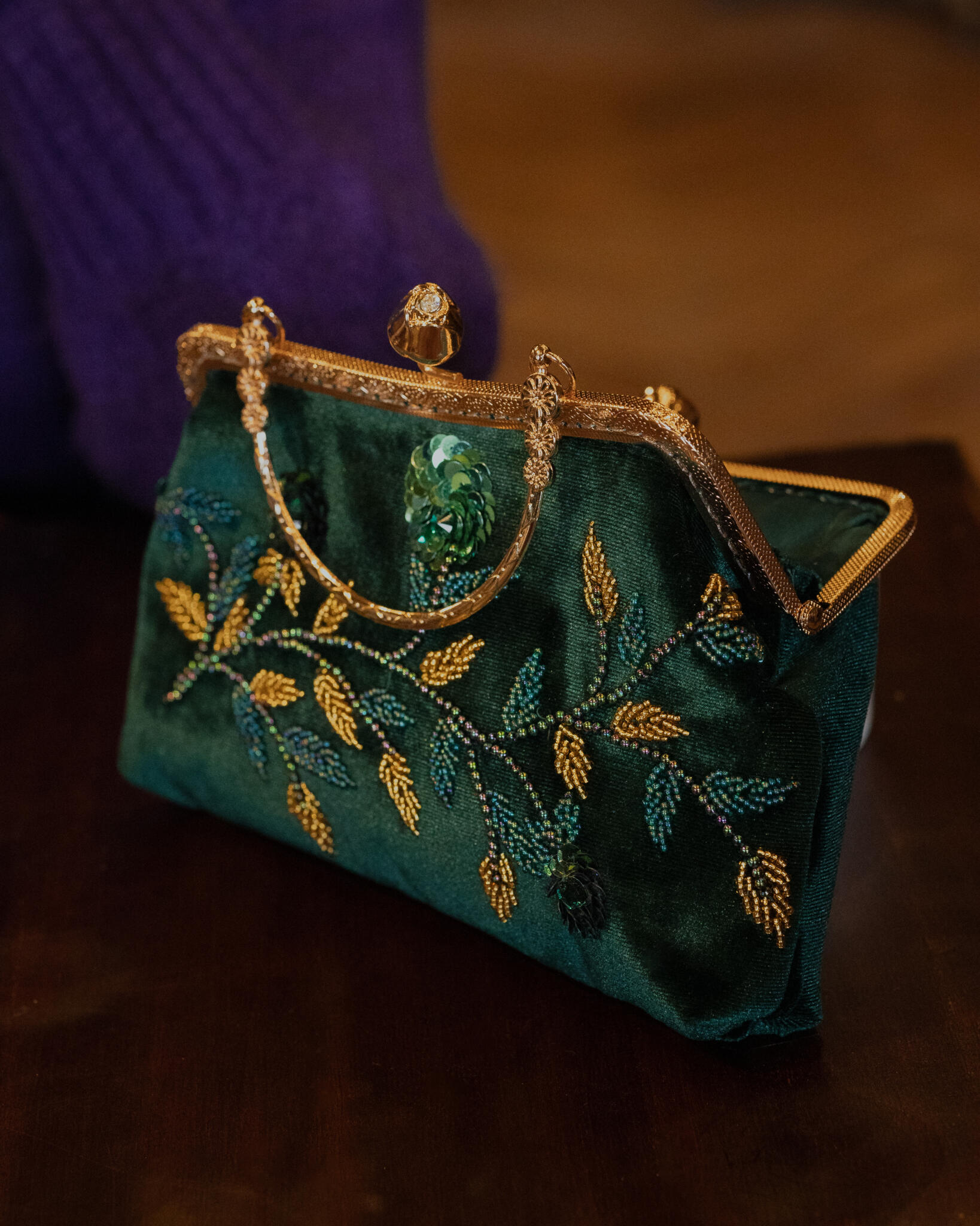 Olive green velvet bag embroidered with beads and sequins, lined inside with satin, featuring a gold metal frame and a small handle.