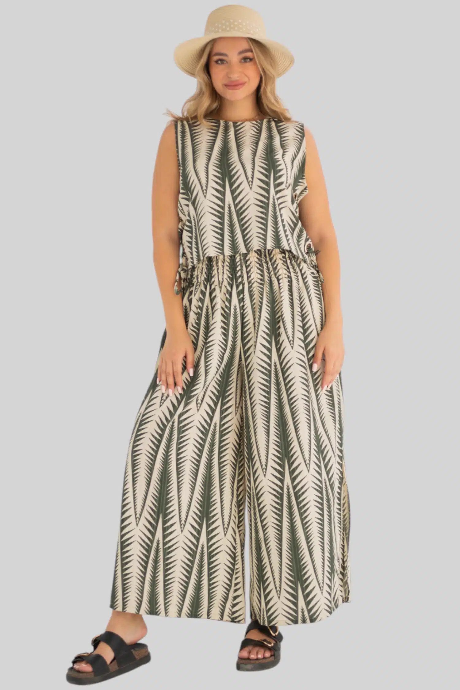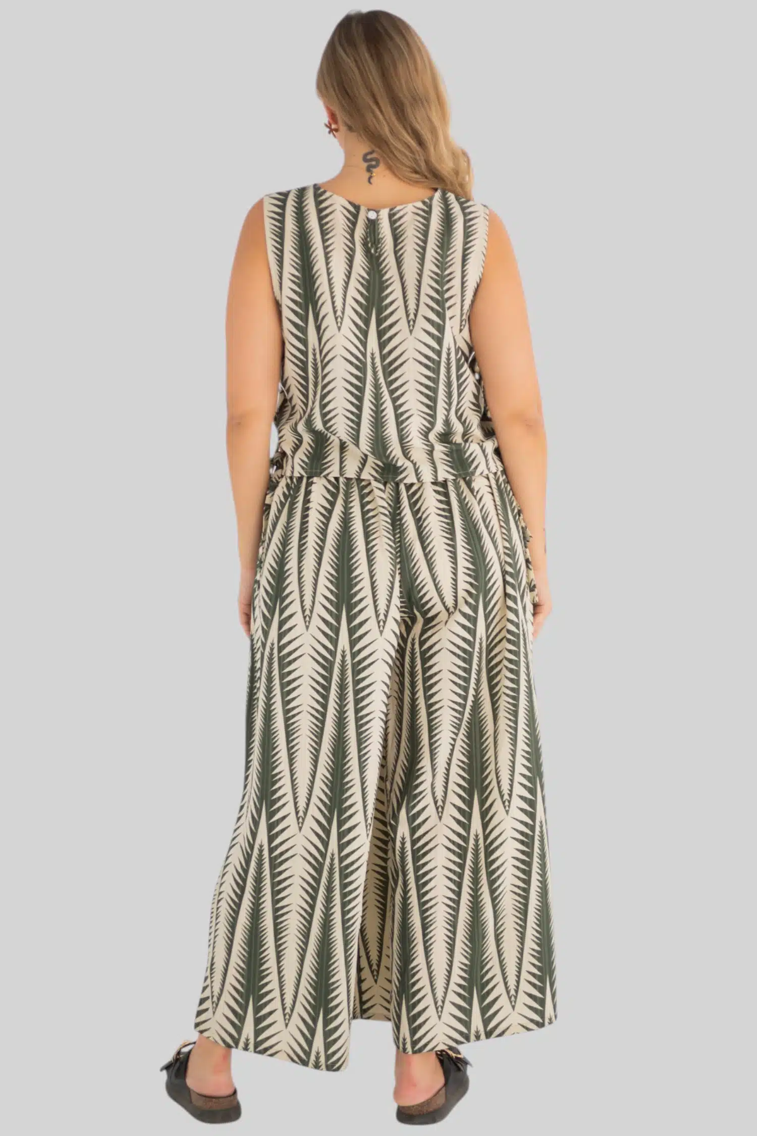 top with Metal rings and pants with elastic waist and side open