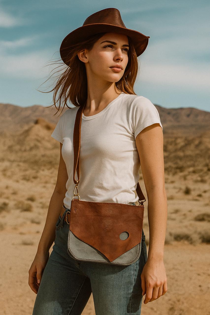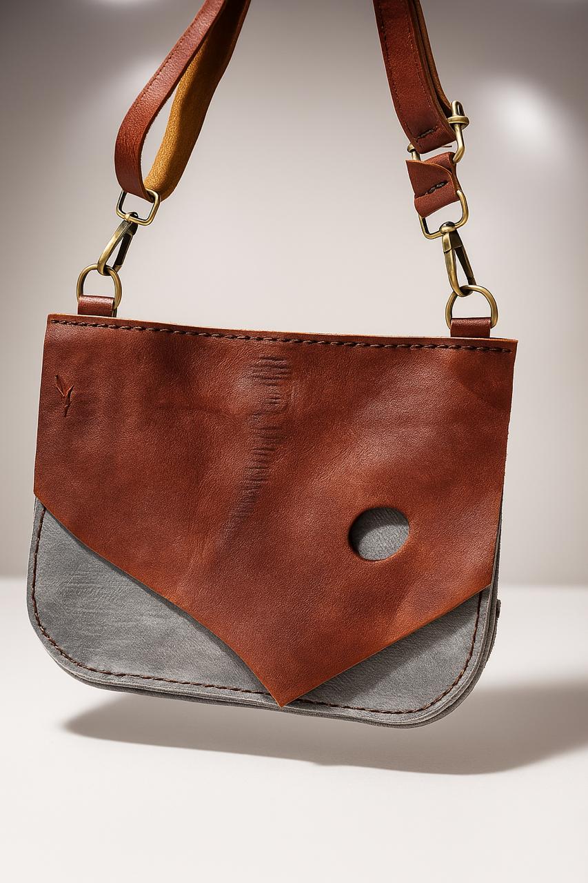 A random shape flap, genuine leather, purely handmade, adjustable strap