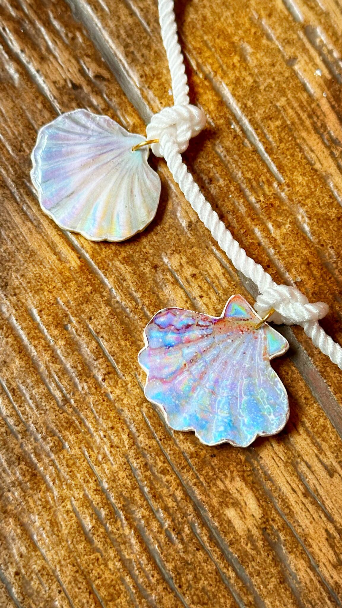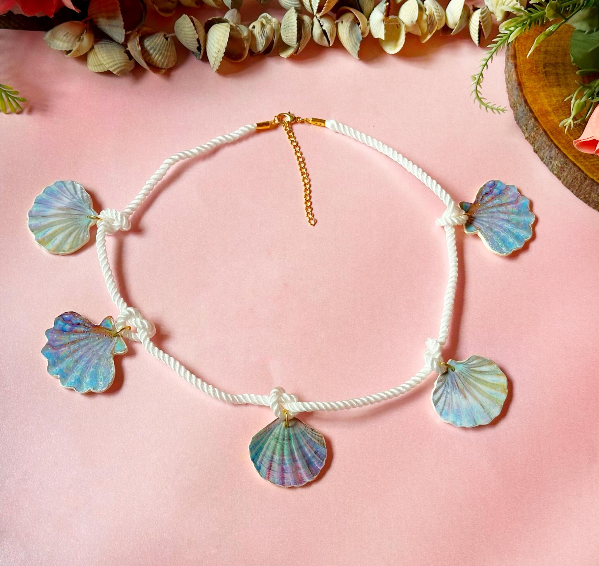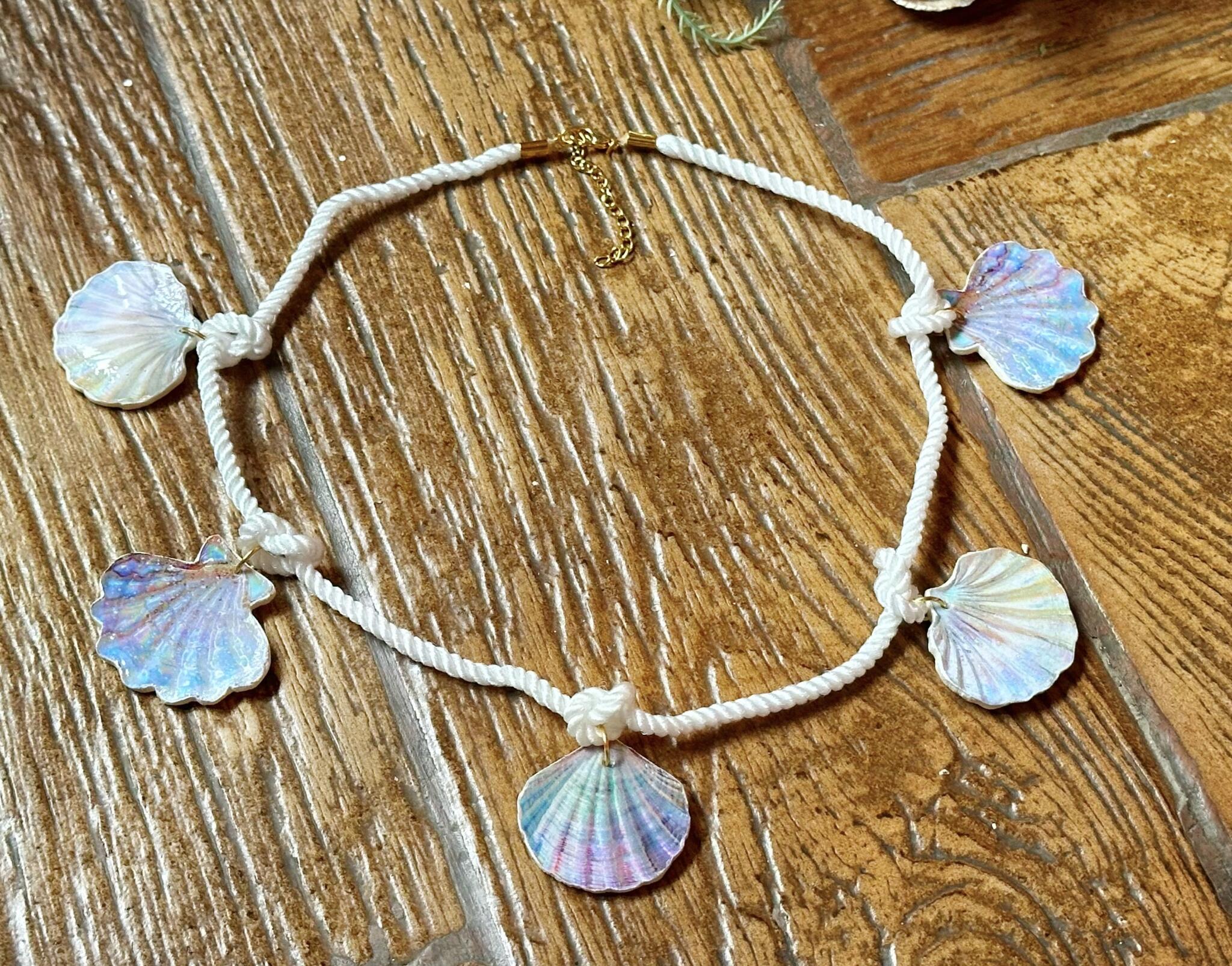 Bohostyle choker with shiny handmade charms in opalescent shades, a unique statement piece that brings ocean vibes to any look.