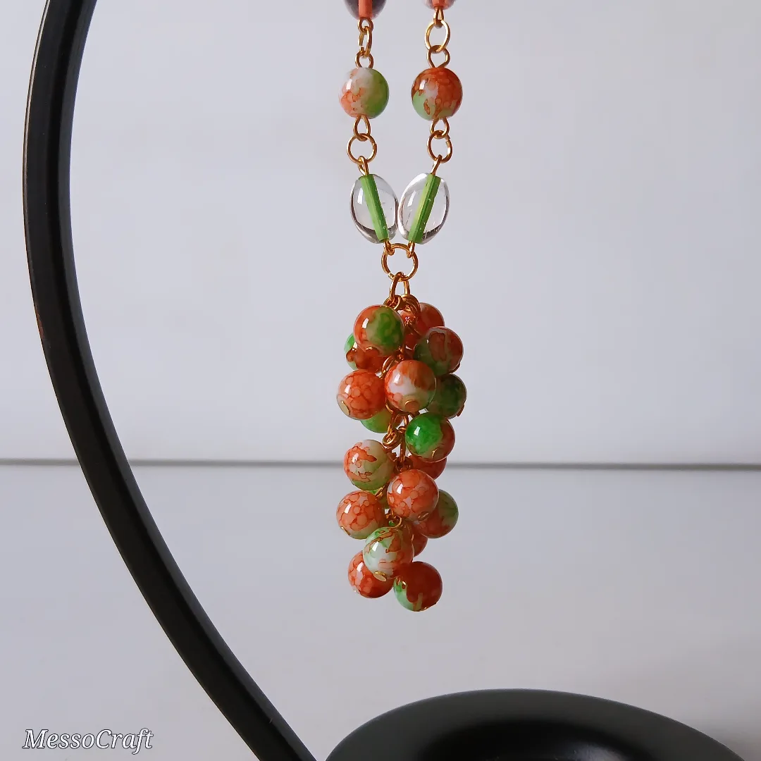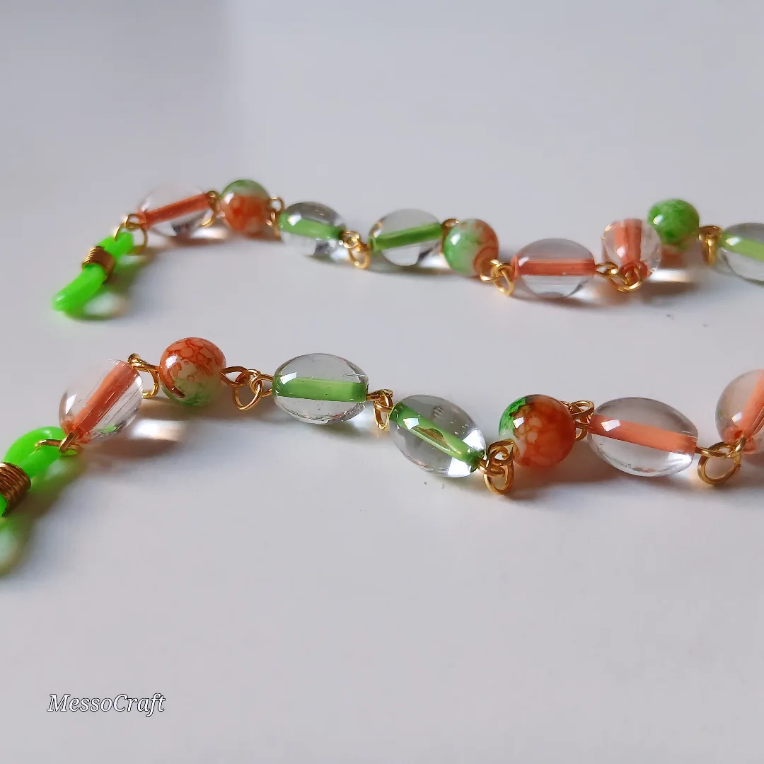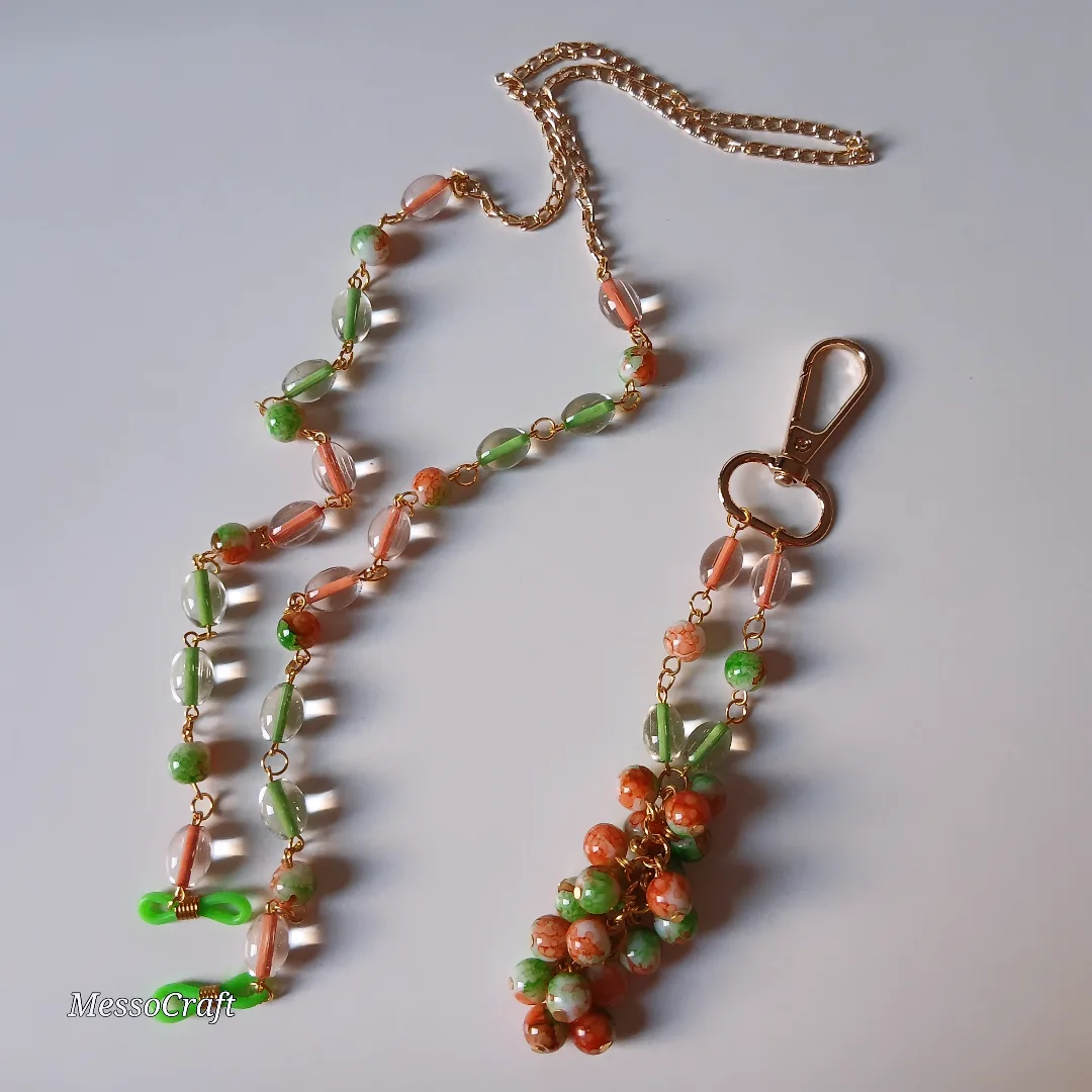 A set of 2 pcs. glasses Chain and bag charm made of green and orange alabaster and opal beads and Chinese gold chain