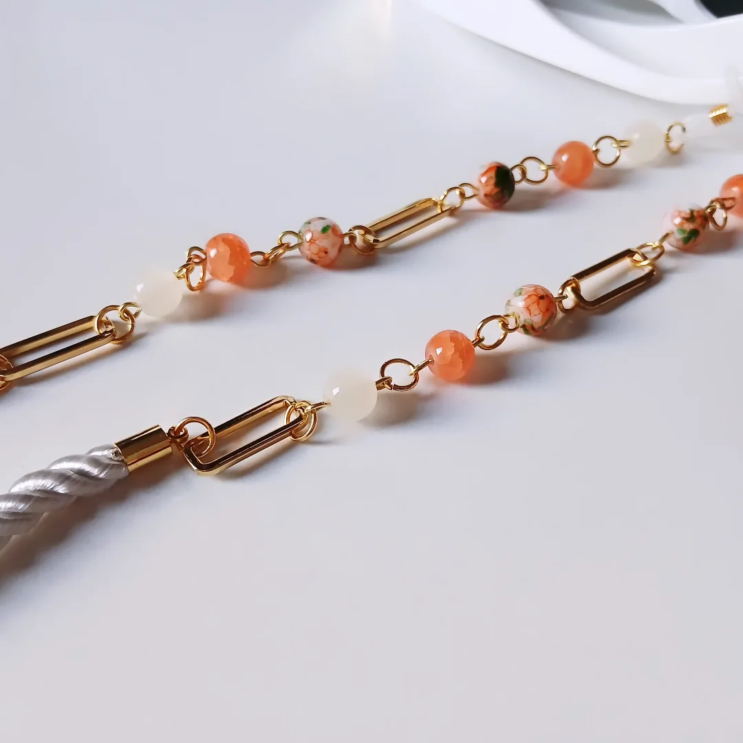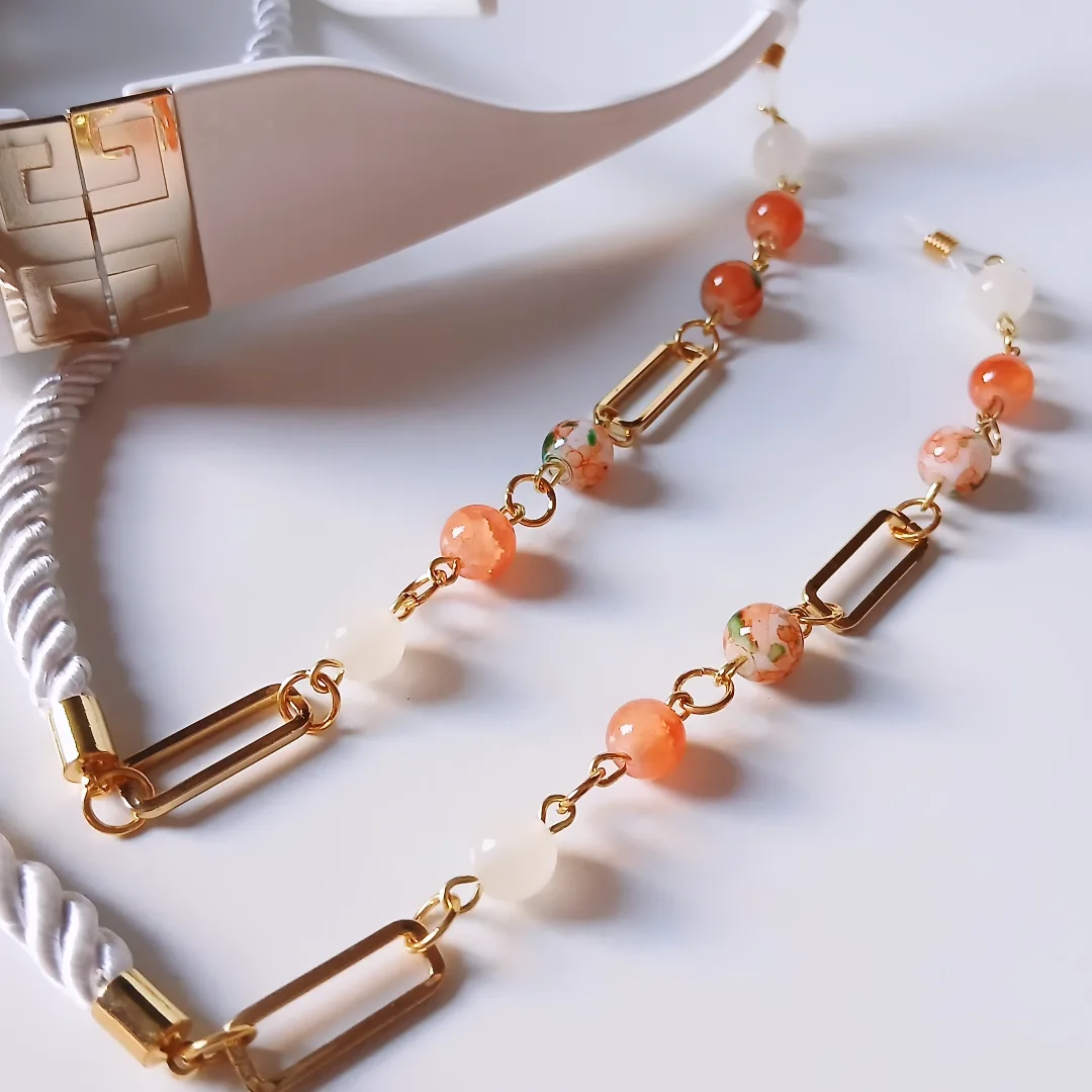 Glasses chain made of alabaster stones in orange and emerald green with a white cordon