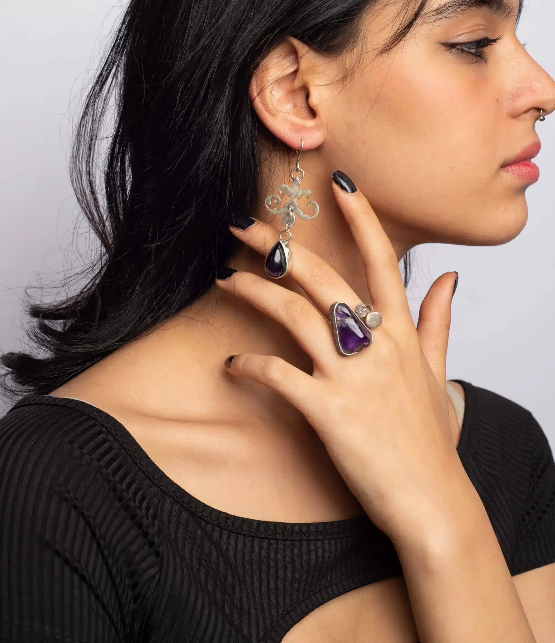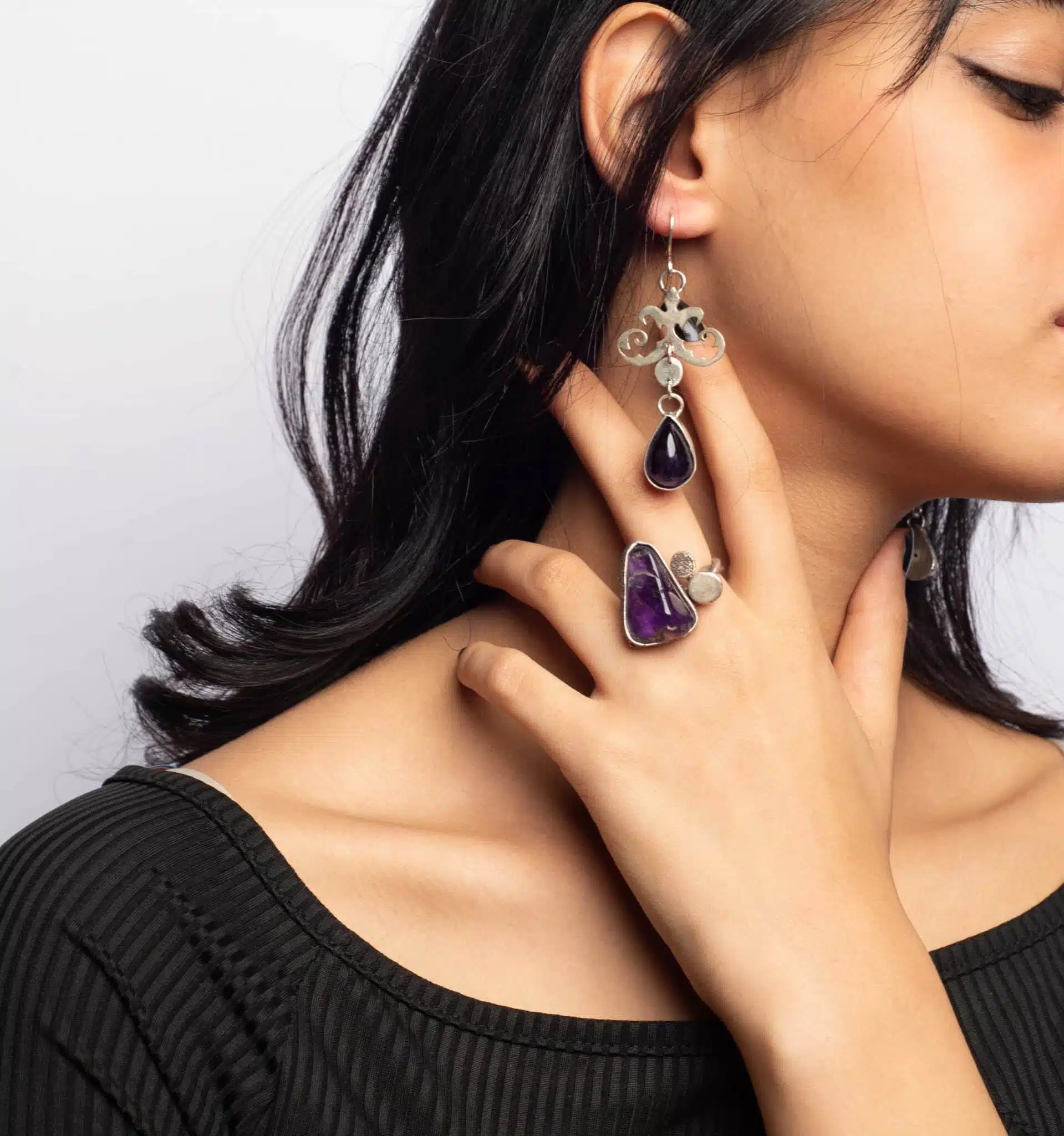 Boho sterling silver earring with amethyst teardrop stone.