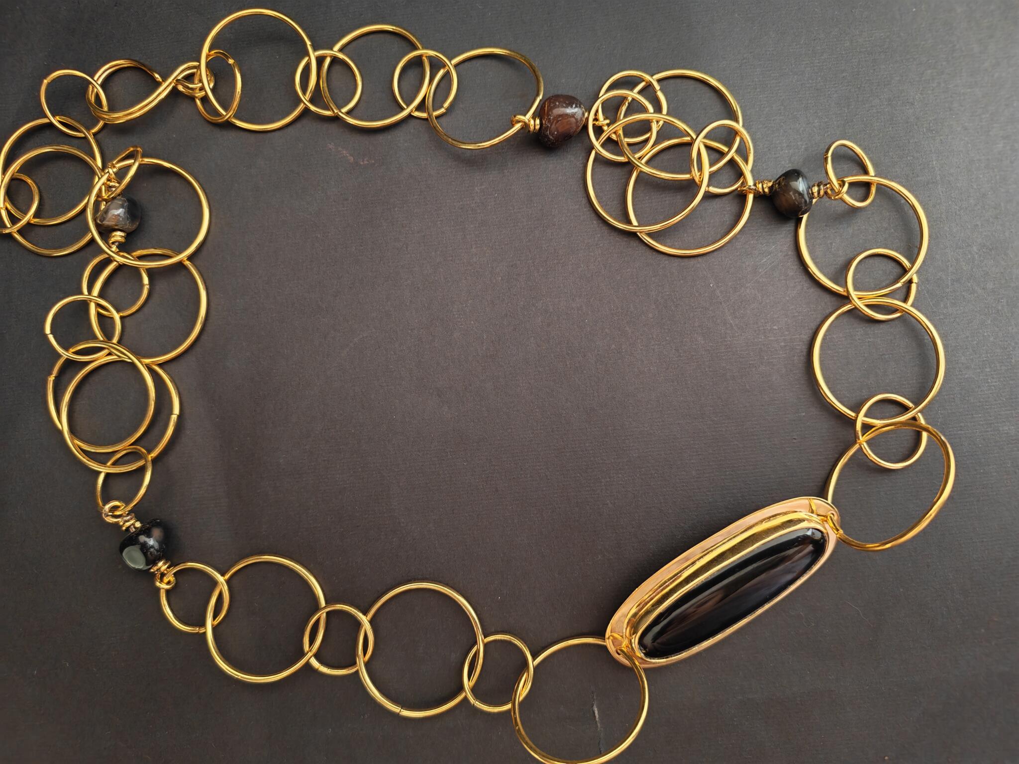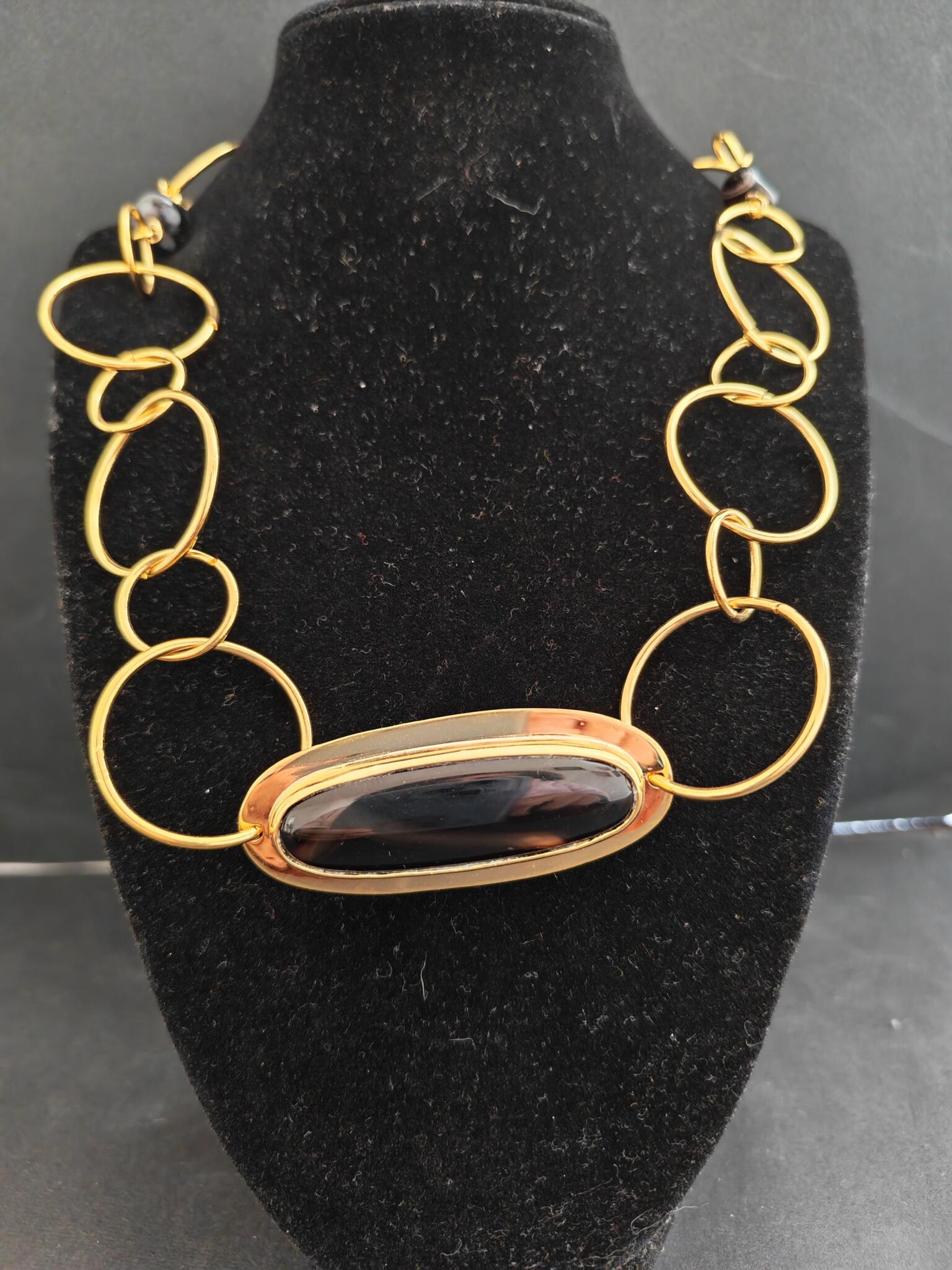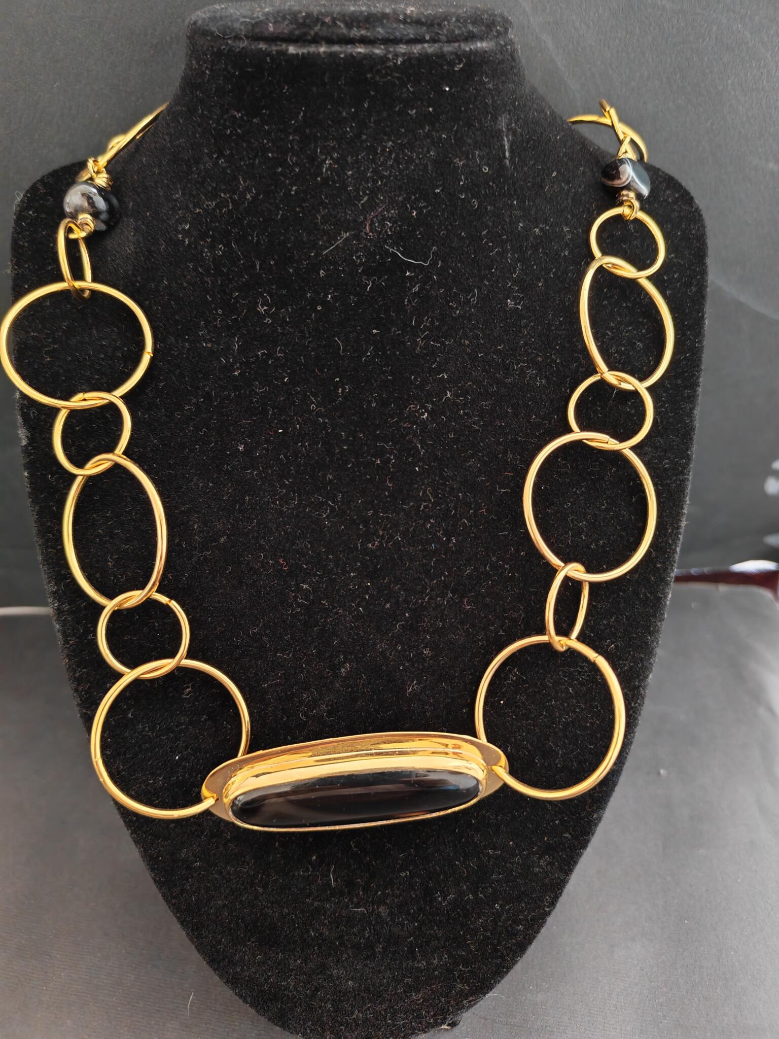 Long gold plated circles necklace with long oval onyx stone.