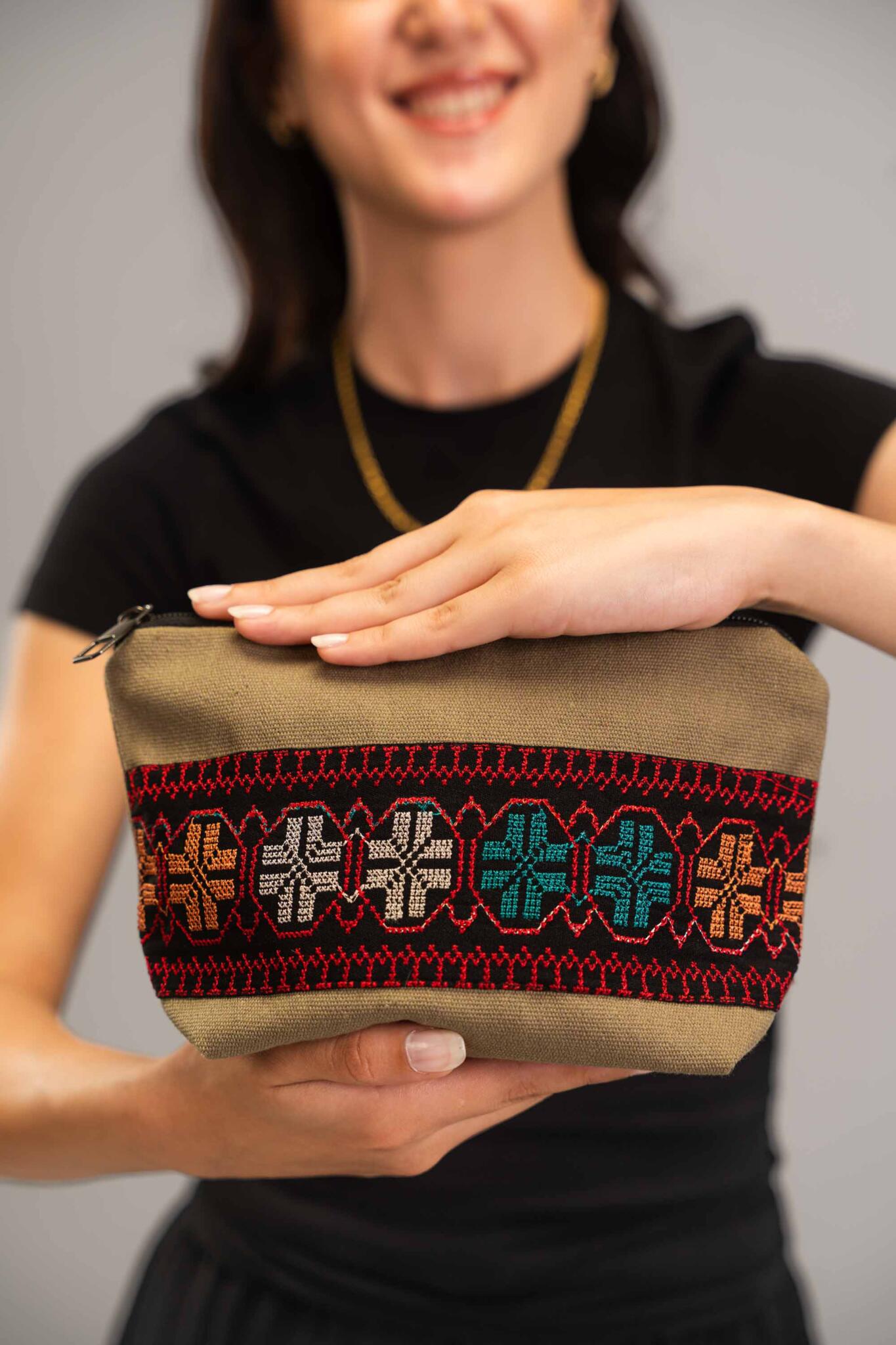 This beautifully crafted pouch is made from high-quality Egyptian Cotton Dak in a rich olive green tone. A 7 cm etamine embroidery strip, stitched across the center in vibrant blue and multicolor patterns, adds a bold artistic accent inspired by heritage motifs.