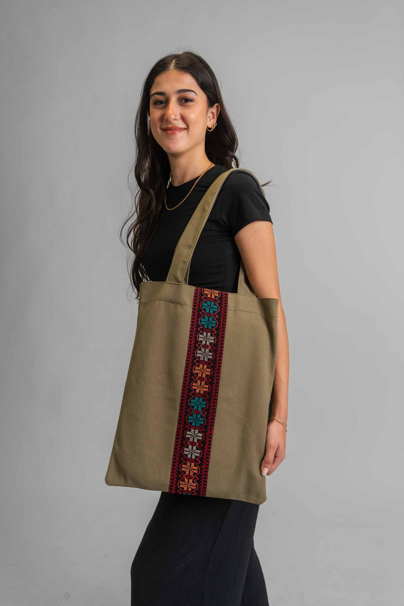 Crafted from high-quality Egyptian Cotton (Dak) in a sleek olive green, this tote blends timeless design with functional elegance. A bold vertical etamine strip, stitched along the center front, adds a vibrant cultural touch that turns heads while honoring tradition.